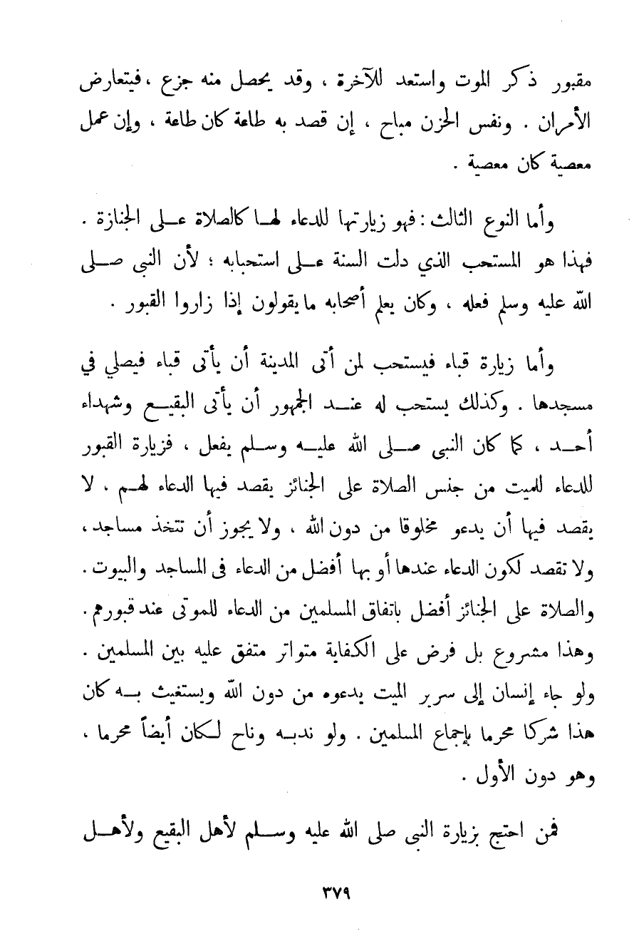 مَقْبُورٌ ذَكَرَ الْمَوْتَ وَاسْتَعَدَّ لِلْآخِرَةِ وَقَدْ يَحْصُلُ مِنْهُ جَزَعٌ فَيَتَعَارَضُ الْأَمْرَانِ. وَنَفْسُ الْحُزْنِ مُبَاحٌ إنْ قَصَدَ بِهِ طَاعَةً كَانَ طَاعَةً وَإِنْ عَمِلَ مَعْصِيَةً كَانَ مَعْصِيَةً. وَأَمَّا النَّوْعُ الثَّالِثُ: فَهُوَ زِيَارَتُهَا لِلدُّعَاءِ لَهَا كَالصَّلَاةِ عَلَى الْجِنَازَةِ. فَهَذَا هُوَ الْمُسْتَحَبُّ الَّذِي دَلَّتْ السُّنَّةُ عَلَى اسْتِحْبَابِهِ؛ لِأَنَّ النَّبِيَّ صَلَّى اللَّهُ عَلَيْهِ وَسَلَّمَ فَعَلَهُ وَكَانَ يُعَلِّمُ أَصْحَابَهُ مَا يَقُولُونَ إذَا زَارُوا الْقُبُورَ. وَأَمَّا زِيَارَةُ قُبَاء فَيُسْتَحَبُّ لِمَنْ أَتَى الْمَدِينَةَ أَنْ يَأْتِيَ قُبَاء فَيُصَلِّيَ فِي مَسْجِدِهَا. وَكَذَلِكَ يُسْتَحَبُّ لَهُ عِنْدَ الْجُمْهُورِ أَنْ يَأْتِيَ الْبَقِيعَ وَشُهَدَاءَ أُحُدٍ كَمَا كَانَ النَّبِيُّ صَلَّى اللَّهُ عَلَيْهِ وَسَلَّمَ يَفْعَلُ فَزِيَارَةُ الْقُبُورِ لِلدُّعَاءِ لِلْمَيِّتِ مِنْ جِنْسِ الصَّلَاةِ عَلَى الْجَنَائِزِ يُقْصَدُ فِيهَا الدُّعَاءُ لَهُمْ لَا يُقْصَدُ فِيهَا أَنْ يَدْعُوَ مَخْلُوقًا مِنْ دُونِ اللَّهِ وَلَا يَجُوزَ أَنْ تُتَّخَذَ مَسَاجِدَ وَلَا تُقْصَدُ لِكَوْنِ الدُّعَاءِ عِنْدَهَا أَوْ بِهَا أَفْضَلَ مِنْ الدُّعَاءِ فِي الْمَسَاجِدِ وَالْبُيُوتِ. وَالصَّلَاةُ عَلَى الْجَنَائِزِ أَفْضَلُ بِاتِّفَاقِ الْمُسْلِمِينَ مِنْ الدُّعَاءِ لِلْمَوْتَى عِنْدَ قُبُورِهِمْ. وَهَذَا مَشْرُوعٌ بَلْ فَرْضٌ عَلَى الْكِفَايَةِ مُتَوَاتِرٌ مُتَّفَقٌ عَلَيْهِ بَيْنَ الْمُسْلِمِينَ. وَلَوْ جَاءَ إنْسَانٌ إلَى سَرِيرِ الْمَيِّتِ يَدْعُوهُ مِنْ دُونِ اللَّهِ وَيَسْتَغِيثُ بِهِ كَانَ هَذَا شِرْكًا مُحَرَّمًا بِإِجْمَاعِ الْمُسْلِمِينَ. وَلَوْ نَدَبَهُ وَنَاحَ لَكَانَ أَيْضًا مُحَرَّمًا وَهُوَ دُونُ الْأَوَّلِ. فَمَنْ احْتَجَّ بِزِيَارَةِ النَّبِيِّ صَلَّى اللَّهُ عَلَيْهِ وَسَلَّمَ لِأَهْلِ الْبَقِيعِ وَلِأَهْلِ