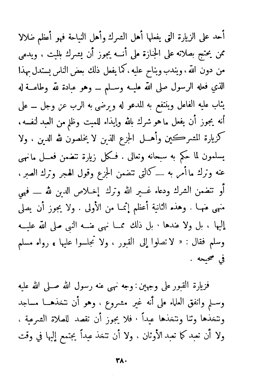 أُحُدٍ عَلَى الزِّيَارَةِ الَّتِي يَفْعَلُهَا أَهْلُ الشِّرْكِ وَأَهْلُ النِّيَاحَةِ فَهُوَ أَعْظَمُ ضَلَالًا مِمَّنْ يَحْتَجُّ بِصَلَاتِهِ عَلَى الْجِنَازَةِ عَلَى أَنَّهُ يَجُوزُ أَنْ يُشْرَكَ بِالْمَيِّتِ وَيُدْعَى مِنْ دُونِ اللَّهِ وَيُنْدَبَ وَيُنَاحَ عَلَيْهِ كَمَا يَفْعَلُ ذَلِكَ بَعْضُ النَّاسِ يَسْتَدِلُّ بِهَذَا الَّذِي فَعَلَهُ الرَّسُولُ صَلَّى اللَّهُ عَلَيْهِ وَسَلَّمَ - وَهُوَ عِبَادَةٌ لِلَّهِ وَطَاعَةٌ لَهُ يُثَابُ عَلَيْهِ الْفَاعِلُ وَيَنْتَفِعُ بِهِ الْمَدْعُوُّ لَهُ وَيَرْضَى بِهِ الرَّبُّ عَزَّ وَجَلَّ - عَلَى أَنَّهُ يَجُوزُ أَنْ يُفْعَلَ مَا هُوَ شِرْكٌ بِاَللَّهِ وَإِيذَاءٌ لِلْمَيِّتِ وَظُلْمٌ مِنْ الْعَبْدِ لِنَفْسِهِ كَزِيَارَةِ الْمُشْرِكِينَ وَأَهْلِ الْجَزَعِ الَّذِينَ لَا يُخْلِصُونَ لِلَّهِ الدِّينَ وَلَا يُسَلِّمُونَ لِمَا حَكَمَ بِهِ سُبْحَانَهُ وَتَعَالَى. فَكُلُّ زِيَارَةٍ تَتَضَمَّنُ فِعْلَ مَا نَهَى عَنْهُ وَتَرْكَ مَا أَمَرَ بِهِ - كَاَلَّتِي تَتَضَمَّنُ الْجَزَعَ وَقَوْلَ الْهُجْرِ وَتَرْكَ الصَّبْرِ أَوْ تَتَضَمَّنُ الشِّرْكَ وَدُعَاءَ غَيْرِ اللَّهِ وَتَرْكَ إخْلَاصِ الدِّينِ لِلَّهِ - فَهِيَ مَنْهِيٌّ عَنْهَا. وَهَذِهِ الثَّانِيَةُ أَعْظَمُ إثْمًا مِنْ الْأُولَى. وَلَا يَجُوزُ أَنْ يُصَلَّى إلَيْهَا بَلْ وَلَا عِنْدَهَا بَلْ ذَلِكَ مِمَّا نَهَى عَنْهُ النَّبِيُّ صَلَّى اللَّهُ عَلَيْهِ وَسَلَّمَ فَقَالَ: {لَا تُصَلُّوا إلَى الْقُبُورِ وَلَا تَجْلِسُوا عَلَيْهَا} رَوَاهُ مُسْلِمٌ فِي صَحِيحِهِ. فَزِيَارَةُ الْقُبُورِ عَلَى وَجْهَيْنِ: وَجْهٌ نَهَى عَنْهُ رَسُولُ اللَّهِ صَلَّى اللَّهُ عَلَيْهِ وَسَلَّمَ وَاتَّفَقَ الْعُلَمَاءُ عَلَى أَنَّهُ غَيْرُ مَشْرُوعٍ وَهُوَ أَنْ نَتَّخِذَهَا مَسَاجِدَ وَنَتَّخِذَهَا وَثَنًا وَنَتَّخِذَهَا عِيدًا فَلَا يَجُوزُ أَنْ تُقْصَدَ لِلصَّلَاةِ الشَّرْعِيَّةِ وَلَا أَنْ تُعْبَدَ كَمَا تُعْبَدُ الْأَوْثَانُ وَلَا أَنْ تُتَّخَذَ عِيدًا يُجْتَمَعُ إلَيْهَا فِي وَقْتٍ