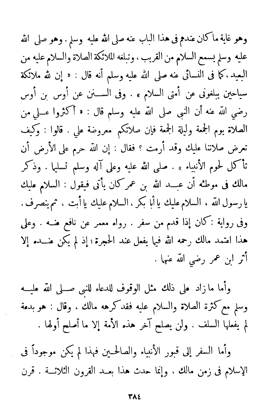 وَهُوَ غَايَةُ مَا كَانَ عِنْدَهُمْ فِي هَذَا الْبَابِ عَنْهُ صَلَّى اللَّهُ عَلَيْهِ وَسَلَّمَ وَهُوَ صَلَّى اللَّهُ عَلَيْهِ وَسَلَّمَ يَسْمَعُ السَّلَامَ مِنْ الْقَرِيبِ وَتُبَلِّغُهُ الْمَلَائِكَةُ الصَّلَاةَ وَالسَّلَامَ عَلَيْهِ مِنْ الْبَعِيدِ كَمَا فِي النَّسَائِي عَنْهُ صَلَّى اللَّهُ عَلَيْهِ وَسَلَّمَ أَنَّهُ قَالَ: {إنَّ لِلَّهِ مَلَائِكَةً سَيَّاحِينَ يُبَلِّغُونِي عَنْ أُمَّتِي السَّلَامَ} . وَفِي السُّنَنِ عَنْ أَوْسِ بْنِ أَوْسٍ رَضِيَ اللَّهُ عَنْهُ أَنَّ النَّبِيَّ صَلَّى اللَّهُ عَلَيْهِ وَسَلَّمَ قَالَ: {أَكْثِرُوا عَلَيَّ مِنْ الصَّلَاةِ يَوْمَ الْجُمْعَةِ وَلَيْلَةَ الْجُمُعَةِ فَإِنَّ صَلَاتَكُمْ مَعْرُوضَةٌ عَلَيَّ. قَالُوا: وَكَيْفَ تُعْرَضُ صَلَاتُنَا عَلَيْك وَقَدْ أَرَمْت؟ فَقَالَ: إنَّ اللَّهَ حَرَّمَ عَلَى الْأَرْضِ أَنْ تَأْكُلَ لُحُومَ الْأَنْبِيَاءِ} . صَلَّى اللَّهُ عَلَيْهِ وَعَلَى آلِهِ وَسَلَّمَ تَسْلِيمًا. وَذَكَرَ مَالِكٌ فِي مُوَطَّئِهِ أَنَّ عَبْدَ اللَّهِ بْنَ عُمَرَ كَانَ يَأْتِي فَيَقُولُ: السَّلَامُ عَلَيْك يَا رَسُولَ اللَّهِ السَّلَامُ عَلَيْك يَا أَبَا بَكْرٍ السَّلَامُ عَلَيْك يَا أَبَتْ ثُمَّ يَنْصَرِفُ. وَفِي رِوَايَةٍ: كَانَ إذَا قَدِمَ مِنْ سَفَرٍ. رَوَاهُ مَعْمَرٌ عَنْ نَافِعٍ عَنْهُ. وَعَلَى هَذَا اعْتَمَدَ مَالِكٌ رَحِمَهُ اللَّهُ فِيمَا يُفْعَلُ عِنْدَ الْحُجْرَةِ؛ إذْ لَمْ يَكُنْ عِنْدَهُ إلَّا أَثَرُ ابْنِ عُمَرَ رَضِيَ اللَّهُ عَنْهُمَا. وَأَمَّا مَا زَادَ عَلَى ذَلِكَ مِثْلُ الْوُقُوفِ لِلدُّعَاءِ لِلنَّبِيِّ صَلَّى اللَّهُ عَلَيْهِ وَسَلَّمَ مَعَ كَثْرَةِ الصَّلَاةِ وَالسَّلَامِ عَلَيْهِ فَقَدْ كَرِهَهُ مَالِكٌ وَقَالَ: هُوَ بِدْعَةٌ لَمْ يَفْعَلْهَا السَّلَفُ. وَلَنْ يُصْلِحُ آخِرَ هَذِهِ الْأُمَّةِ إلَّا مَا أَصْلَحَ أَوَّلَهَا. وَأَمَّا السَّفَرُ إلَى قُبُورِ الْأَنْبِيَاءِ وَالصَّالِحِينَ فَهَذَا لَمْ يَكُنْ مَوْجُودًا فِي الْإِسْلَامِ فِي زَمَنِ مَالِكٍ وَإِنَّمَا حَدَثَ هَذَا بَعْدَ الْقُرُونِ الثَّلَاثَةِ. قَرْنِ