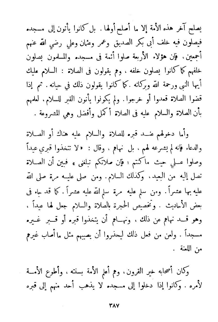يُصْلِحَ آخِرُ هَذِهِ الْأُمَّةِ إلَّا مَا أَصْلَحَ أَوَّلَهَا. بَلْ كَانُوا يَأْتُونَ إلَى مَسْجِدِهِ فَيُصَلُّونَ فِيهِ خَلْفَ أَبِي بَكْرٍ الصِّدِّيقِ وَعُمَرَ وَعُثْمَانَ وَعَلِيٍّ رَضِيَ اللَّهُ عَنْهُمْ أَجْمَعِينَ فَإِنَّ هَؤُلَاءِ الْأَرْبَعَةَ صَلَّوْا أَئِمَّةً فِي مَسْجِدِهِ وَالْمُسْلِمُونَ يُصَلُّونَ خَلْفَهُمْ كَمَا كَانُوا يُصَلُّونَ خَلْفَهُ وَهُمْ يَقُولُونَ فِي الصَّلَاةِ: السَّلَامُ عَلَيْك أَيُّهَا النَّبِيُّ وَرَحْمَةُ اللَّهِ وَبَرَكَاتُهُ. كَمَا كَانُوا يَقُولُونَ ذَلِكَ فِي حَيَاتِهِ. ثُمَّ إذَا قَضَوْا الصَّلَاةَ قَعَدُوا أَوْ خَرَجُوا. وَلَمْ يَكُونُوا يَأْتُونَ الْقَبْرَ لِلسَّلَامِ لِعِلْمِهِمْ بِأَنَّ الصَّلَاةَ وَالسَّلَامَ عَلَيْهِ فِي الصَّلَاةِ أَكْمَلُ وَأَفْضَلُ وَهِيَ الْمَشْرُوعَةُ. وَأَمَّا دُخُولُهُمْ عِنْدَ قَبْرِهِ لِلصَّلَاةِ وَالسَّلَامِ عَلَيْهِ هُنَاكَ أَوْ الصَّلَاةِ وَالدُّعَاءِ فَإِنَّهُ لَمْ يَشْرَعْهُ لَهُمْ بَلْ نَهَاهُمْ وَقَالَ: {لَا تَتَّخِذُوا قَبْرِي عِيدًا وَصَلُّوا عَلَيَّ حَيْثُ مَا كُنْتُمْ؛ فَإِنَّ صَلَاتَكُمْ تَبْلُغُنِي} فَبَيَّنَ أَنَّ الصَّلَاةَ تَصِلُ إلَيْهِ مِنْ الْبَعِيدِ وَكَذَلِكَ السَّلَامُ. وَمَنْ صَلَّى عَلَيْهِ مَرَّةً صَلَّى اللَّهُ عَلَيْهِ بِهَا عَشْرًا. وَمَنْ سَلَّمَ عَلَيْهِ مَرَّةً سَلَّمَ اللَّهُ عَلَيْهِ عَشْرًا. كَمَا قَدْ جَاءَ فِي بَعْضِ الْأَحَادِيثِ. وَتَخْصِيصُ الْحُجْرَةِ بِالصَّلَاةِ وَالسَّلَامِ جَعَلَ لَهَا عِيدًا وَهُوَ قَدْ نَهَاهُمْ عَنْ ذَلِكَ وَنَهَاهُمْ أَنْ يَتَّخِذُوا قَبْرَهُ أَوْ قَبْرَ غَيْرِهِ مَسْجِدًا. وَلَعَنَ مَنْ فَعَلَ ذَلِكَ لِيَحْذَرُوا أَنْ يُصِيبَهُمْ مِثْلُ مَا أَصَابَ غَيْرَهُمْ مِنْ اللَّعْنَةِ. وَكَانَ أَصْحَابُهُ خَيْرُ الْقُرُونِ وَهُمْ أَعْلَمُ الْأُمَّةِ بِسُنَّتِهِ وَأَطْوَعُ الْأُمَّةِ لِأَمْرِهِ. وَكَانُوا إذَا دَخَلُوا إلَى مَسْجِدِهِ لَا يَذْهَبُ أَحَدٌ مِنْهُمْ إلَى قَبْرِهِ