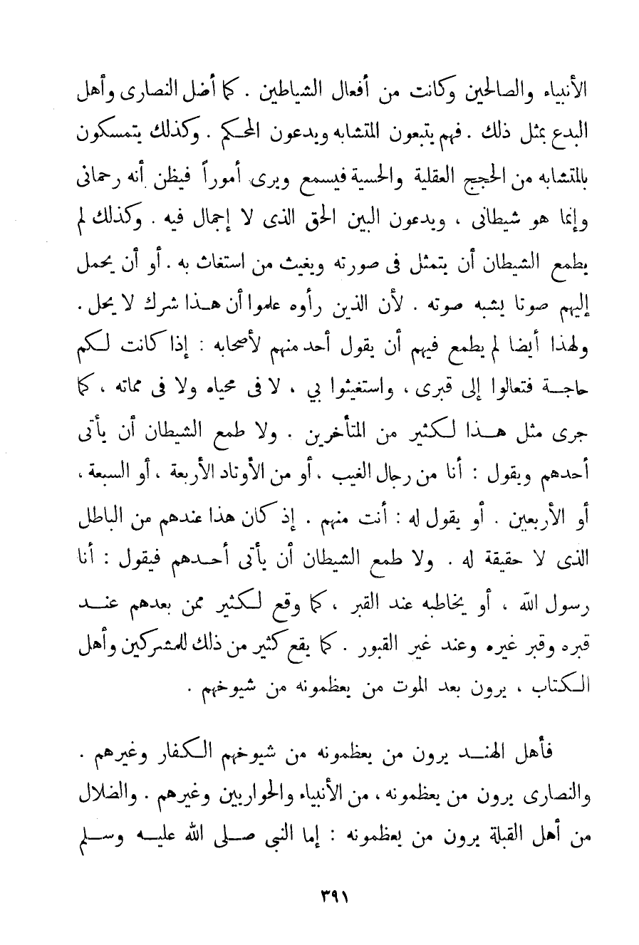 الْأَنْبِيَاءِ وَالصَّالِحِينَ وَكَانَتْ مِنْ أَفْعَالِ الشَّيَاطِينِ. كَمَا أَضَلَّ النَّصَارَى وَأَهْلَ الْبِدَعِ بِمِثْلِ ذَلِكَ. فَهُمْ يَتَّبِعُونَ الْمُتَشَابِهَ وَيَدَعُونَ الْمُحْكَمَ. وَكَذَلِكَ يَتَمَسَّكُونَ بِالْمُتَشَابِهِ مِنْ الْحُجَجِ الْعَقْلِيَّةِ وَالْحِسِّيَّةِ فَيَسْمَعُ وَيَرَى أُمُورًا فَيَظُنُّ أَنَّهُ رَحْمَانِيٌّ وَإِنَّمَا هُوَ شَيْطَانِيٌّ وَيَدَعُونَ الْبَيِّنَ الْحَقَّ الَّذِي لَا إجْمَالَ فِيهِ. وَكَذَلِكَ لَمْ يَطْمَعُ الشَّيْطَانُ أَنْ يَتَمَثَّلَ فِي صُورَتِهِ وَيُغِيثَ مَنْ اسْتَغَاثَ بِهِ. أَوْ أَنْ يَحْمِلَ إلَيْهِمْ صَوْتًا يُشْبِهُ صَوْتَهُ. لِأَنَّ الَّذِينَ رَأَوْهُ عَلِمُوا أَنَّ هَذَا شِرْكٌ لَا يَحِلُّ. وَلِهَذَا أَيْضًا لَمْ يَطْمَعْ فِيهِمْ أَنْ يَقُولَ أَحَدٌ مِنْهُمْ لِأَصْحَابِهِ: إذَا كَانَتْ لَكُمْ حَاجَةٌ فَتَعَالَوْا إلَى قَبْرِي وَاسْتُغِيثُوا بِي لَا فِي مَحْيَاهُ وَلَا فِي مَمَاتِهِ كَمَا جَرَى مِثْلُ هَذَا لِكَثِيرِ مِنْ الْمُتَأَخِّرِينَ. وَلَا طَمِعَ الشَّيْطَانُ أَنْ يَأْتِيَ أَحَدَهُمْ وَيَقُولَ: أَنَا مِنْ رِجَالِ الْغَيْبِ أَوْ مِنْ الْأَوْتَادِ الْأَرْبَعَةِ أَوْ السَّبْعَةِ أَوْ الْأَرْبَعِينَ. أَوْ يَقُولَ لَهُ: أَنْتَ مِنْهُمْ. إذْ كَانَ هَذَا عِنْدَهُمْ مِنْ الْبَاطِلِ الَّذِي لَا حَقِيقَةَ لَهُ. وَلَا طَمِعَ الشَّيْطَانُ أَنْ يَأْتِيَ أَحَدَهُمْ فَيَقُولَ: أَنَا رَسُولُ اللَّهِ أَوْ يُخَاطِبَهُ عِنْدَ الْقَبْرِ كَمَا وَقَعَ لِكَثِيرِ مِمَّنْ بَعْدَهُمْ عِنْدَ قَبْرِهِ وَقَبْرِ غَيْرِهِ وَعِنْدَ غَيْرِ الْقُبُورِ. كَمَا يَقَعُ كَثِيرٌ مِنْ ذَلِكَ لِلْمُشْرِكِينَ وَأَهْلِ الْكِتَابِ يَرَوْنَ بَعْدَ الْمَوْتِ مَنْ يُعَظِّمُونَهُ مِنْ شُيُوخِهِمْ. فَأَهْلُ الْهِنْدِ يَرَوْنَ مَنْ يُعَظِّمُونَهُ مِنْ شُيُوخِهِمْ الْكُفَّارِ وَغَيْرِهِمْ. وَالنَّصَارَى يَرَوْنَ مَنْ يُعَظِّمُونَهُ مِنْ الْأَنْبِيَاءِ وَالْحَوَارِيِّينَ وَغَيْرِهِمْ. وَالضُّلَّالُ مَنْ أَهْلِ الْقِبْلَةِ يَرَوْنَ مَنْ يُعَظِّمُونَهُ: إمَّا النَّبِيُّ صَلَّى اللَّهُ عَلَيْهِ وَسَلَّمَ