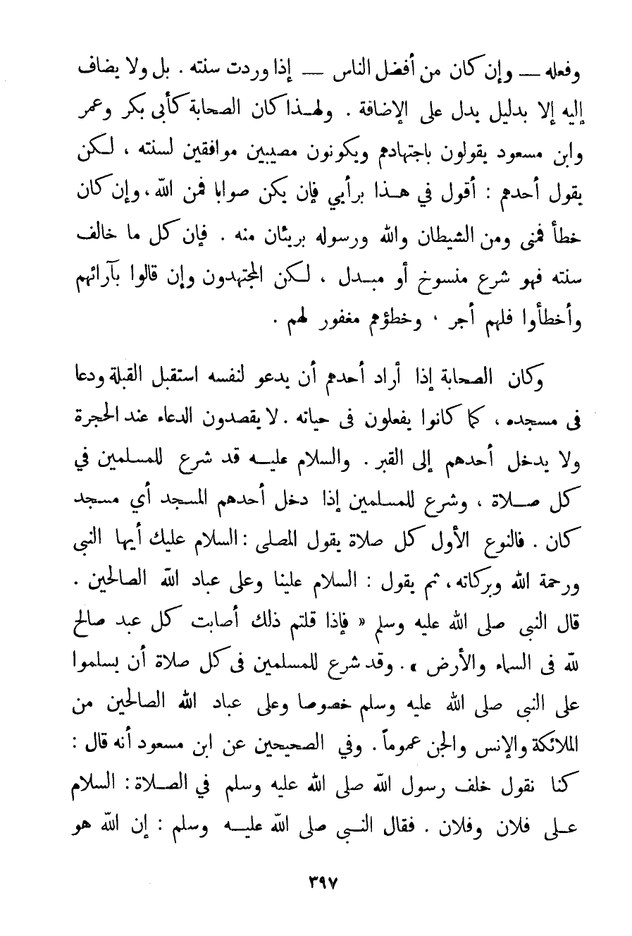 وَفِعْلُهُ - وَإِنْ كَانَ مِنْ أَفْضَلِ النَّاسِ - إذَا وَرَدَتْ سُنَّتُهُ. بَلْ وَلَا يُضَافُ إلَيْهِ إلَّا بِدَلِيلِ يَدُلُّ عَلَى الْإِضَافَةِ. وَلِهَذَا كَانَ الصَّحَابَةُ كَأَبِي بَكْرٍ وَعُمَرَ وَابْنِ مَسْعُودٍ يَقُولُونَ بِاجْتِهَادِهِمْ وَيَكُونُونَ مُصِيبِينَ مُوَافِقِينَ لِسُنَّتِهِ لَكِنْ يَقُولُ أَحَدُهُمْ: أَقُولُ فِي هَذَا بِرَأْيِي فَإِنْ يَكُنْ صَوَابًا فَمِنْ اللَّهِ وَإِنْ كَانَ خَطَأً فَمِنِّي وَمِنْ الشَّيْطَانِ وَاَللَّهُ وَرَسُولُهُ بَرِيئَانِ مِنْهُ. فَإِنَّ كُلَّ مَا خَالَفَ سُنَّتَهُ فَهُوَ شَرْعٌ مَنْسُوخٌ أَوْ مُبَدَّلٌ لَكِنْ الْمُجْتَهِدُونَ وَإِنْ قَالُوا بِآرَائِهِمْ وَأَخْطَئُوا فَلَهُمْ أَجْرٌ وَخَطَؤُهُمْ مَغْفُورٌ لَهُمْ. وَكَانَ الصَّحَابَةُ إذَا أَرَادَ أَحَدُهُمْ أَنْ يَدْعُوَ لِنَفْسِهِ اسْتَقْبَلَ الْقِبْلَةَ وَدَعَا فِي مَسْجِدِهِ كَمَا كَانُوا يَفْعَلُونَ فِي حَيَاتِهِ. لَا يَقْصِدُونَ الدُّعَاءَ عِنْدَ الْحُجْرَةِ وَلَا يَدْخُلُ أَحَدُهُمْ إلَى الْقَبْرِ. وَالسَّلَامُ عَلَيْهِ قَدْ شُرِعَ لِلْمُسْلِمِينَ فِي كُلِّ صَلَاةٍ وَشُرِعَ لِلْمُسْلِمِينَ إذَا دَخَلَ أَحَدُهُمْ الْمَسْجِدَ أَيَّ مَسْجِدٍ كَانَ. فَالنَّوْعُ الْأَوَّلُ كُلُّ صَلَاةٍ يَقُولُ الْمُصَلِّي: السَّلَامُ عَلَيْك أَيُّهَا النَّبِيُّ وَرَحْمَةُ اللَّهِ وَبَرَكَاتُهُ ثُمَّ يَقُولُ: السَّلَامُ عَلَيْنَا وَعَلَى عِبَادِ اللَّهِ الصَّالِحِينَ. قَالَ النَّبِيُّ صَلَّى اللَّهُ عَلَيْهِ وَسَلَّمَ {فَإِذَا قُلْتُمْ ذَلِكَ أَصَابَتْ كُلَّ عَبْدٍ صَالِحٍ لِلَّهِ فِي السَّمَاءِ وَالْأَرْضِ} . وَقَدْ شُرِعَ لِلْمُسْلِمِينَ فِي كُلِّ صَلَاةٍ أَنْ يُسَلِّمُوا عَلَى النَّبِيِّ صَلَّى اللَّهُ عَلَيْهِ وَسَلَّمَ خُصُوصًا وَعَلَى عِبَادِ اللَّهِ الصَّالِحِينَ مِنْ الْمَلَائِكَةِ وَالْإِنْسِ وَالْجِنِّ عُمُومًا. وَفِي الصَّحِيحَيْنِ {عَنْ ابْنِ مَسْعُودٍ أَنَّهُ قَالَ: كُنَّا نَقُولُ خَلْفَ رَسُولِ اللَّهِ صَلَّى اللَّهُ عَلَيْهِ وَسَلَّمَ فِي الصَّلَاةِ: السَّلَامُ عَلَى فُلَانٍ وَفُلَانٍ. فَقَالَ النَّبِيُّ صَلَّى اللَّهُ عَلَيْهِ وَسَلَّمَ إنَّ اللَّهَ هُوَ السَّلَامُ فَإِذَا