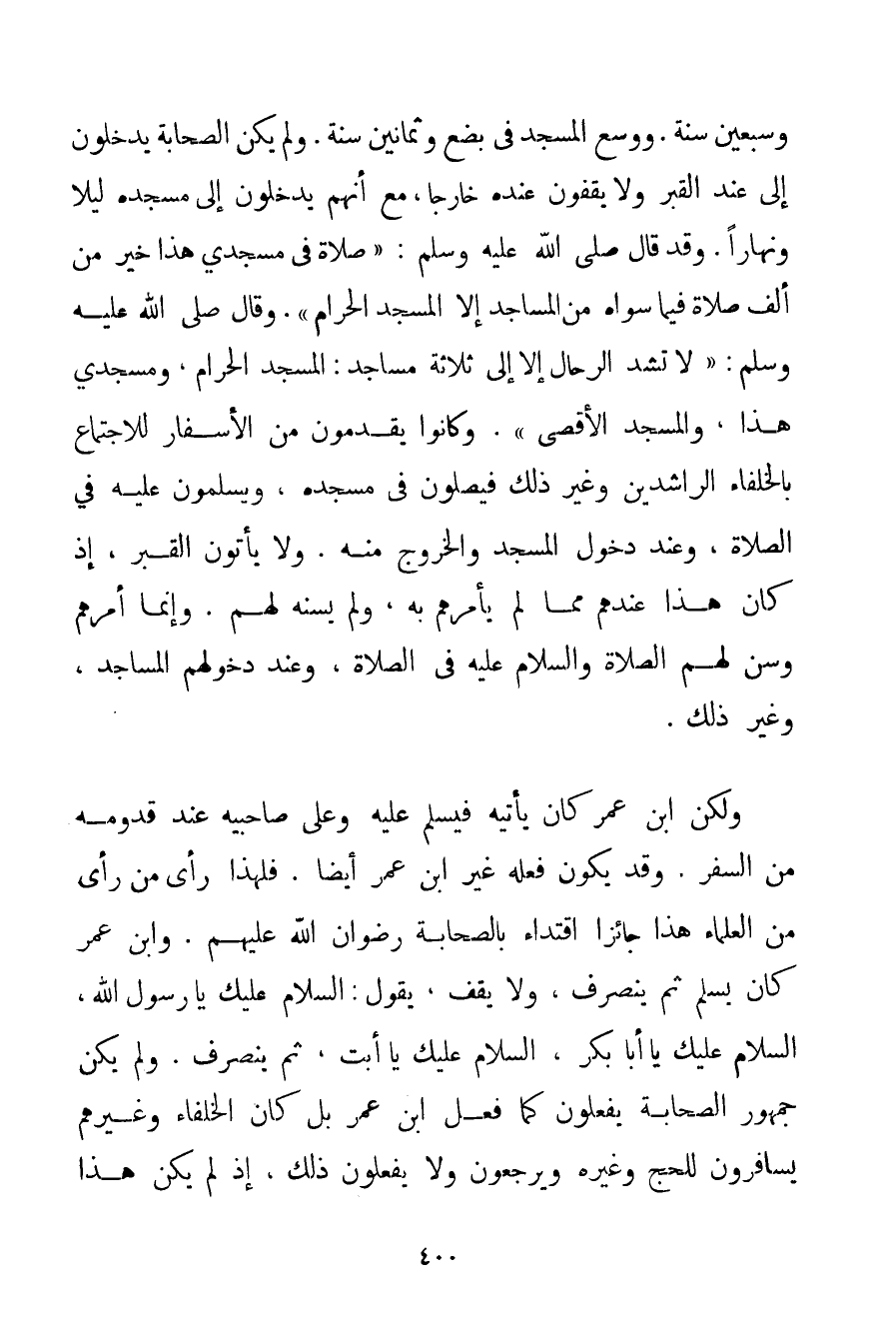 وَسَبْعِينَ سَنَةً. وَوُسِّعَ الْمَسْجِدُ فِي بِضْعٍ وَثَمَانِينَ سَنَةً. وَلَمْ يَكُنْ الصَّحَابَةُ يَدْخُلُونَ إلَى عِنْدِ الْقَبْرِ وَلَا يَقِفُونَ عِنْدَهُ خَارِجًا مَعَ أَنَّهُمْ يَدْخُلُونَ إلَى مَسْجِدِهِ لَيْلًا وَنَهَارًا. وَقَدْ قَالَ صَلَّى اللَّهُ عَلَيْهِ وَسَلَّمَ {صَلَاةٌ فِي مَسْجِدِي هَذَا خَيْرٌ مِنْ أَلْفِ صَلَاةٍ فِيمَا سِوَاهُ مِنْ الْمَسَاجِدِ إلَّا الْمَسْجِدَ الْحَرَامَ} . وَقَالَ صَلَّى اللَّهُ عَلَيْهِ وَسَلَّمَ {لَا تُشَدُّ الرِّحَالُ إلَّا إلَى ثَلَاثَةِ مَسَاجِدَ: الْمَسْجِدِ الْحَرَامِ وَمَسْجِدِي هَذَا وَالْمَسْجِدِ الْأَقْصَى} وَكَانُوا يَقْدَمُونَ مِنْ الْأَسْفَارِ لِلِاجْتِمَاعِ بِالْخُلَفَاءِ الرَّاشِدِينَ وَغَيْرِ ذَلِكَ فَيُصَلُّونَ فِي مَسْجِدِهِ وَيُسَلِّمُونَ عَلَيْهِ فِي الصَّلَاةِ وَعِنْدَ دُخُولِ الْمَسْجِدِ وَالْخُرُوجِ مِنْهُ. وَلَا يَأْتُونَ الْقَبْرَ إذْ كَانَ هَذَا عِنْدَهُمْ مِمَّا لَمْ يَأْمُرْهُمْ بِهِ وَلَمْ يَسُنَّهُ لَهُمْ. وَإِنَّمَا أَمَرَهُمْ وَسَنَّ لَهُمْ الصَّلَاةَ وَالسَّلَامَ عَلَيْهِ فِي الصَّلَاةِ وَعِنْدَ دُخُولِهِمْ الْمَسَاجِدَ وَغَيْرِ ذَلِكَ. وَلَكِنَّ ابْنَ عُمَرَ كَانَ يَأْتِيهِ فَيُسَلِّمُ عَلَيْهِ وَعَلَى صَاحِبَيْهِ عِنْدَ قُدُومِهِ مِنْ السَّفَرِ. وَقَدْ يَكُونُ فِعْلُهُ غَيْرَ ابْنِ عُمَرَ أَيْضًا. فَلِهَذَا رَأَى مَنْ رَأَى مِنْ الْعُلَمَاءِ هَذَا جَائِزًا اقْتِدَاءً بِالصَّحَابَةِ رِضْوَانُ اللَّهِ عَلَيْهِمْ. وَابْنُ عُمَرَ كَانَ يُسَلِّمُ ثُمَّ يَنْصَرِفُ وَلَا يَقِفُ يَقُولُ: السَّلَامُ عَلَيْك يَا رَسُولَ اللَّهِ السَّلَامُ عَلَيْك يَا أَبَا بَكْرٍ السَّلَامُ عَلَيْك يَا أَبَتْ ثُمَّ يَنْصَرِفُ. وَلَمْ يَكُنْ جُمْهُورُ الصَّحَابَةِ يَفْعَلُونَ كَمَا فَعَلَ ابْنُ عُمَرَ بَلْ كَانَ الْخُلَفَاءُ وَغَيْرُهُمْ يُسَافِرُونَ لِلْحَجِّ وَغَيْرِهِ وَيَرْجِعُونَ وَلَا يَفْعَلُونَ ذَلِكَ إذْ لَمْ يَكُنْ هَذَا