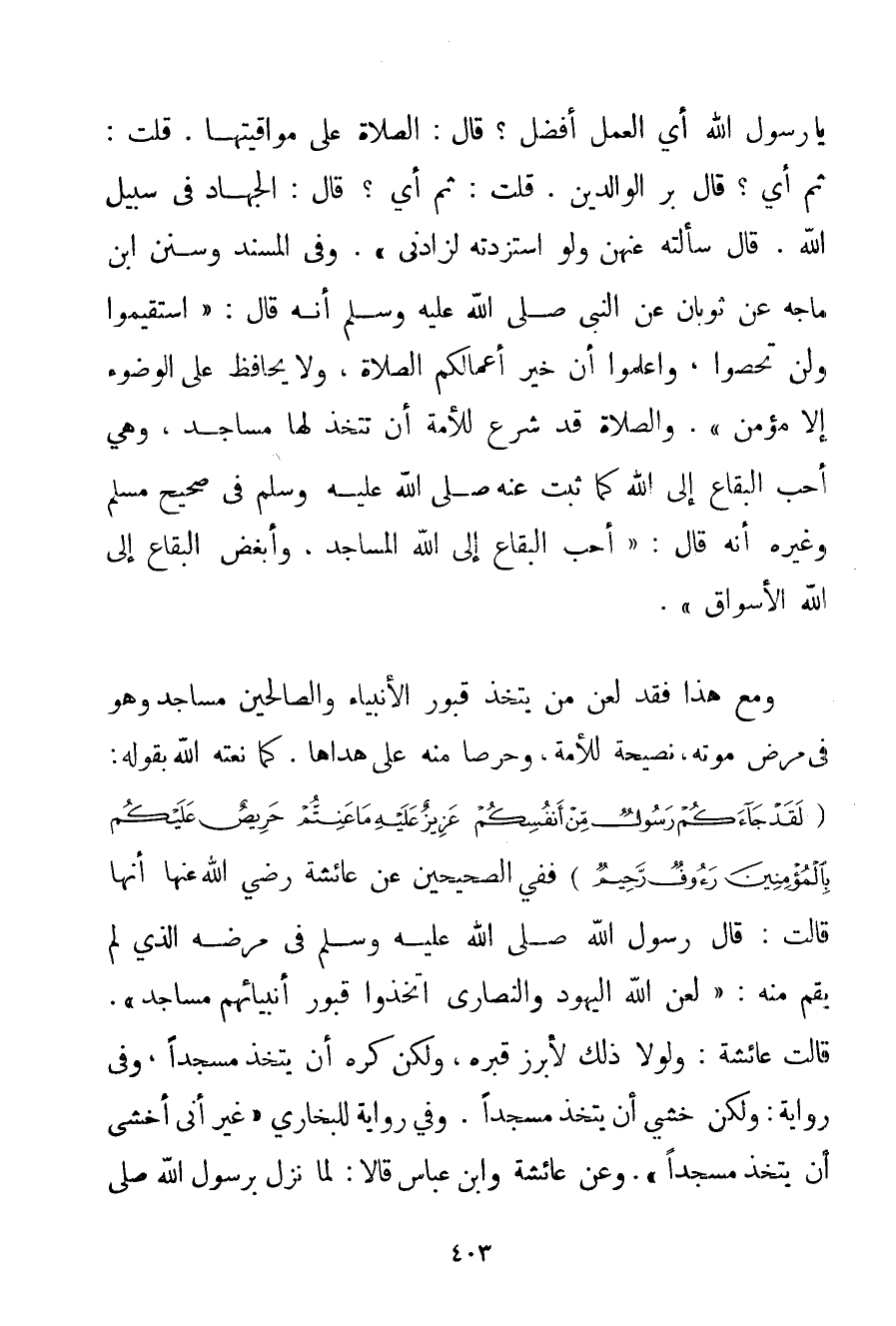 يَا رَسُولَ اللَّهِ أَيُّ الْعَمَلِ أَفْضَلُ؟ قَالَ: الصَّلَاةُ عَلَى مَوَاقِيتِهَا. قُلْت: ثُمَّ أَيُّ؟ قَالَ بِرُّ الْوَالِدَيْنِ. قُلْت: ثُمَّ أَيُّ؟ قَالَ: الْجِهَادُ فِي سَبِيلِ اللَّهِ. قَالَهُ سَأَلْته عَنْهُنَّ وَلَوْ اسْتَزَدْته لَزَادَنِي} . وَفِي الْمُسْنَدِ وَسُنَنِ ابْنِ مَاجَه عَنْ ثوبان عَنْ النَّبِيِّ صَلَّى اللَّهُ عَلَيْهِ وَسَلَّمَ أَنَّهُ قَالَ: {اسْتَقِيمُوا وَلَنْ تُحْصُوا وَاعْلَمُوا أَنَّ خَيْرَ أَعْمَالِكُمْ الصَّلَاةُ وَلَا يُحَافِظُ عَلَى الْوُضُوءِ إلَّا مُؤْمِنٌ} . وَالصَّلَاةُ قَدْ شُرِعَ لِلْأُمَّةِ أَنْ تَتَّخِذَ لَهَا مَسَاجِدَ وَهِيَ أَحَبُّ الْبِقَاعِ إلَى اللَّهِ كَمَا ثَبَتَ عَنْهُ صَلَّى اللَّهُ عَلَيْهِ وَسَلَّمَ فِي صَحِيحِ مُسْلِمٍ وَغَيْرِهِ أَنَّهُ قَالَ: {أَحَبُّ الْبِقَاعِ إلَى اللَّهِ الْمَسَاجِدُ وَأَبْغَضُ الْبِقَاعِ إلَى اللَّهِ الْأَسْوَاقُ} . وَمَعَ هَذَا فَقَدْ لَعَنَ مَنْ يَتَّخِذُ قُبُورَ الْأَنْبِيَاءِ وَالصَّالِحِينَ مَسَاجِدَ وَهُوَ فِي مَرَضِ مَوْتِهِ نَصِيحَةً لِلْأُمَّةِ وَحِرْصًا مِنْهُ عَلَى هُدَاهَا. كَمَا نَعَتَهُ اللَّهَ بِقَوْلِهِ: {لَقَدْ جَاءَكُمْ رَسُولٌ مِنْ أَنْفُسِكُمْ عَزِيزٌ عَلَيْهِ مَا عَنِتُّمْ حَرِيصٌ عَلَيْكُمْ بِالْمُؤْمِنِينَ رَءُوفٌ رَحِيمٌ} فَفِي الصَّحِيحَيْنِ عَنْ عَائِشَةَ رَضِيَ اللَّهُ عَنْهَا أَنَّهَا قَالَتْ: {قَالَ رَسُولُ اللَّهِ صَلَّى اللَّهُ عَلَيْهِ وَسَلَّمَ فِي مَرَضِهِ الَّذِي لَمْ يَقُمْ مِنْهُ: لَعَنَ اللَّهُ الْيَهُودَ وَالنَّصَارَى اتَّخَذُوا قُبُورَ أَنْبِيَائِهِمْ مَسَاجِدَ. قَالَتْ عَائِشَةُ: وَلَوْلَا ذَلِكَ لَأُبْرِزَ قَبْرُهُ وَلَكِنْ كَرِهَ أَنْ يُتَّخَذَ مَسْجِدًا} وَفِي رِوَايَةٍ: {وَلَكِنْ خَشِيَ أَنْ يُتَّخَذَ مَسْجِدًا} . وَفِي رِوَايَةٍ لِلْبُخَارِيِّ {غَيْرَ أَنِّي أَخْشَى أَنْ يُتَّخَذَ مَسْجِدًا} . وَعَنْ عَائِشَةَ وَابْنِ عَبَّاسٍ قَالَا: {لَمَّا نَزَلَ بِرَسُولِ اللَّهِ