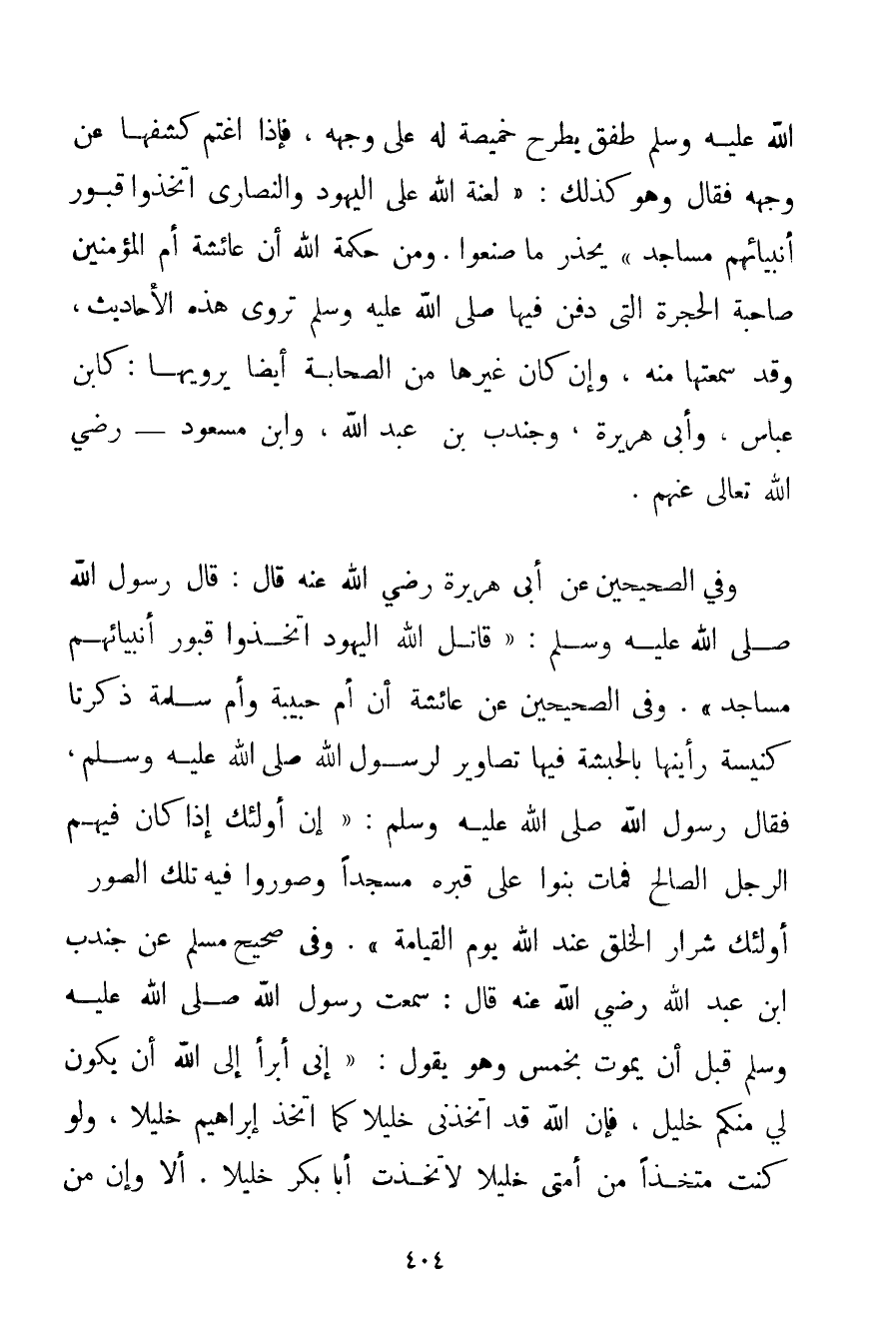 صَلَّى اللَّهُ عَلَيْهِ وَسَلَّمَ طَفِقَ يَطْرَحُ خَمِيصَةً لَهُ عَلَى وَجْهِهِ فَإِذَا اغْتَمَّ كَشَفَهَا عَنْ وَجْهِهِ فَقَالَ وَهُوَ كَذَلِكَ: لَعْنَةُ اللَّهِ عَلَى الْيَهُودِ وَالنَّصَارَى اتَّخَذُوا قُبُورَ أَنْبِيَائِهِمْ مَسَاجِدَ} يُحَذِّرُ مَا صَنَعُوا. وَمِنْ حِكْمَةِ اللَّهِ أَنَّ عَائِشَةَ أُمَّ الْمُؤْمِنِينَ صَاحِبَةَ الْحُجْرَةِ الَّتِي دُفِنَ فِيهَا صَلَّى اللَّهُ عَلَيْهِ وَسَلَّمَ تَرْوِي هَذِهِ الْأَحَادِيثَ وَقَدْ سَمِعْتهَا مِنْهُ وَإِنْ كَانَ غَيْرُهَا مِنْ الصَّحَابَةِ أَيْضًا يَرْوِيهَا: كَابْنِ عَبَّاسٍ وَأَبِي هُرَيْرَةَ وَجُنْدُبِ بْنِ عَبْدِ اللَّهِ وَابْنِ مَسْعُودٍ - رَضِيَ اللَّهُ تَعَالَى عَنْهُمْ. وَفِي الصَّحِيحَيْنِ عَنْ أَبِي هُرَيْرَةَ رَضِيَ اللَّهُ عَنْهُ قَالَ: قَالَ رَسُولُ اللَّهِ صَلَّى اللَّهُ عَلَيْهِ وَسَلَّمَ {قَاتَلَ اللَّهُ الْيَهُودَ اتَّخَذُوا قُبُورَ أَنْبِيَائِهِمْ مَسَاجِدَ} . وَفِي الصَّحِيحَيْنِ عَنْ عَائِشَةَ {أَنَّ أُمَّ حَبِيبَةَ وَأُمَّ سَلَمَةَ ذَكَرَتَا كَنِيسَةً رَأَيْنَهَا بِالْحَبَشَةِ فِيهَا تَصَاوِيرُ لِرَسُولِ اللَّهِ صَلَّى اللَّهُ عَلَيْهِ وَسَلَّمَ فَقَالَ رَسُولُ اللَّهِ صَلَّى اللَّهُ عَلَيْهِ وَسَلَّمَ إنَّ أُولَئِكَ إذَا كَانَ فِيهِمْ الرَّجُلُ الصَّالِحُ فَمَاتَ بَنَوْا عَلَى قَبْرِهِ مَسْجِدًا وَصَوَّرُوا فِيهِ تِلْكَ الصُّوَرَ أُولَئِكَ شِرَارُ الْخَلْقِ عِنْدَ اللَّهِ يَوْمَ الْقِيَامَةِ} . وَفِي صَحِيحِ مُسْلِمٍ عَنْ {جُنْدُبِ بْنِ عَبْدِ اللَّهِ رَضِيَ اللَّهُ عَنْهُ قَالَ: سَمِعْت رَسُولَ اللَّهِ صَلَّى اللَّهُ عَلَيْهِ وَسَلَّمَ قَبْلَ أَنْ يَمُوتَ بِخَمْسِ وَهُوَ يَقُولُ: إنِّي أَبْرَأُ إلَى اللَّهِ أَنْ يَكُونَ لِي مِنْكُمْ خَلِيلٌ فَإِنَّ اللَّهَ قَدْ اتَّخَذَنِي خَلِيلًا كَمَا اتَّخَذَ إبْرَاهِيمَ خَلِيلًا وَلَوْ كُنْت مُتَّخِذًا مِنْ أُمَّتِي خَلِيلًا لَاِتَّخَذْت أَبَا بَكْرٍ خَلِيلًا. أَلَا وَإِنَّ مَنْ
