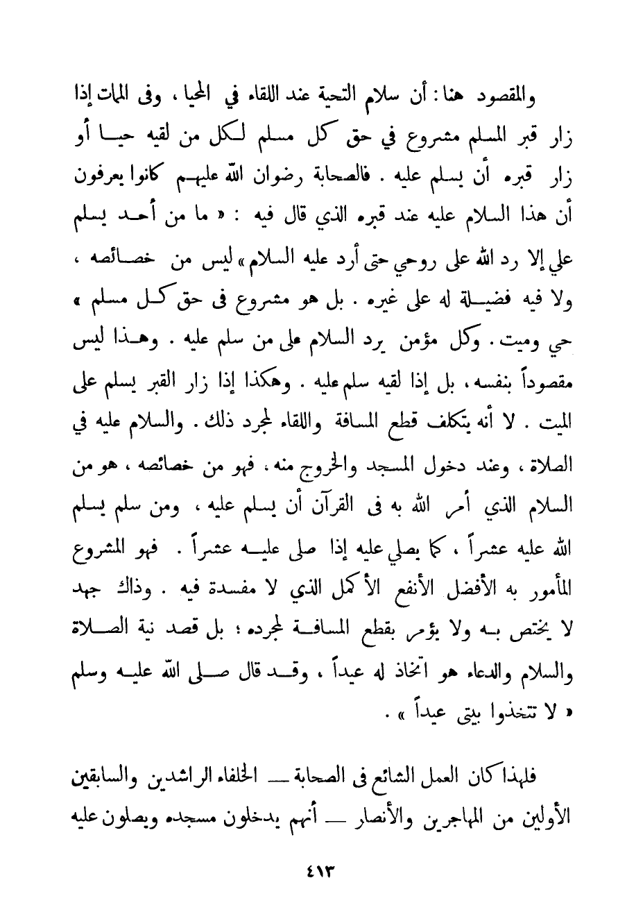 وَالْمَقْصُودُ هُنَا: أَنَّ سَلَامَ التَّحِيَّةِ عِنْدَ اللِّقَاءِ فِي الْمَحْيَا وَفِي الْمَمَاتِ إذَا زَارَ قَبْرَ الْمُسْلِمِ مَشْرُوعٌ فِي حَقِّ كُلِّ مُسْلِمٍ لِكُلِّ مَنْ لَقِيَهُ حَيًّا أَوْ زَارَ قَبْرَهُ أَنْ يُسَلِّمَ عَلَيْهِ. فَالصَّحَابَةُ رِضْوَانُ اللَّهِ عَلَيْهِمْ كَانُوا يَعْرِفُونَ أَنَّ هَذَا السَّلَامَ عَلَيْهِ عِنْدَ قَبْرِهِ الَّذِي قَالَ فِيهِ: {مَا مِنْ أَحَدٍ يُسَلِّمُ عَلَيَّ إلَّا رَدَّ اللَّهُ عَلَيَّ رُوحِي حَتَّى أَرُدَّ عَلَيْهِ السَّلَامَ} لَيْسَ مِنْ خَصَائِصِهِ وَلَا فِيهِ فَضِيلَةٌ لَهُ عَلَى غَيْرِهِ. بَلْ هُوَ مَشْرُوعٌ فِي حَقِّ كُلِّ مُسْلِمٍ " حَيٍّ وَمَيِّتٍ. وَكُلُّ مُؤْمِنٍ يَرُدُّ السَّلَامَ عَلَى مَنْ سَلَّمَ عَلَيْهِ. وَهَذَا لَيْسَ مَقْصُودًا بِنَفْسِهِ بَلْ إذَا لَقِيَهُ سَلَّمَ عَلَيْهِ. وَهَكَذَا إذَا زَارَ الْقَبْرَ يُسَلِّمُ عَلَى الْمَيِّتِ. لَا أَنَّهُ يَتَكَلَّفُ قَطْعَ الْمَسَافَةِ وَاللِّقَاءِ لِمُجَرَّدِ ذَلِكَ. وَالسَّلَامُ عَلَيْهِ فِي الصَّلَاةِ وَعِنْدَ دُخُولِ الْمَسْجِدِ وَالْخُرُوجِ مِنْهُ فَهُوَ مِنْ خَصَائِصِهِ هُوَ مِنْ السَّلَامِ الَّذِي أَمَرَ اللَّهُ بِهِ فِي الْقُرْآنِ أَنْ يُسَلِّمَ عَلَيْهِ وَمَنْ سَلَّمَ يُسَلِّمُ اللَّهُ عَلَيْهِ عَشْرًا كَمَا يُصَلِّي عَلَيْهِ إذَا صَلَّى عَلَيْهِ عَشْرًا. فَهُوَ الْمَشْرُوعُ الْمَأْمُورُ بِهِ الْأَفْضَلُ الْأَنْفَعُ الْأَكْمَلُ الَّذِي لَا مَفْسَدَةَ فِيهِ. وَذَاكَ جَهْدٌ لَا يَخْتَصُّ بِهِ وَلَا يُؤْمَرُ بِقَطْعِ الْمَسَافَةِ لِمُجَرَّدِهِ؛ بَلْ قَصْدُ نِيَّةِ الصَّلَاةِ وَالسَّلَامِ وَالدُّعَاءِ هُوَ اتِّخَاذٌ لَهُ عِيدًا وَقَدْ قَالَ صَلَّى اللَّهُ عَلَيْهِ وَسَلَّمَ {لَا تَتَّخِذُوا بَيْتِي عِيدًا} . فَلِهَذَا كَانَ الْعَمَلُ الشَّائِعُ فِي الصَّحَابَةِ - الْخُلَفَاءِ الرَّاشِدِينَ وَالسَّابِقِينَ الْأَوَّلِينَ مِنْ الْمُهَاجِرِينَ وَالْأَنْصَارِ - أَنَّهُمْ يَدْخُلُونَ مَسْجِدَهُ وَيُصَلُّونَ عَلَيْهِ