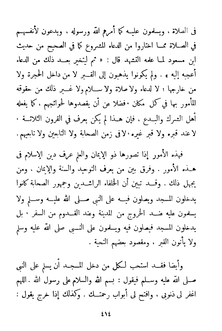 فِي الصَّلَاةِ وَيُسَلِّمُونَ عَلَيْهِ كَمَا أَمَرَهُمْ اللَّهُ وَرَسُولُهُ وَيَدْعُونَ لِأَنْفُسِهِمْ فِي الصَّلَاةِ مِمَّا اخْتَارُوا مِنْ الدُّعَاءِ الْمَشْرُوعِ كَمَا فِي الصَّحِيحِ مِنْ حَدِيثِ ابْنِ مَسْعُودٍ لَمَّا عَلَّمَهُ التَّشَهُّدَ قَالَ: {ثُمَّ لِيَتَخَيَّر بَعْدَ ذَلِكَ مِنْ الدُّعَاءِ أَعْجَبَهُ إلَيْهِ} . وَلَمْ يَكُونُوا يَذْهَبُونَ إلَى الْقَبْرِ لَا مِنْ دَاخِلِ الْحُجْرَةِ وَلَا مِنْ خَارِجِهَا؛ لَا لِدُعَاءِ وَلَا صَلَاةٍ وَلَا سَلَامٍ وَلَا غَيْرِ ذَلِكَ مِنْ حُقُوقِهِ الْمَأْمُورِ بِهَا فِي كُلِّ مَكَانٍ فَضْلًا عَنْ أَنْ يَقْصِدُوهَا لِحَوَائِجِهِمْ كَمَا يَفْعَلُهُ أَهْلُ الشِّرْكِ وَالْبِدَعِ فَإِنَّ هَذَا لَمْ يَكُنْ يُعْرَفْ فِي الْقُرُونِ الثَّلَاثَةِ لَا عِنْدَ قَبْرِهِ وَلَا قَبْرِ غَيْرِهِ لَا فِي زَمَنِ الصَّحَابَةِ وَلَا التَّابِعِينَ وَلَا تَابِعِيهِمْ. فَهَذِهِ الْأُمُورُ إذَا تَصَوَّرَهَا ذُو الْإِيمَانِ وَالْعِلْمِ عَرَفَ دِينَ الْإِسْلَامِ فِي هَذِهِ الْأُمُورِ. وَفَرَّقَ بَيْنَ مَنْ يَعْرِفُ التَّوْحِيدَ وَالسُّنَّةَ وَالْإِيمَانَ وَمَنْ يَجْهَلُ ذَلِكَ وَقَدْ تَبَيَّنَ أَنَّ الْخُلَفَاءَ الرَّاشِدِينَ وَجُمْهُورَ الصَّحَابَةِ كَانُوا يَدْخُلُونَ الْمَسْجِدَ وَيُصَلُّونَ فِيهِ عَلَى النَّبِيِّ صَلَّى اللَّهُ عَلَيْهِ وَسَلَّمَ وَلَا يُسَلِّمُونَ عَلَيْهِ عِنْدَ الْخُرُوجِ مِنْ الْمَدِينَةِ وَعِنْدَ الْقُدُومِ مِنْ السَّفَرِ بَلْ يَدْخُلُونَ الْمَسْجِدَ فَيُصَلُّونَ فِيهِ وَيُسَلِّمُونَ عَلَى النَّبِيِّ صَلَّى اللَّهُ عَلَيْهِ وَسَلَّمَ وَلَا يَأْتُونَ الْقَبْرَ وَمَقْصُودُ بَعْضِهِمْ التَّحِيَّةُ.