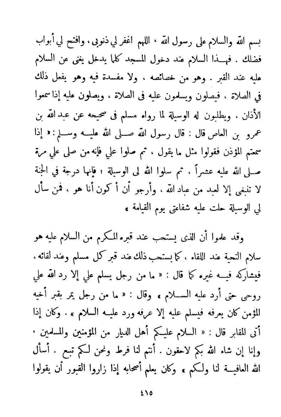 بِسْمِ اللَّهِ وَالسَّلَامِ عَلَى رَسُولِ اللَّهِ اللَّهُمَّ اغْفِرْ لِي ذُنُوبِي وَافْتَحْ لِي أَبْوَابَ فَضْلِك. فَهَذَا السَّلَامُ عِنْدَ دُخُولِ الْمَسْجِدِ كُلَّمَا يَدْخُلُ يُغْنِي عَنْ السَّلَامِ عَلَيْهِ عِنْدَ الْقَبْرِ. وَهُوَ مِنْ خَصَائِصِهِ وَلَا مَفْسَدَةَ فِيهِ وَهُوَ يَفْعَلُ ذَلِكَ فِي الصَّلَاةِ فَيُصَلُّونَ وَيُسَلِّمُونَ عَلَيْهِ فِي الصَّلَاةِ وَيُصَلُّونَ عَلَيْهِ إذَا سَمِعُوا الْأَذَانَ وَيَطْلُبُونَ لَهُ الْوَسِيلَةَ لِمَا رَوَاهُ مُسْلِمٌ فِي صَحِيحِهِ عَنْ عَبْدِ اللَّهِ بْنِ عَمْرِو بْنِ العاص قَالَ: قَالَ رَسُولُ اللَّهِ صَلَّى اللَّهُ عَلَيْهِ وَسَلَّمَ {إذَا سَمِعْتُمْ الْمُؤَذِّنَ فَقُولُوا مِثْلَ مَا يَقُولُ ثُمَّ صَلُّوا عَلَيَّ فَإِنَّهُ مَنْ صَلَّى عَلَيَّ مَرَّةً صَلَّى اللَّهُ عَلَيْهِ عَشْرًا ثُمَّ سَلُوا اللَّهَ لِي الْوَسِيلَةَ؛ فَإِنَّهَا دَرَجَةٌ فِي الْجَنَّةِ لَا تَنْبَغِي إلَّا لِعَبْدِ مِنْ عِبَادِ اللَّهِ وَأَرْجُو أَنْ أَكُونَ أَنَا هُوَ فَمَنْ سَأَلَ لِي الْوَسِيلَةَ حَلَّتْ عَلَيْهِ شَفَاعَتِي يَوْمَ الْقِيَامَةِ.} وَقَدْ عَلِمُوا أَنَّ الَّذِي يُسْتَحَبُّ عِنْدَ قَبْرِهِ الْمُكَرَّمِ مِنْ السَّلَامِ عَلَيْهِ هُوَ سَلَامُ التَّحِيَّةِ عِنْدَ اللِّقَاءِ كَمَا يُسْتَحَبُّ ذَلِكَ عِنْدَ قَبْرِ كُلِّ مُسْلِمٍ وَعِنْدَ لِقَائِهِ فَيُشَارِكُهُ فِيهِ غَيْرُهُ كَمَا قَالَ: {مَا مِنْ رَجُلٍ يُسَلِّمُ عَلَيَّ إلَّا رَدَّ اللَّهُ عَلَيَّ رُوحِي حَتَّى أَرُدَّ عَلَيْهِ السَّلَامَ} وَقَالَ: {مَا مِنْ رَجُلٍ يَمُرُّ بِقَبْرِ أَخِيهِ الْمُؤْمِنِ كَانَ يَعْرِفُهُ فَيُسَلِّمُ عَلَيْهِ إلَّا عَرَفَهُ وَرَدَّ عَلَيْهِ السَّلَامَ} . وَكَانَ إذَا أَتَى الْمَقَابِرَ قَالَ: {السَّلَامُ عَلَيْكُمْ أَهْلَ الدِّيَارِ مِنْ الْمُؤْمِنِينَ وَالْمُسْلِمِينَ وَإِنَّا إنْ شَاءَ اللَّهُ بِكُمْ لَاحِقُونَ. أَنْتُمْ لَنَا فَرْطٌ وَنَحْنُ لَكُمْ تَبَعٌ. أَسْأَلُ اللَّهَ الْعَافِيَة لَنَا وَلَكُمْ} وَكَانَ يُعَلِّمُ أَصْحَابَهُ إذَا زَارُوا الْقُبُورَ أَنْ يَقُولُوا