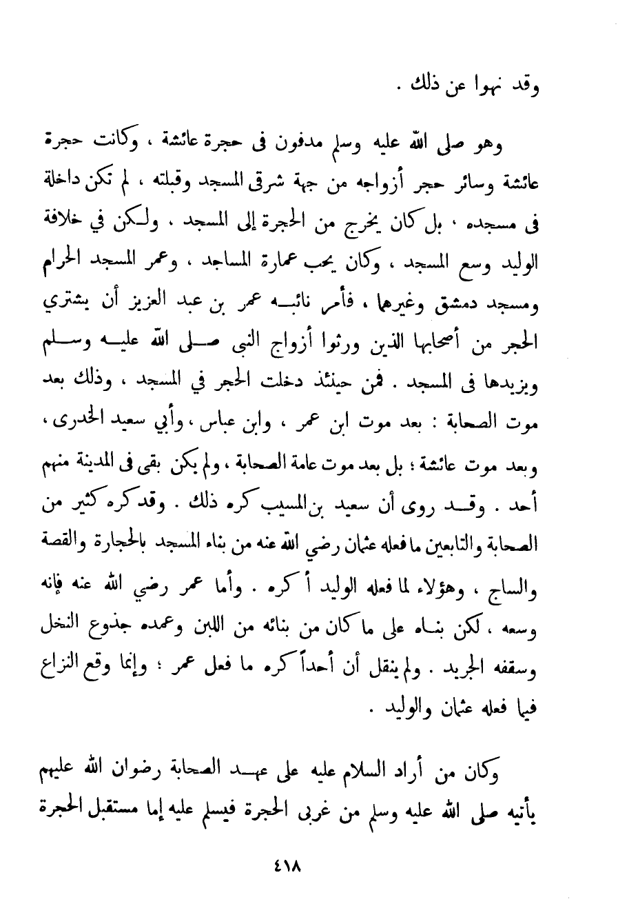 وَقَدْ نُهُوا عَنْ ذَلِكَ. وَهُوَ صَلَّى اللَّهُ عَلَيْهِ وَسَلَّمَ مَدْفُونٌ فِي حُجْرَةِ عَائِشَةَ وَكَانَتْ حُجْرَةُ عَائِشَةَ وَسَائِرُ حُجَرِ أَزْوَاجِهِ مِنْ جِهَةِ شَرْقِيِّ الْمَسْجِدِ وَقِبْلَتُهُ لَمْ تَكُنْ دَاخِلَةً فِي مَسْجِدِهِ بَلْ كَانَ يَخْرَجُ مِنْ الْحُجْرَةِ إلَى الْمَسْجِدِ وَلَكِنْ فِي خِلَافَةِ الْوَلِيدِ وُسِّعَ الْمَسْجِدُ وَكَانَ يُحِبُّ عِمَارَةَ الْمَسَاجِدِ وَعَمَّرَ الْمَسْجِدَ الْحَرَامَ وَمَسْجِدَ دِمَشْقَ وَغَيْرَهُمَا فَأَمَرَ نَائِبَهُ عُمَرَ بْنَ عَبْدِ الْعَزِيزِ أَنْ يَشْتَرِيَ الْحُجَرَ مِنْ أَصْحَابِهَا الَّذِينَ وَرِثُوا أَزْوَاجَ النَّبِيِّ صَلَّى اللَّهُ عَلَيْهِ وَسَلَّمَ وَيَزِيدَهَا فِي الْمَسْجِدِ. فَمِنْ حِينَئِذٍ دَخَلَتْ الْحُجَرُ فِي الْمَسْجِدِ وَذَلِكَ بَعْدَ مَوْتِ الصَّحَابَةِ: بَعْدَ مَوْتِ ابْنِ عُمَرَ وَابْنِ عَبَّاسٍ وَأَبِي سَعِيدٍ الخدري وَبَعْدَ مَوْتِ عَائِشَةَ؛ بَلْ بَعْدَ مَوْتِ عَامَّةِ الصَّحَابَةِ وَلَمْ يَكُنْ بَقِيَ فِي الْمَدِينَة مِنْهُمْ أَحَدٌ. وَقَدْ رُوِيَ أَنَّ سَعِيدَ بْنَ الْمُسَيِّبِ كَرِهَ ذَلِكَ. وَقَدْ كَرِهَ كَثِيرٌ مِنْ الصَّحَابَةِ وَالتَّابِعِينَ مَا فَعَلَهُ عُثْمَانُ رَضِيَ اللَّهُ عَنْهُ مِنْ بِنَاءِ الْمَسْجِدِ بِالْحِجَارَةِ وَالْقَصَّةِ وَالسَّاجِ وَهَؤُلَاءِ لِمَا فَعَلَهُ الْوَلِيدُ أَكْرَهُ. وَأَمَّا عُمَرُ رَضِيَ اللَّهُ عَنْهُ فَإِنَّهُ وَسَّعَهُ لَكِنْ بَنَاهُ عَلَى مَا كَانَ مِنْ بِنَائِهِ مِنْ اللَّبِنِ وَعُمُدُهُ جُذُوعُ النَّخْلِ وَسَقْفُهُ الْجَرِيدُ. وَلَمْ يُنْقَلْ أَنَّ أَحَدًا كَرِهَ مَا فَعَلَ عُمَرُ؛ وَإِنَّمَا وَقَعَ النِّزَاعُ فِيمَا فَعَلَهُ عُثْمَانُ وَالْوَلِيدُ. وَكَانَ مِنْ أَرَادَ السَّلَامَ عَلَيْهِ عَلَى عَهْدِ الصَّحَابَةِ رِضْوَانُ اللَّهِ عَلَيْهِمْ يَأْتِيهِ صَلَّى اللَّهُ عَلَيْهِ وَسَلَّمَ مِنْ غَرْبِيِّ الْحُجْرَةِ فَيُسَلِّمُ عَلَيْهِ إمَّا مُسْتَقْبِلَ الْحُجْرَةِ