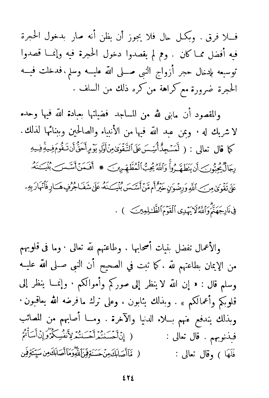 فَلَا فَرْقَ. وَبِكُلِّ حَالٍ فَلَا يَجُوزُ أَنْ يُظَنَّ أَنَّهُ صَارَ بِدُخُولِ الْحُجْرَةِ فِيهِ أَفْضَلَ مِمَّا كَانَ. وَهُمْ لَمْ يَقْصِدُوا دُخُولَ الْحُجْرَةِ فِيهِ وَإِنَّمَا قَصَدُوا تَوْسِيعَهُ بِإِدْخَالِ حُجَرِ أَزْوَاجِ النَّبِيِّ صَلَّى اللَّهُ عَلَيْهِ وَسَلَّمَ فَدَخَلَتْ فِيهِ الْحُجْرَةُ ضَرُورَةً مَعَ كَرَاهَةِ مَنْ كَرِهَ ذَلِكَ مِنْ السَّلَفِ. وَالْمَقْصُودُ أَنَّ مَا بُنِيَ لِلَّهِ مِنْ الْمَسَاجِدِ فَضِيلَتُهَا بِعِبَادَةِ اللَّهِ فِيهَا وَحْدَهُ لَا شَرِيكَ لَهُ وَبِمَنْ عَبَدَ اللَّهَ فِيهَا مِنْ الْأَنْبِيَاءِ وَالصَّالِحِينَ وَبِبِنَائِهَا لِذَلِكَ. كَمَا قَالَ تَعَالَى: {لَمَسْجِدٌ أُسِّسَ عَلَى التَّقْوَى مِنْ أَوَّلِ يَوْمٍ أَحَقُّ أَنْ تَقُومَ فِيهِ فِيهِ رِجَالٌ يُحِبُّونَ أَنْ يَتَطَهَّرُوا وَاللَّهُ يُحِبُّ الْمُطَّهِّرِينَ} {أَفَمَنْ أَسَّسَ بُنْيَانَهُ عَلَى تَقْوَى مِنَ اللَّهِ وَرِضْوَانٍ خَيْرٌ أَمْ مَنْ أَسَّسَ بُنْيَانَهُ عَلَى شَفَا جُرُفٍ هَارٍ فَانْهَارَ بِهِ فِي نَارِ جَهَنَّمَ وَاللَّهُ لَا يَهْدِي الْقَوْمَ الظَّالِمِينَ} . وَالْأَعْمَالُ تُفَضَّلُ بِنِيَّاتِ أَصْحَابِهَا وَطَاعَتِهِمْ لِلَّهِ تَعَالَى وَمَا فِي قُلُوبِهِمْ مِنْ الْإِيمَانِ بِطَاعَتِهِمْ لِلَّهِ كَمَا ثَبَتَ فِي الصَّحِيح أَنَّ النَّبِيَّ صَلَّى اللَّهُ عَلَيْهِ وَسَلَّمَ قَالَ: {إنَّ اللَّهَ لَا يَنْظُرُ إلَى صُوَرِكُمْ وَأَمْوَالِكُمْ وَإِنَّمَا يَنْظُرُ إلَى قُلُوبِكُمْ وَأَعْمَالِكُمْ} . وَبِذَلِكَ يُثَابُونَ وَعَلَى تَرْكِ مَا فَرَضَهُ اللَّهُ يُعَاقَبُونَ وَبِذَلِكَ يَنْدَفِعُ عَنْهُمْ بَلَاءُ الدُّنْيَا وَالْآخِرَةِ. وَمَا أَصَابَهُمْ مِنْ الْمَصَائِبِ فَبِذُنُوبِهِمْ. قَالَ تَعَالَى: {إنْ أَحْسَنْتُمْ أَحْسَنْتُمْ لِأَنْفُسِكُمْ وَإِنْ أَسَأْتُمْ فَلَهَا} وَقَالَ تَعَالَى: {مَا أَصَابَكَ مِنْ حَسَنَةٍ فَمِنَ اللَّهِ وَمَا أَصَابَكَ مِنْ