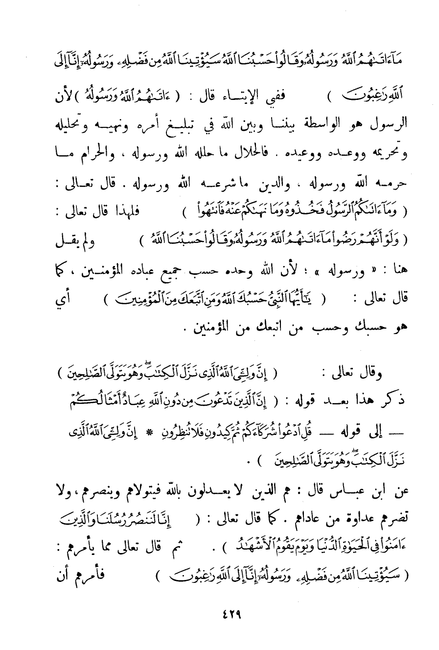 آتَاهُمُ اللَّهُ وَرَسُولُهُ وَقَالُوا حَسْبُنَا اللَّهُ سَيُؤْتِينَا اللَّهُ مِنْ فَضْلِهِ وَرَسُولُهُ إنَّا إلَى اللَّهِ رَاغِبُونَ} فَفِي الْإِيتَاءِ قَالَ: {آتَاهُمُ اللَّهُ وَرَسُولُهُ} لِأَنَّ الرَّسُولَ هُوَ الْوَاسِطَةُ بَيْنَنَا وَبَيْنَ اللَّهِ فِي تَبْلِيغِ أَمْرِهِ وَنَهْيِهِ وَتَحْلِيلِهِ وَتَحْرِيمِهِ وَوَعْدِهِ وَوَعِيدِهِ. فَالْحَلَالُ مَا حَلَّلَهُ اللَّهُ وَرَسُولُهُ وَالْحَرَامُ مَا حَرَّمَهُ اللَّهُ وَرَسُولُهُ وَالدِّينُ مَا شَرَعَهُ اللَّهُ وَرَسُولُهُ. قَالَ تَعَالَى: {وَمَا آتَاكُمُ الرَّسُولُ فَخُذُوهُ وَمَا نَهَاكُمْ عَنْهُ فَانْتَهُوا} فَلِهَذَا قَالَ تَعَالَى: {وَلَوْ أَنَّهُمْ رَضُوا مَا آتَاهُمُ اللَّهُ وَرَسُولُهُ وَقَالُوا حَسْبُنَا اللَّهُ} وَلَمْ يَقُلْ هُنَا: " وَرَسُولُهُ "؛ لِأَنَّ اللَّهَ وَحْدَهُ حَسْبُ جَمِيعِ عِبَادِهِ الْمُؤْمِنِينَ كَمَا قَالَ تَعَالَى: {يَا أَيُّهَا النَّبِيُّ حَسْبُكَ اللَّهُ وَمَنِ اتَّبَعَكَ مِنَ الْمُؤْمِنِينَ} أَيْ هُوَ حَسْبُك وَحَسْبُ مَنْ اتَّبَعَك مِنْ الْمُؤْمِنِينَ. وَقَالَ تَعَالَى: {إنَّ وَلِيِّيَ اللَّهُ الَّذِي نَزَّلَ الْكِتَابَ وَهُوَ يَتَوَلَّى الصَّالِحِينَ} ذَكَرَ هَذَا بَعْدَ قَوْلِهِ: {إنَّ الَّذِينَ تَدْعُونَ مِنْ دُونِ اللَّهِ عِبَادٌ أَمْثَالُكُمْ} - إلَى قَوْلِهِ - {قُلِ ادْعُوا شُرَكَاءَكُمْ ثُمَّ كِيدُونِ فَلَا تُنْظِرُونِ} {إنَّ وَلِيِّيَ اللَّهُ الَّذِي نَزَّلَ الْكِتَابَ وَهُوَ يَتَوَلَّى الصَّالِحِينَ} . عَنْ ابْنِ عَبَّاسٍ قَالَ: هُمْ الَّذِينَ لَا يَعْدِلُونَ بِاَللَّهِ فَيَتَوَلَّاهُمْ وَيَنْصُرُهُمْ وَلَا تَضُرُّهُمْ عَدَاوَةُ مَنْ عَادَاهُمْ. كَمَا قَالَ تَعَالَى: {إنَّا لَنَنْصُرُ رُسُلَنَا وَالَّذِينَ آمَنُوا فِي الْحَيَاةِ الدُّنْيَا وَيَوْمَ يَقُومُ الْأَشْهَادُ} . ثُمَّ قَالَ تَعَالَى مِمَّا يَأْمُرُهُمْ: {سَيُؤْتِينَا اللَّهُ مِنْ فَضْلِهِ وَرَسُولُهُ إنَّا إلَى اللَّهِ رَاغِبُونَ} فَأَمَرَهُمْ أَنْ