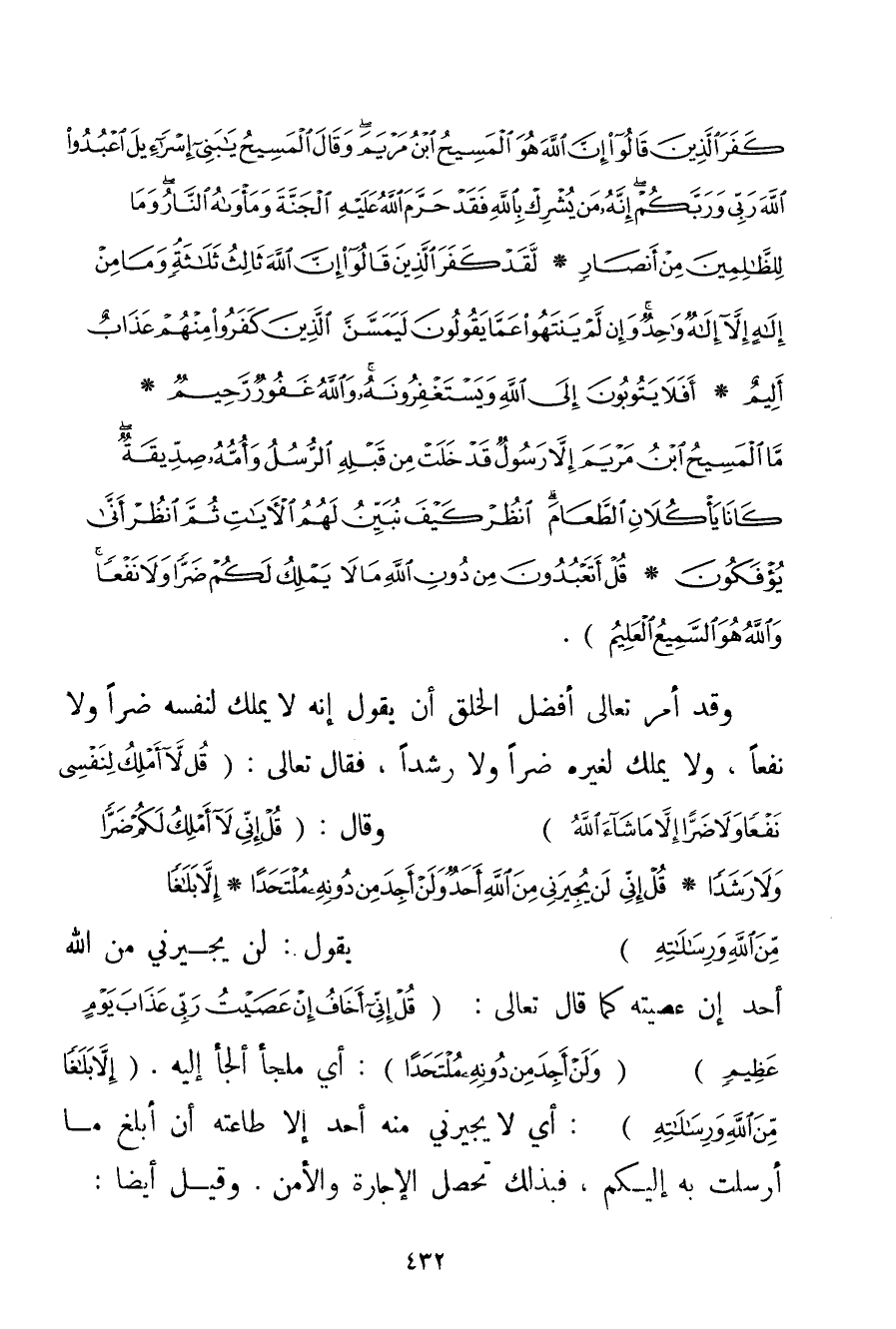 كَفَرَ الَّذِينَ قَالُوا إنَّ اللَّهَ هُوَ الْمَسِيحُ ابْنُ مَرْيَمَ وَقَالَ الْمَسِيحُ يَا بَنِي إسْرَائِيلَ اعْبُدُوا اللَّهَ رَبِّي وَرَبَّكُمْ إنَّهُ مَنْ يُشْرِكْ بِاللَّهِ فَقَدْ حَرَّمَ اللَّهُ عَلَيْهِ الْجَنَّةَ وَمَأْوَاهُ النَّارُ وَمَا لِلظَّالِمِينَ مِنْ أَنْصَارٍ} {لَقَدْ كَفَرَ الَّذِينَ قَالُوا إنَّ اللَّهَ ثَالِثُ ثَلَاثَةٍ وَمَا مِنْ إلَهٍ إلَّا إلَهٌ وَاحِدٌ وَإِنْ لَمْ يَنْتَهُوا عَمَّا يَقُولُونَ لَيَمَسَّنَّ الَّذِينَ كَفَرُوا مِنْهُمْ عَذَابٌ أَلِيمٌ} {أَفَلَا يَتُوبُونَ إلَى اللَّهِ وَيَسْتَغْفِرُونَهُ وَاللَّهُ غَفُورٌ رَحِيمٌ} {مَا الْمَسِيحُ ابْنُ مَرْيَمَ إلَّا رَسُولٌ قَدْ خَلَتْ مِنْ قَبْلِهِ الرُّسُلُ وَأُمُّهُ صِدِّيقَةٌ كَانَا يَأْكُلَانِ الطَّعَامَ انْظُرْ كَيْفَ نُبَيِّنُ لَهُمُ الْآيَاتِ ثُمَّ انْظُرْ أَنَّى يُؤْفَكُونَ} {قُلْ أَتَعْبُدُونَ مِنْ دُونِ اللَّهِ مَا لَا يَمْلِكُ لَكُمْ ضَرًّا وَلَا نَفْعًا وَاللَّهُ هُوَ السَّمِيعُ الْعَلِيمُ} . وَقَدْ أَمَرَ تَعَالَى أَفْضَلَ الْخَلْقِ أَنْ يَقُولَ إنَّهُ لَا يَمْلِكُ لِنَفْسِهِ ضَرًّا وَلَا نَفْعًا وَلَا يَمْلِكُ لِغَيْرِهِ ضَرًّا وَلَا رَشَدًا فَقَالَ تَعَالَى: {قُلْ لَا أَمْلِكُ لِنَفْسِي نَفْعًا وَلَا ضَرًّا إلَّا مَا شَاءَ اللَّهُ} وَقَالَ: {قُلْ إنِّي لَا أَمْلِكُ لَكُمْ ضَرًّا وَلَا رَشَدًا} {قُلْ إنِّي لَنْ يُجِيرَنِي مِنَ اللَّهِ أَحَدٌ وَلَنْ أَجِدَ مِنْ دُونِهِ مُلْتَحَدًا} {إلَّا بَلَاغًا مِنَ اللَّهِ وَرِسَالَاتِهِ} يَقُولُ: لَنْ يُجِيرَنِي مِنْ اللَّهِ أَحَدٌ إنْ عَصَيْته كَمَا قَالَ تَعَالَى: {قُلْ إنِّي أَخَافُ إنْ عَصَيْتُ رَبِّي عَذَابَ يَوْمٍ عَظِيمٍ} {وَلَنْ أَجِدَ مِنْ دُونِهِ مُلْتَحَدًا} أَيْ مَلْجَأً أَلْجَأُ إلَيْهِ. {إلَّا بَلَاغًا مِنَ اللَّهِ وَرِسَالَاتِهِ} أَيْ لَا يُجِيرُنِي مِنْهُ أَحَدٌ إلَّا طَاعَتُهُ أَنْ أُبَلِّغَ مَا أُرْسِلْت بِهِ إلَيْكُمْ فَبِذَلِكَ تَحْصُلُ الْإِجَارَةُ وَالْأَمْنُ. وَقِيلَ أَيْضًا: {لَا