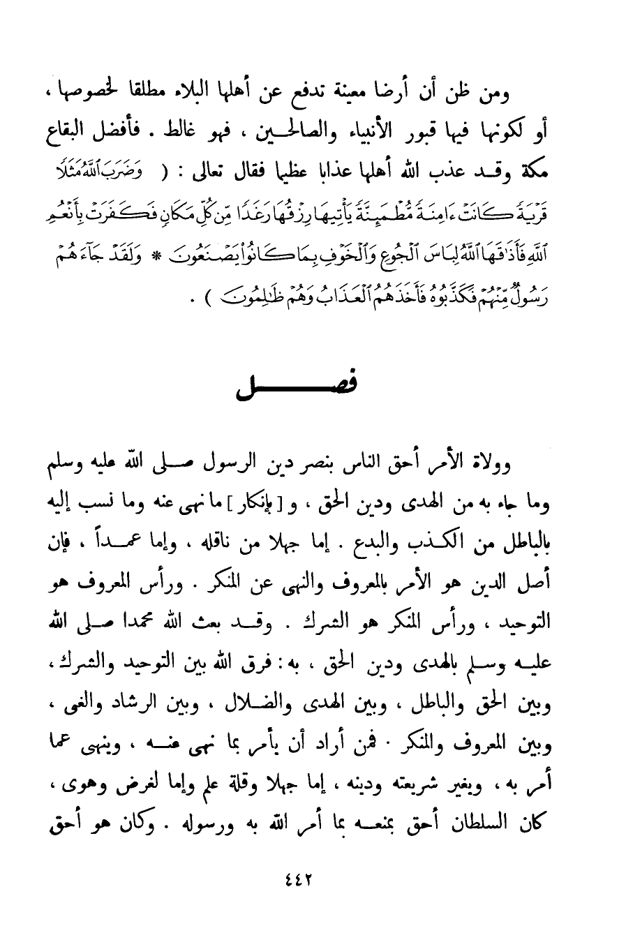 وَوُلَاةُ الْأَمْرِ أَحَقُّ النَّاسِ بِنَصْرِ دِينِ الرَّسُولِ صَلَّى اللَّهُ عَلَيْهِ وَسَلَّمَ وَمَا جَاءَ بِهِ مِنْ الْهُدَى وَدِينِ الْحَقِّ وبِإِنْكَارِ مَا نَهَى عَنْهُ وَمَا نُسِبَ إلَيْهِ بِالْبَاطِلِ مِنْ الْكَذِبِ وَالْبِدَعِ. إمَّا جَهْلًا مِنْ نَاقِلِهِ وَإِمَّا عَمْدًا فَإِنَّ أَصْلَ الدِّينِ هُوَ الْأَمْرُ بِالْمَعْرُوفِ وَالنَّهْيُ عَنْ الْمُنْكَرِ. وَرَأْسُ الْمَعْرُوفِ هُوَ التَّوْحِيدُ وَرَأْسُ الْمُنْكَرِ هُوَ الشِّرْكُ. وَقَدْ بَعَثَ اللَّهُ مُحَمَّدًا صَلَّى اللَّهُ عَلَيْهِ وَسَلَّمَ بِالْهُدَى وَدِينِ الْحَقِّ. بِهِ فَرَّقَ اللَّهُ بَيْنَ التَّوْحِيدِ وَالشِّرْكِ وَبَيْنَ الْحَقِّ وَالْبَاطِلِ وَبَيْنَ الْهُدَى وَالضَّلَالِ وَبَيْنَ الرَّشَادِ وَالْغَيِّ وَبَيْنَ الْمَعْرُوفِ وَالْمُنْكَرِ. فَمَنْ أَرَادَ أَنْ يَأْمُرَ بِمَا نَهَى عَنْهُ وَيَنْهَى عَمَّا أَمَرَ بِهِ وَيُغَيِّرَ شَرِيعَتَهُ وَدِينَهُ إمَّا جَهْلًا وَقِلَّةَ عِلْمٍ وَإِمَّا لِغَرَضِ وَهَوًى كَانَ السُّلْطَانُ أَحَقَّ بِمَنْعِهِ بِمَا أَمَرَ اللَّهُ بِهِ وَرَسُولُهُ. وَكَانَ هُوَ أَحَقَّ