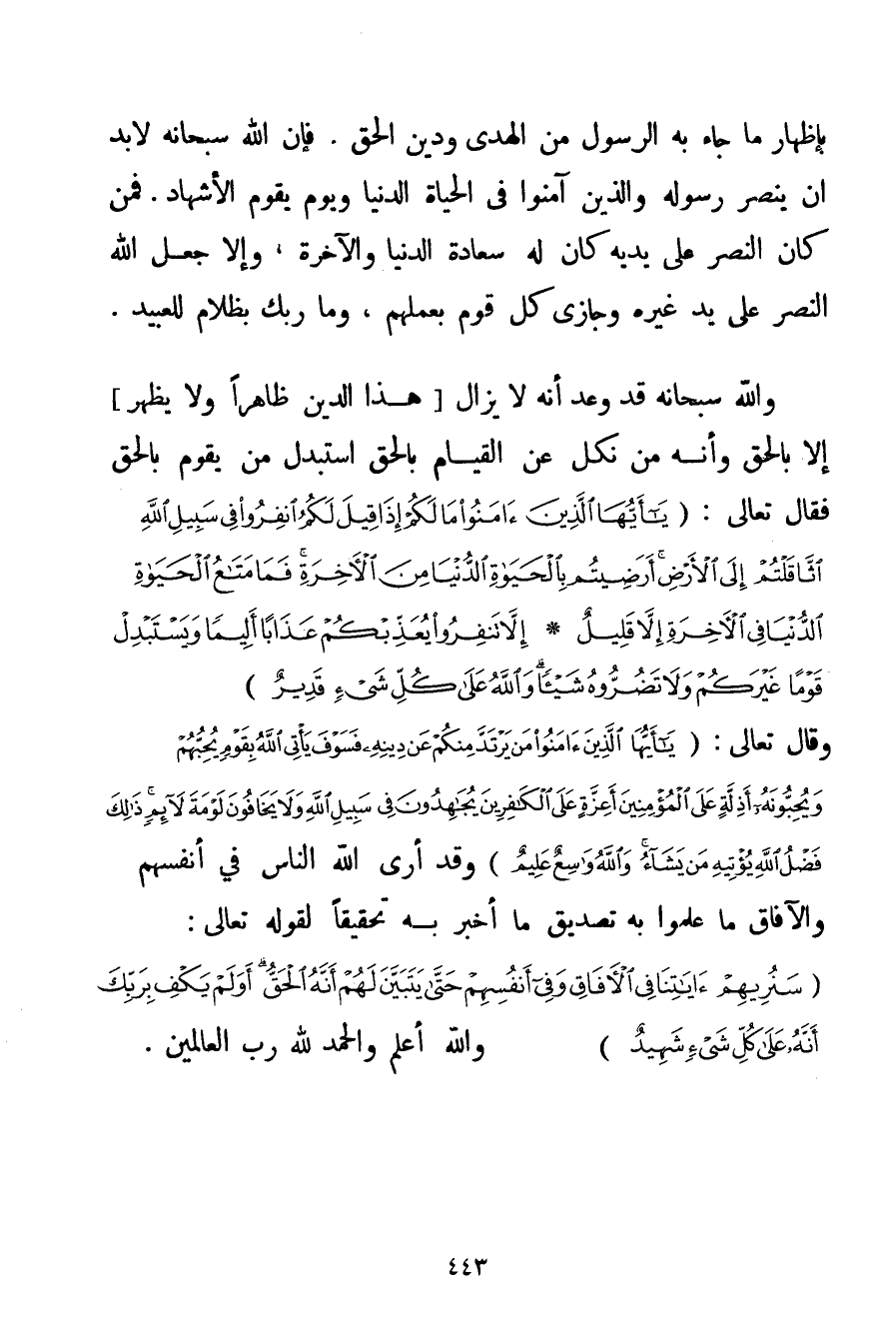 بِإِظْهَارِ مَا جَاءَ بِهِ الرَّسُولُ مِنْ الْهُدَى وَدِينِ الْحَقِّ. فَإِنَّ اللَّهَ سُبْحَانَهُ لَا بُدَّ أَنْ يَنْصُرَ رَسُولَهُ وَاَلَّذِينَ آمَنُوا فِي الْحَيَاةِ الدُّنْيَا وَيَوْمَ يَقُومُ الْأَشْهَادُ. فَمَنْ كَانَ النَّصْرُ عَلَى يَدَيْهِ كَانَ لَهُ سَعَادَةُ الدُّنْيَا وَالْآخِرَةِ وَإِلَّا جَعَلَ اللَّهُ النَّصْرَ عَلَى يَدِ غَيْرِهِ وَجَازَى كُلَّ قَوْمٍ بِعَمَلِهِمْ وَمَا رَبُّك بِظَلَّامِ لِلْعَبِيدِ. وَاَللَّهُ سُبْحَانَهُ قَدْ وَعَدَ أَنَّهُ لَا يَزَالُ هَذَا الدِّينُ ظَاهِرًا وَلَا يَظْهَرُ إلَّا بِالْحَقِّ وَأَنَّهُ مَنْ نَكَلَ عَنْ الْقِيَامِ بِالْحَقِّ اسْتَبْدَلَ مَنْ يَقُومُ بِالْحَقِّ فَقَالَ تَعَالَى: {يَا أَيُّهَا الَّذِينَ آمَنُوا مَا لَكُمْ إذَا قِيلَ لَكُمُ انْفِرُوا فِي سَبِيلِ اللَّهِ اثَّاقَلْتُمْ إلَى الْأَرْضِ أَرَضِيتُمْ بِالْحَيَاةِ الدُّنْيَا مِنَ الْآخِرَةِ فَمَا مَتَاعُ الْحَيَاةِ الدُّنْيَا فِي الْآخِرَةِ إلَّا قَلِيلٌ} {إلَّا تَنْفِرُوا يُعَذِّبْكُمْ عَذَابًا أَلِيمًا وَيَسْتَبْدِلْ قَوْمًا غَيْرَكُمْ وَلَا تَضُرُّوهُ شَيْئًا وَاللَّهُ عَلَى كُلِّ شَيْءٍ قَدِيرٌ} وَقَالَ تَعَالَى: {يَا أَيُّهَا الَّذِينَ آمَنُوا مَنْ يَرْتَدَّ مِنْكُمْ عَنْ دِينِهِ فَسَوْفَ يَأْتِي اللَّهُ بِقَوْمٍ يُحِبُّهُمْ وَيُحِبُّونَهُ أَذِلَّةً عَلَى الْمُؤْمِنِينَ أَعِزَّةً عَلَى الْكَافِرِينَ يُجَاهِدُونَ فِي سَبِيلِ اللَّهِ وَلَا يَخَافُونَ لَوْمَةَ لَائِمٍ ذَلِكَ فَضْلُ اللَّهِ يُؤْتِيهِ مَنْ يَشَاءُ وَاللَّهُ وَاسِعٌ عَلِيمٌ} وَقَدْ أَرَى اللَّهُ النَّاسَ فِي أَنْفُسِهِمْ وَالْآفَاقِ مَا عَلِمُوا بِهِ تَصْدِيقَ مَا أَخْبَرَ بِهِ تَحْقِيقًا لِقَوْلِهِ تَعَالَى {سَنُرِيهِمْ آيَاتِنَا فِي الْآفَاقِ وَفِي أَنْفُسِهِمْ حَتَّى يَتَبَيَّنَ لَهُمْ أَنَّهُ الْحَقُّ أَوَلَمْ يَكْفِ بِرَبِّكَ أَنَّهُ عَلَى كُلِّ شَيْءٍ شَهِيدٌ} وَاَللَّهُ أَعْلَمُ وَالْحَمْدُ لِلَّهِ رَبِّ الْعَالَمِينَ.