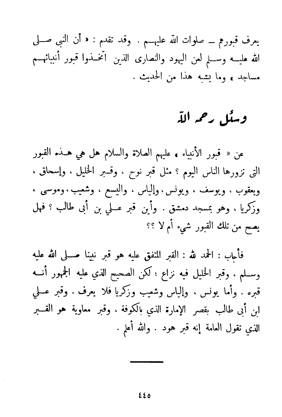 يَعْرِفْ قُبُورَهُمْ - رِضْوَانُ اللَّهِ تَعَالَى عَلَيْهِمْ أَجْمَعِينَ. وَقَدْ تَقَدَّمَ: {أَنَّ النَّبِيَّ صَلَّى اللَّهُ عَلَيْهِ وَسَلَّمَ لَعَنَ الْيَهُودَ وَالنَّصَارَى الَّذِينَ اتَّخَذُوا قُبُورَ أَنْبِيَائِهِمْ مَسَاجِدَ} وَمَا يُشْبِهُ هَذَا مِنْ الْحَدِيثِ.