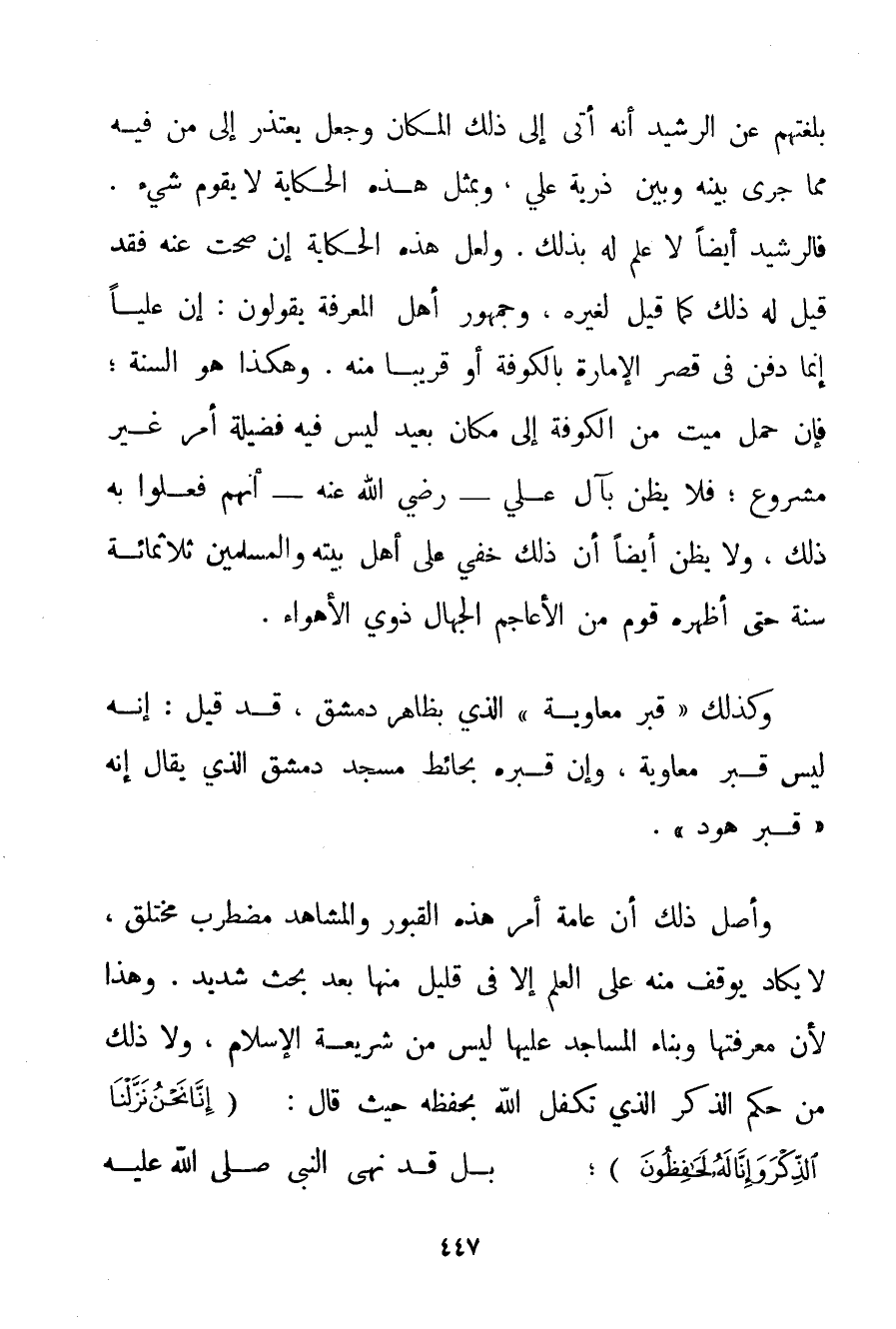 بَلَغَتْهُمْ عَنْ الرَّشِيدِ أَنَّهُ أَتَى إلَى ذَلِكَ الْمَكَانِ وَجَعَلَ يَعْتَذِرُ إلَى مَنْ فِيهِ مِمَّا جَرَى بَيْنَهُ وَبَيْنَ ذُرِّيَّةِ عَلِيٍّ وَبِمِثْلِ هَذِهِ الْحِكَايَةِ لَا يَقُومُ شَيْءٌ. فَالرَّشِيدُ أَيْضًا لَا عِلْمَ لَهُ بِذَلِكَ. وَلَعَلَّ هَذِهِ الْحِكَايَةَ إنْ صَحَّتْ عَنْهُ فَقَدْ قِيلَ لَهُ ذَلِكَ كَمَا قِيلَ لِغَيْرِهِ وَجُمْهُورُ أَهْلِ الْمَعْرِفَةِ يَقُولُونَ: إنَّ عَلِيًّا إنَّمَا دُفِنَ فِي قَصْرِ الْإِمَارَةِ بِالْكُوفَةِ أَوْ قَرِيبًا مِنْهُ. وَهَكَذَا هُوَ السُّنَّةُ؛ فَإِنَّ حَمْلَ مَيِّتٍ مِنْ الْكُوفَةِ إلَى مَكَانٍ بَعِيدٍ لَيْسَ فِيهِ فَضِيلَةُ أَمْرٍ غَيْرِ مَشْرُوعٍ؛ فَلَا يُظَنُّ بِآلِ عَلِيٍّ - رَضِيَ اللَّهُ عَنْهُ - أَنَّهُمْ فَعَلُوا بِهِ ذَلِكَ وَلَا يَظُنُّهُ أَيْضًا أَنَّ ذَلِكَ خَفِيَ عَلَى أَهْلِ بَيْتِهِ وَلِلْمُسْلِمِينَ ثَلَاثُمِائَةِ سَنَةٍ حَتَّى أَظْهَرَهُ قَوْمٌ مِنْ الْأَعَاجِمِ الْجُهَّالِ ذَوِي الْأَهْوَاءِ. وَكَذَلِكَ " قَبْرُ مُعَاوِيَةَ " الَّذِي بِظَاهِرِ دِمَشْقَ قَدْ قِيلَ: إنَّهُ لَيْسَ قَبْرَ مُعَاوِيَةَ وَإِنَّ قَبْرَهُ بِحَائِطِ مَسْجِدِ دِمَشْقَ الَّذِي يُقَالُ إنَّهُ " قَبْرُ هُودٍ ". وَأَصْلُ ذَلِكَ أَنَّ عَامَّةَ أَمْرِ هَذِهِ الْقُبُورِ وَالْمَشَاهِدِ مُضْطَرِبٌ مُخْتَلَقٌ لَا يَكَادُ يُوقَفُ مِنْهُ عَلَى الْعِلْمِ إلَّا فِي قَلِيلٍ مِنْهَا بَعْد بَحْثٍ شَدِيدٍ. وَهَذَا لِأَنَّ مَعْرِفَتَهَا وَبِنَاءَ الْمَسَاجِدِ عَلَيْهَا لَيْسَ مِنْ شَرِيعَةِ الْإِسْلَامِ وَلَا ذَلِكَ مِنْ حُكْمِ الذِّكْرِ الَّذِي تَكَفَّلَ اللَّهُ بِحِفْظِهِ حَيْثُ قَالَ: {إنَّا نَحْنُ نَزَّلْنَا الذِّكْرَ وَإِنَّا لَهُ لَحَافِظُونَ} بَلْ قَدْ نَهَى