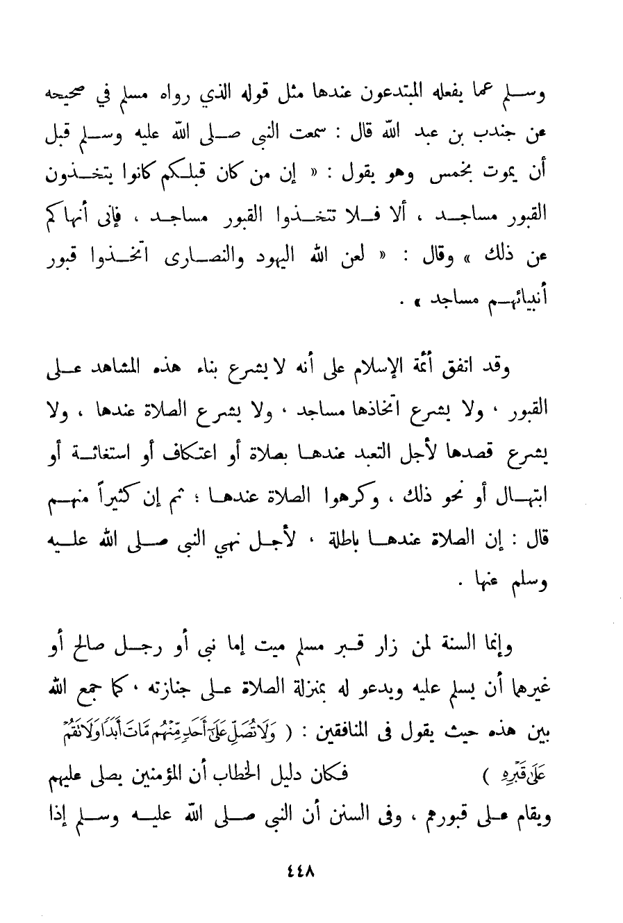وَقَدْ اتَّفَقَ أَئِمَّةُ الْإِسْلَامِ عَلَى أَنَّهُ لَا يُشْرَعُ بِنَاءُ هَذِهِ الْمَشَاهِدِ عَلَى الْقُبُورِ وَلَا يُشْرَعُ اتِّخَاذُهَا مَسَاجِدَ وَلَا يُشْرَعُ الصَّلَاةُ عِنْدَهَا وَلَا يُشْرَعُ قَصْدُهَا لِأَجْلِ التَّعَبُّدِ عِنْدَهَا بِصَلَاةِ أَوْ اعْتِكَافٍ أَوْ اسْتِغَاثَةٍ أَوْ ابْتِهَالٍ أَوْ نَحْوِ ذَلِكَ كَرِهُوا الصَّلَاةَ عِنْدَهَا؛ ثُمَّ إنَّ كَثِيرًا مِنْهُمْ قَالَ: إنَّ الصَّلَاةَ عِنْدَهَا بَاطِلَةٌ لِأَجْلِ نَهْيِ النَّبِيِّ صَلَّى اللَّهُ عَلَيْهِ وَسَلَّمَ عَنْهَا. وَإِنَّمَا السُّنَّةُ لِمَنْ زَارَ قَبْرَ مُسْلِمٍ مَيِّتٍ إمَّا نَبِيٍّ أَوْ رَجُلٍ صَالِحٍ أَوْ غَيْرِهِمَا أَنْ يُسَلِّمَ عَلَيْهِ وَيَدْعُوَ لَهُ بِمَنْزِلَةِ الصَّلَاةِ عَلَى جِنَازَتِهِ كَمَا جَمَعَ اللَّهُ بَيْنَ هَذِهِ حَيْثُ يَقُولُ فِي الْمُنَافِقِينَ: {وَلَا تُصَلِّ عَلَى أَحَدٍ مِنْهُمْ مَاتَ أَبَدًا وَلَا تَقُمْ عَلَى قَبْرِهِ} فَكَانَ دَلِيلُ الْخِطَابِ أَنَّ الْمُؤْمِنِينَ يُصَلَّى عَلَيْهِمْ وَيُقَامُ عَلَى قُبُورِهِمْ وَفِي السُّنَنِ {أَنَّ النَّبِيَّ صَلَّى اللَّهُ عَلَيْهِ وَسَلَّمَ إذَا