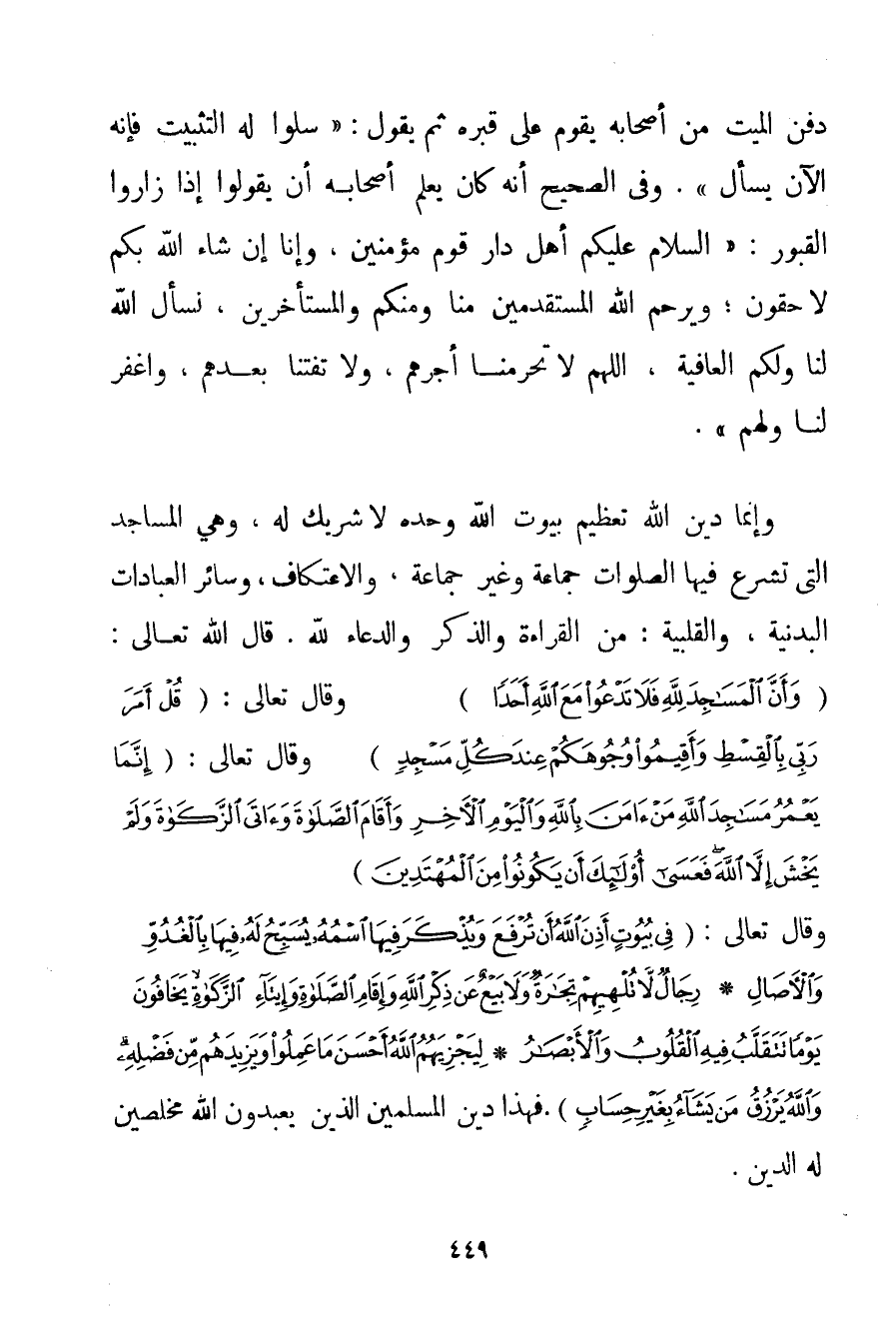 دَفَنَ الْمَيِّتَ مِنْ أَصْحَابِهِ يَقُومُ عَلَى قَبْرِهِ ثُمَّ يَقُولُ: سَلُوا لَهُ التَّثْبِيتَ فَإِنَّهُ الْآنَ يُسْأَلُ} . وَفِي الصَّحِيحِ أَنَّهُ كَانَ يُعَلِّمُ أَصْحَابَهُ أَنْ يَقُولُوا إذَا زَارُوا الْقُبُورَ: {السَّلَامُ عَلَيْكُمْ أَهْلَ دَارِ قَوْمٍ مُؤْمِنِينَ وَإِنَّا إنْ شَاءَ اللَّهُ بِكُمْ لَاحِقُونَ؛ وَيَرْحَمُ اللَّهُ الْمُسْتَقْدِمِينَ مِنَّا وَمِنْكُمْ وَالْمُسْتَأْخِرِين نَسْأَلُ اللَّهَ لَنَا وَلَكُمْ الْعَافِيَةَ اللَّهُمَّ لَا تَحْرِمْنَا أَجْرَهُمْ وَلَا تَفْتِنَّا بَعْدَهُمْ وَاغْفِرْ لَنَا وَلَهُمْ} . وَإِنَّمَا دِينُ اللَّهِ تَعْظِيمُ بُيُوتِ اللَّهِ وَحْدَهُ لَا شَرِيكَ لَهُ وَهِيَ الْمَسَاجِدُ الَّتِي تُشْرَعُ فِيهَا الصَّلَوَاتُ جَمَاعَةً وَغَيْرَ جَمَاعَةٍ وَالِاعْتِكَافُ وَسَائِرُ الْعِبَادَاتِ الْبَدَنِيَّةِ وَالْقَلْبِيَّةِ: مِنْ الْقِرَاءَةِ وَالذِّكْرِ وَالدُّعَاءِ لِلَّهِ. قَالَ اللَّهُ تَعَالَى: {وَأَنَّ الْمَسَاجِدَ لِلَّهِ فَلَا تَدْعُوا مَعَ اللَّهِ أَحَدًا} وَقَالَ تَعَالَى: {قُلْ أَمَرَ رَبِّي بِالْقِسْطِ وَأَقِيمُوا وُجُوهَكُمْ عِنْدَ كُلِّ مَسْجِدٍ} وَقَالَ تَعَالَى: {إنَّمَا يَعْمُرُ مَسَاجِدَ اللَّهِ مَنْ آمَنَ بِاللَّهِ وَالْيَوْمِ الْآخِرِ وَأَقَامَ الصَّلَاةَ وَآتَى الزَّكَاةَ وَلَمْ يَخْشَ إلَّا اللَّهَ فَعَسَى أُولَئِكَ أَنْ يَكُونُوا مِنَ الْمُهْتَدِينَ} وَقَالَ تَعَالَى: {فِي بُيُوتٍ أَذِنَ اللَّهُ أَنْ تُرْفَعَ وَيُذْكَرَ فِيهَا اسْمُهُ يُسَبِّحُ لَهُ فِيهَا بِالْغُدُوِّ وَالْآصَالِ} {رِجَالٌ لَا تُلْهِيهِمْ تِجَارَةٌ وَلَا بَيْعٌ عَنْ ذِكْرِ اللَّهِ وَإِقَامِ الصَّلَاةِ وَإِيتَاءِ الزَّكَاةِ يَخَافُونَ يَوْمًا تَتَقَلَّبُ فِيهِ الْقُلُوبُ وَالْأَبْصَارُ} {لِيَجْزِيَهُمُ اللَّهُ أَحْسَنَ مَا عَمِلُوا وَيَزِيدَهُمْ مِنْ فَضْلِهِ وَاللَّهُ يَرْزُقُ مَنْ يَشَاءُ بِغَيْرِ حِسَابٍ} . فَهَذَا دِينُ الْمُسْلِمِينَ الَّذِينَ يَعْبُدُونَ اللَّهَ مُخْلِصِينَ لَهُ الدِّينَ.