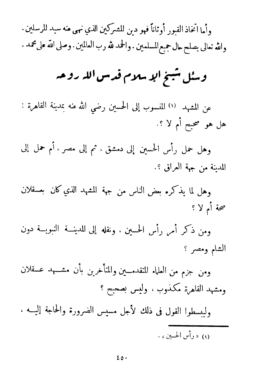 عَنْ الْمَشْهَدِ الْمَنْسُوبِ إلَى الْحُسَيْنِ رَضِيَ اللَّهُ عَنْهُ بِمَدِينَةِ الْقَاهِرَةِ: هَلْ هُوَ صَحِيحٌ أَمْ لَا؟ . وَهَلْ حُمِلَ رَأْسُ الْحُسَيْنِ إلَى دِمَشْقَ ثُمَّ إلَى مِصْرَ أَمْ حُمِلَ إلَى الْمَدِينَةِ مِنْ جِهَةِ الْعِرَاقِ؟ . وَهَلْ لِمَا يَذْكُرُهُ بَعْضُ النَّاسِ مِنْ جِهَةِ الْمَشْهَدِ الَّذِي كَانَ بِعَسْقَلَانَ صِحَّةٌ أَمْ لَا؟ وَمَنْ ذَكَرَ أَمْرَ رَأْسِ الْحُسَيْنِ وَنَقَلَهُ إلَى الْمَدِينَةِ النَّبَوِيَّةِ دُونَ الشَّامِ وَمِصْرَ؟ وَمَنْ جَزَمَ مِنْ الْعُلَمَاءِ الْمُتَقَدِّمِينَ والمتأخرين بِأَنَّ مَشْهَدَ عَسْقَلَانَ وَمَشْهَدَ الْقَاهِرَةِ مَكْذُوبٌ وَلَيْسَ بِصَحِيحِ؟ وَلْيَبْسُطُوا الْقَوْلَ فِي ذَلِكَ لِأَجْلِ مَسِيسِ الضَّرُورَةِ وَالْحَاجَةِ إلَيْهِ