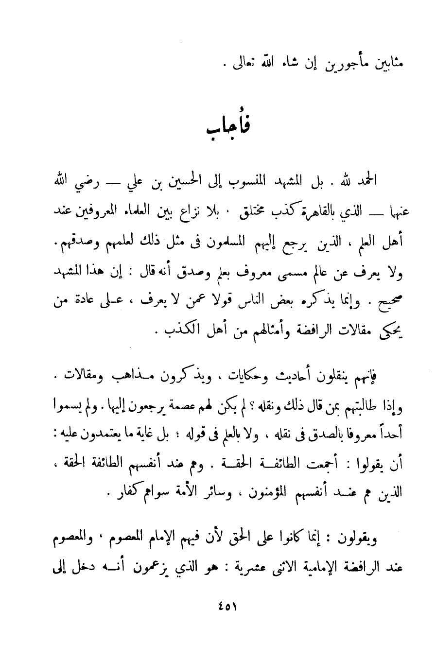 الْحَمْدُ لِلَّهِ، بَلْ الْمَشْهَدُ الْمَنْسُوبُ إلَى الْحُسَيْنِ بْنِ عَلِيٍّ - رَضِيَ اللَّهُ عَنْهُمَا - الَّذِي بِالْقَاهِرَةِ كَذِبٌ مُخْتَلَقٌ بِلَا نِزَاعٍ بَيْنَ الْعُلَمَاءِ الْمَعْرُوفِينَ عِنْدَ أَهْلِ الْعِلْمِ الَّذِينَ يَرْجِعُ إلَيْهِمْ الْمُسْلِمُونَ فِي مِثْلِ ذَلِكَ لِعِلْمِهِمْ وَصِدْقِهِمْ. وَلَا يُعْرَفُ عَنْ عَالِمٍ مُسَمًّى مَعْرُوفٍ بِعِلْمِ وَصِدْقٍ أَنَّهُ قَالَ: إنَّ هَذَا الْمَشْهَدَ صَحِيحٌ. وَإِنَّمَا يَذْكُرُهُ بَعْضُ النَّاسِ قَوْلًا عَمَّنْ لَا يُعْرَفُ عَلَى عَادَةِ مَنْ يَحْكِي مَقَالَاتِ الرَّافِضَةِ وَأَمْثَالِهِمْ مِنْ أَهْلِ الْكَذِبِ. فَإِنَّهُمْ يَنْقُلُونَ أَحَادِيثَ وَحِكَايَاتٍ وَيَذْكُرُونَ مَذَاهِبَ وَمَقَالَاتٍ. وَإِذَا طَالَبْتهمْ بِمَنْ قَالَ ذَلِكَ وَنَقَلَهُ؟ لَمْ يَكُنْ لَهُمْ عِصْمَةٌ يَرْجِعُونَ إلَيْهَا. وَلَمْ يُسَمُّوا أَحَدًا مَعْرُوفًا بِالصِّدْقِ فِي نَقْلِهِ وَلَا بِالْعِلْمِ فِي قَوْلِهِ؛ بَلْ غَايَةُ مَا يَعْتَمِدُونَ عَلَيْهِ: أَنْ يَقُولُوا: أَجْمَعَتْ الطَّائِفَةُ الْحَقَّةُ. وَهُمْ عِنْدَ أَنْفُسِهِمْ الطَّائِفَةُ الْحَقَّةُ الَّذِينَ هُمْ عِنْدَ أَنْفُسِهِمْ الْمُؤْمِنُونَ وَسَائِرُ الْأُمَّةِ سِوَاهُمْ كُفَّارٌ. وَيَقُولُونَ: إنَّمَا كَانُوا عَلَى الْحَقِّ لِأَنَّ فِيهِمْ الْإِمَامَ الْمَعْصُومَ وَالْمَعْصُومُ عِنْدَ الرَّافِضَةِ الْإِمَامِيَّةِ الِاثْنَا عَشْرِيَّةِ: هُوَ الَّذِي يَزْعُمُونَ أَنَّهُ دَخَلَ إلَى