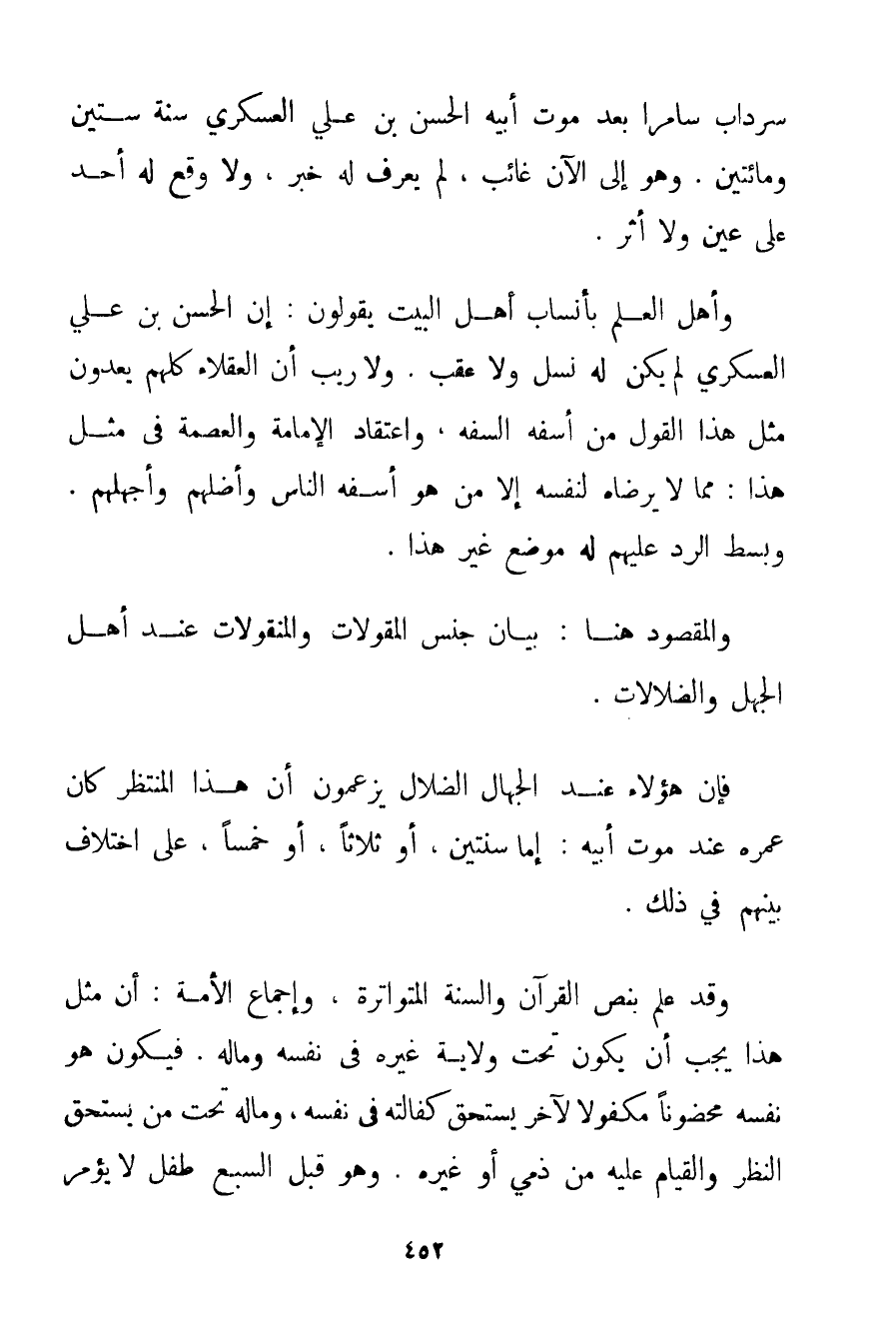 سِرْدَابِ سَامِرَا بَعْدَ مَوْتِ أَبِيهِ الْحَسَنِ بْنِ عَلِيٍّ الْعَسْكَرِيِّ سَنَةَ سِتِّينَ وَمِائَتَيْنِ. وَهُوَ إلَى الْآنَ غَائِبٌ لَمْ يُعْرَفْ لَهُ خَبَرٌ وَلَا وَقَعَ لَهُ أَحَدٌ عَلَى عَيْنٍ وَلَا أَثَرٍ. وَأَهْلُ الْعِلْمِ بِأَنْسَابِ أَهْلِ الْبَيْتِ يَقُولُونَ: إنَّ الْحَسَنَ بْنَ عَلِيٍّ الْعَسْكَرِيَّ لَمْ يَكُنْ لَهُ نَسْلٌ وَلَا عَقِبٌ. وَلَا رَيْبَ أَنَّ الْعُقَلَاءَ كُلَّهُمْ يَعُدُّونَ مِثْلَ هَذَا الْقَوْلِ مِنْ أَسْفَهِ السَّفَهِ وَاعْتِقَادُ الْإِمَامَةِ وَالْعِصْمَةِ فِي مِثْلِ هَذَا: مِمَّا لَا يَرْضَاهُ لِنَفْسِهِ إلَّا مَنْ هُوَ أَسْفَهُ النَّاسِ وَأَضَلُّهُمْ وَأَجْهَلُهُمْ. وَبَسْطُ الرَّدِّ عَلَيْهِمْ لَهُ مَوْضِعٌ غَيْرُ هَذَا. وَالْمَقْصُودُ هُنَا: بَيَانُ جِنْسِ الْمَقُولَاتِ وَالْمَنْقُولَاتِ عِنْدَ أَهْلِ الْجَهْلِ وَالضَّلَالَاتِ. فَإِنَّ هَؤُلَاءِ عِنْدَ الْجُهَّالِ الضُّلَّالِ يَزْعُمُونَ أَنَّ هَذَا الْمُنْتَظَرَ كَانَ عُمْرُهُ عِنْدَ مَوْتِ أَبِيهِ: إمَّا سَنَتَيْنِ أَوْ ثَلَاثًا أَوْ خَمْسًا عَلَى اخْتِلَافٍ بَيْنِهِمْ فِي ذَلِكَ. وَقَدْ عُلِمَ بِنَصِّ الْقُرْآنِ وَالسُّنَّةِ الْمُتَوَاتِرَةِ وَإِجْمَاعِ الْأُمَّةِ: أَنَّ مِثْلَ هَذَا يَجِبُ أَنْ يَكُونَ تَحْتَ وِلَايَةِ غَيْرِهِ فِي نَفْسِهِ وَمَالِهِ. فَيَكُونُ هُوَ نَفْسُهُ مَحْضُونًا مَكْفُولًا لِآخَرَ يَسْتَحِقُّ كَفَالَتَهُ فِي نَفْسِهِ وَمَالِهِ تَحْتَ مَنْ يَسْتَحِقُّ النَّظَرَ وَالْقِيَامَ عَلَيْهِ مِنْ ذِمِّيٍّ أَوْ غَيْرِهِ. وَهُوَ قَبْلَ السَّبْعِ طِفْلٌ لَا يُؤْمَرُ