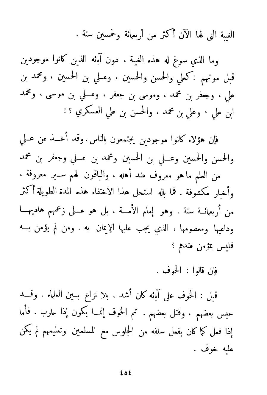 الْغَيْبَةَ الَّتِي لَهَا الْآنَ أَكْثَرُ مِنْ أَرْبَعِمِائَةٍ وَخَمْسِينَ سَنَةٍ. وَمَا الَّذِي سَوَّغَ لَهُ هَذِهِ الْغَيْبَةَ دُونَ آبَائِهِ الَّذِينَ كَانُوا مَوْجُودِينَ قَبْلَ مَوْتِهِمْ: كَعَلِيِّ وَالْحَسَنِ وَالْحُسَيْنِ وَعَلِيِّ بْنِ الْحُسَيْنِ وَمُحَمَّدِ بْنِ عَلِيٍّ وَجَعْفَرِ بْنِ مُحَمَّدٍ وَمُوسَى بْنِ جَعْفَرٍ وَعَلِيِّ بْنِ مُوسَى وَمُحَمَّدِ بْنِ عَلِيٍّ وَعَلِيِّ بْنِ مُحَمَّدٍ وَالْحَسَنِ بْنِ عَلِيٍّ الْعَسْكَرِيِّ فَإِنَّ هَؤُلَاءِ كَانُوا مَوْجُودِينَ يَجْتَمِعُونَ بِالنَّاسِ. وَقَدْ أُخِذَ عَنْ عَلِيٍّ وَالْحَسَنِ وَالْحُسَيْنِ وَعَلِيِّ بْنِ الْحُسَيْنِ وَمُحَمَّدِ بْنِ عَلِيٍّ وَجَعْفَرِ بْنِ مُحَمَّدٍ - مِنْ الْعِلْمِ مَا هُوَ مَعْرُوفٌ عِنْدَ أَهْلِهِ وَالْبَاقُونَ لَهُمْ سِيَرٌ مَعْرُوفَةٌ وَأَخْبَارٌ مَكْشُوفَةٌ. فَمَا بَالُهُ اسْتَحَلَّ هَذَا الِاخْتِفَاءَ هَذِهِ الْمُدَّةَ الطَّوِيلَةَ أَكْثَرَ مِنْ أَرْبَعِمِائَةِ سَنَةٍ. وَهُوَ إمَامُ الْأُمَّةِ بَلْ هُوَ عَلَى زَعْمِهِمْ هَادِيهَا وَدَاعِيهَا وَمَعْصُومُهَا الَّذِي يَجِبُ عَلَيْهَا الْإِيمَانُ بِهِ. وَمَنْ لَمْ يُؤْمِنْ بِهِ فَلَيْسَ بِمُؤْمِنِ عِنْدَهُمْ؟ فَإِنْ قَالُوا: الْخَوْفُ. قِيلَ: الْخَوْفُ عَلَى آبَائِهِ كَانَ أَشَدَّ بِلَا نِزَاعٍ بَيْنَ الْعُلَمَاءِ. وَقَدْ حُبِسَ بَعْضُهُمْ وَقُتِلَ بَعْضُهُمْ. ثُمَّ الْخَوْفُ إنَّمَا يَكُونُ إذَا حَارَبَ. فَأَمَّا إذَا فَعَلَ كَمَا كَانَ يَفْعَلُ سَلَفُهُ مِنْ الْجُلُوسِ مَعَ الْمُسْلِمِينَ وَتَعْلِيمِهِمْ لَمْ يَكُنْ عَلَيْهِ خَوْفٌ.