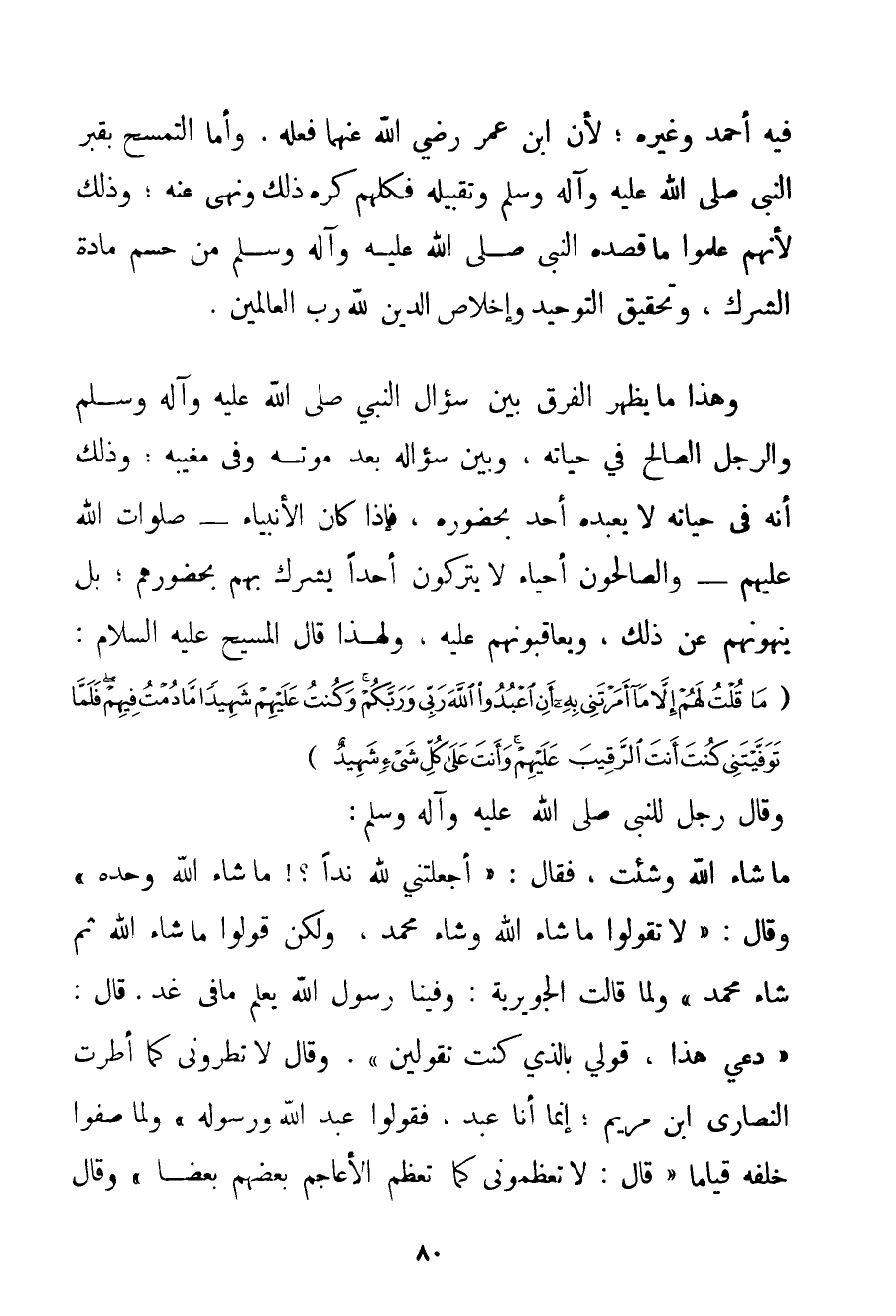فِيهِ أَحْمَد وَغَيْرُهُ؛ لِأَنَّ ابْنَ عُمَرَ رَضِيَ اللَّهُ عَنْهُمَا فَعَلَهُ. وَأَمَّا التَّمَسُّحُ بِقَبْرِ النَّبِيِّ صَلَّى اللَّهُ عَلَيْهِ وَآلِهِ وَسَلَّمَ وَتَقْبِيلُهُ فَكُلُّهُمْ كَرِهَ ذَلِكَ وَنَهَى عَنْهُ؛ وَذَلِكَ لِأَنَّهُمْ عَلِمُوا مَا قَصَدَهُ النَّبِيُّ صَلَّى اللَّهُ عَلَيْهِ وَآلِهِ وَسَلَّمَ مِنْ حَسْمِ مَادَّةِ الشِّرْكِ وَتَحْقِيقِ التَّوْحِيدِ وَإِخْلَاصِ الدِّينِ لِلَّهِ رَبِّ الْعَالَمِينَ. وَهَذَا مَا يُظْهِرُ الْفَرْقَ بَيْنَ سُؤَالِ النَّبِيِّ صَلَّى اللَّهُ عَلَيْهِ وَآلِهِ وَسَلَّمَ وَالرَّجُلِ الصَّالِحِ فِي حَيَاتِهِ وَبَيْنَ سُؤَالِهِ بَعْدَ مَوْتِهِ وَفِي مَغِيبِهِ؛ وَذَلِكَ أَنَّهُ فِي حَيَاتِهِ لَا يَعْبُدُهُ أَحَدٌ بِحُضُورِهِ فَإِذَا كَانَ الْأَنْبِيَاءُ - رِضْوَانُ اللَّهِ تَعَالَى عَلَيْهِمْ أَجْمَعِينَ - وَالصَّالِحُونَ أَحْيَاءً لَا يَتْرُكُونَ أَحَدًا يُشْرِكُ بِهِمْ بِحُضُورِهِمْ؛ بَلْ يَنْهَوْنَهُمْ عَنْ ذَلِكَ وَيُعَاقِبُونَهُمْ عَلَيْهِ وَلِهَذَا قَالَ الْمَسِيحُ عَلَيْهِ السَّلَامُ {مَا قُلْتُ لَهُمْ إلَّا مَا أَمَرْتَنِي بِهِ أَنِ اعْبُدُوا اللَّهَ رَبِّي وَرَبَّكُمْ وَكُنْتُ عَلَيْهِمْ شَهِيدًا مَا دُمْتُ فِيهِمْ فَلَمَّا تَوَفَّيْتَنِي كُنْتَ أَنْتَ الرَّقِيبَ عَلَيْهِمْ وَأَنْتَ عَلَى كُلِّ شَيْءٍ شَهِيدٌ} {وَقَالَ رَجُلٌ لِلنَّبِيِّ صَلَّى اللَّهُ عَلَيْهِ وَآلِهِ وَسَلَّمَ مَا شَاءَ اللَّهُ وَشِئْت فَقَالَ: أَجَعَلْتَنِي لِلَّهِ نِدًّا مَا شَاءَ اللَّهُ وَحْدَهُ} وَقَالَ: " {لَا تَقُولُوا مَا شَاءَ اللَّهُ وَشَاءَ مُحَمَّدٌ وَلَكِنْ قُولُوا مَا شَاءَ اللَّهُ ثُمَّ شَاءَ مُحَمَّدٌ} وَلَمَّا قَالَتْ الجويرية: {وَفِينَا رَسُولُ اللَّهِ يَعْلَمُ مَا فِي غَد. قَالَ: دَعِي هَذَا قُولِي بِاَلَّذِي كُنْت تَقُولِينَ} . وَقَالَ لَا تُطْرُونِي كَمَا أَطْرَتْ النَّصَارَى ابْنَ مَرْيَمَ؛ إنَّمَا أَنَا عَبْدٌ فَقُولُوا عَبْدُ اللَّهِ وَرَسُولُهُ " {وَلَمَّا صُفُّوا خَلْفَهُ قِيَامًا قَالَ: لَا تُعَظِّمُونِي كَمَا تُعَظِّمُ الْأَعَاجِمُ بَعْضُهُمْ بَعْضًا} وَقَالَ