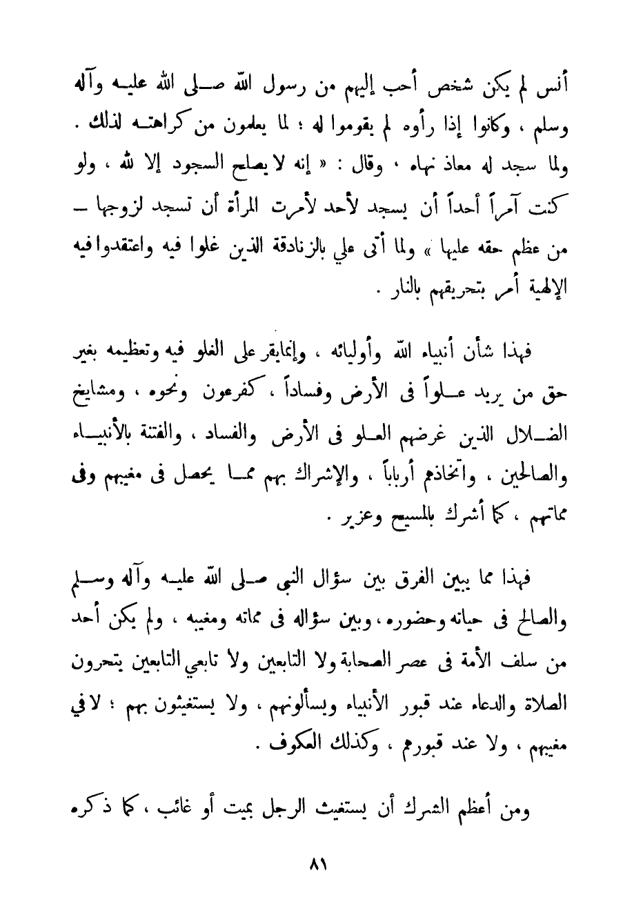 أَنَسٌ لَمْ يَكُنْ شَخْصٌ أَحَبَّ إلَيْهِمْ مِنْ رَسُولِ اللَّهِ صَلَّى اللَّهُ عَلَيْهِ وَآلِهِ وَسَلَّمَ وَكَانُوا إذَا رَأَوْهُ لَمْ يَقُومُوا لَهُ؛ لِمَا يَعْلَمُونَ مِنْ كَرَاهَتِهِ لِذَلِكَ. وَلَمَّا سَجَدَ لَهُ مُعَاذٌ نَهَاهُ وَقَالَ: " {إنَّهُ لَا يَصْلُحُ السُّجُودُ إلَّا لِلَّهِ وَلَوْ كُنْت آمِرًا أَحَدًا أَنْ يَسْجُدَ لِأَحَدِ لَأَمَرْت الْمَرْأَةَ أَنْ تَسْجُدَ لِزَوْجِهَا - مَنْ عِظَمِ حَقِّهِ عَلَيْهَا} وَلَمَّا أُتِيَ عَلِيٌّ بِالزَّنَادِقَةِ الَّذِينَ غَلَوْا فِيهِ وَاعْتَقَدُوا فِيهِ الْإِلَهِيَّةَ أَمَرَ بِتَحْرِيقِهِمْ بِالنَّارِ. فَهَذَا شَأْنُ أَنْبِيَاءِ اللَّهِ وَأَوْلِيَائِهِ وَإِنَّمَا يُقِرُّ عَلَى الْغُلُوِّ فِيهِ وَتَعْظِيمِهِ بِغَيْرِ حَقٍّ مَنْ يُرِيدُ عُلُوًّا فِي الْأَرْضِ وَفَسَادًا كَفِرْعَوْنَ وَنَحْوِهِ وَمَشَايِخِ الضَّلَالِ الَّذِينَ غَرَضُهُمْ الْعُلُوُّ فِي الْأَرْضِ وَالْفَسَادُ وَالْفِتْنَةُ بِالْأَنْبِيَاءِ وَالصَّالِحِينَ وَاِتِّخَاذُهُمْ أَرْبَابًا وَالْإِشْرَاكُ بِهِمْ مِمَّا يَحْصُلُ فِي مَغِيبِهِمْ وَفِي مَمَاتِهِمْ كَمَا أُشْرِكُ بِالْمَسِيحِ وَعُزَيْرٍ. فَهَذَا مِمَّا يُبَيِّنُ الْفَرْقَ بَيْنَ سُؤَالِ النَّبِيِّ صَلَّى اللَّهُ عَلَيْهِ وَآلِهِ وَسَلَّمَ وَالصَّالِحِ فِي حَيَاتِهِ وَحُضُورِهِ وَبَيْنَ سُؤَالِهِ فِي مَمَاتِهِ وَمَغِيبِهِ وَلَمْ يَكُنْ أَحَدٌ مِنْ سَلَفِ الْأُمَّةِ فِي عَصْرِ الصَّحَابَةِ وَلَا التَّابِعِينَ وَلَا تَابِعِي التَّابِعِينَ يَتَحَرَّوْنَ الصَّلَاةَ وَالدُّعَاءَ عِنْدَ قُبُورِ الْأَنْبِيَاءِ وَيَسْأَلُونَهُمْ وَلَا يَسْتَغِيثُونَ بِهِمْ؛ لَا فِي مَغِيبِهِمْ وَلَا عِنْدَ قُبُورِهِمْ وَكَذَلِكَ الْعُكُوفُ.