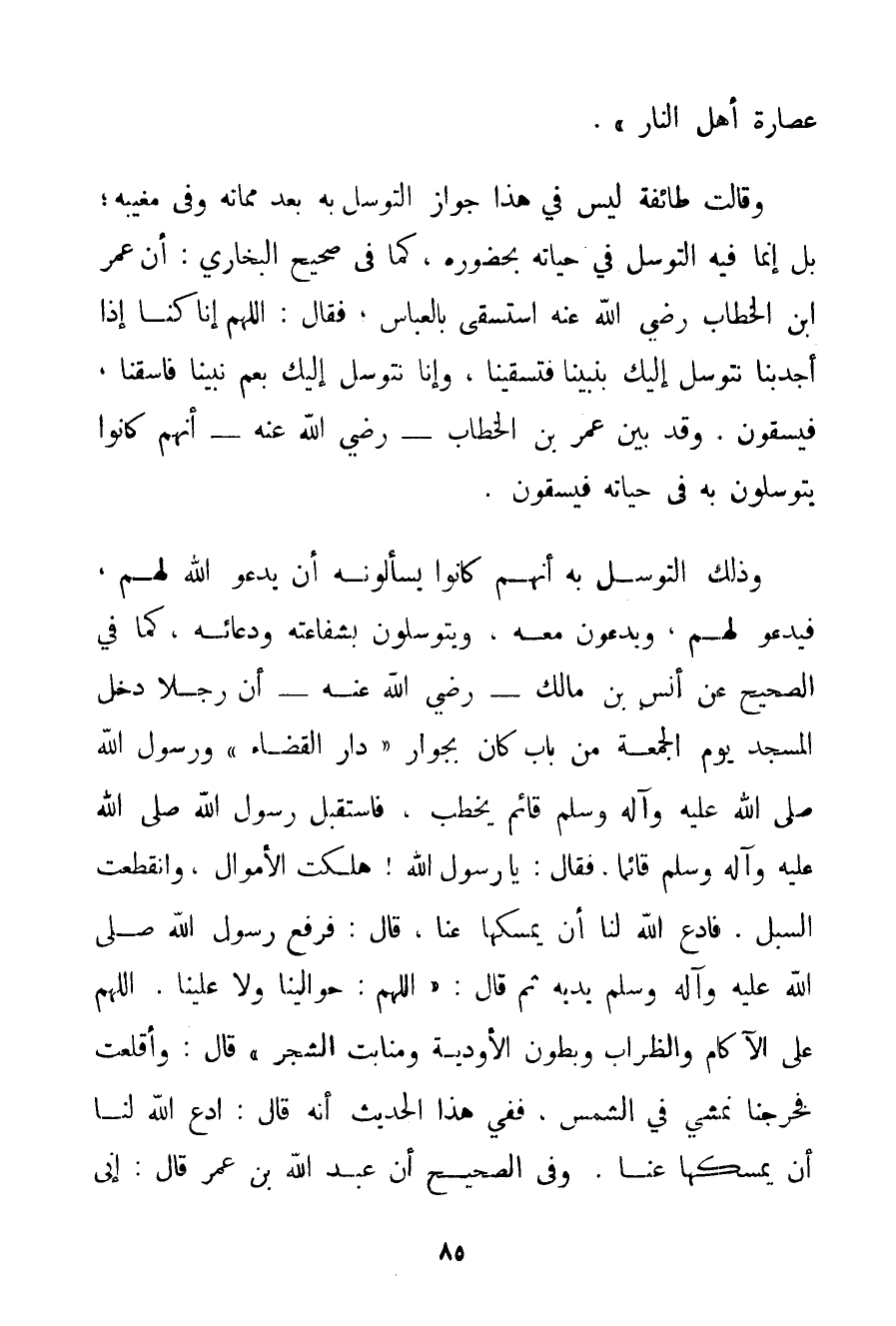 {عُصَارَةُ أَهْلِ النَّارِ} . وَقَالَتْ طَائِفَةٌ لَيْسَ فِي هَذَا جَوَازُ التَّوَسُّلِ بِهِ بَعْدَ مَمَاتِهِ وَفِي مَغِيبِهِ؛ بَلْ إنَّمَا فِيهِ التَّوَسُّلُ فِي حَيَاتِهِ بِحُضُورِهِ كَمَا فِي صَحِيحِ الْبُخَارِيِّ: أَنَّ عُمَرَ بْنَ الْخَطَّابِ رَضِيَ اللَّهُ عَنْهُ اسْتَسْقَى بِالْعَبَّاسِ فَقَالَ: اللَّهُمَّ إنَّا كُنَّا إذَا أَجْدَبْنَا نَتَوَسَّلُ إلَيْك بِنَبِيِّنَا فَتَسْقِيَنَا وَإِنَّا نَتَوَسَّلُ إلَيْك بِعَمِّ نَبِيِّنَا فَاسْقِنَا فَيُسْقَوْنَ. وَقَدْ بَيَّنَ عُمَرُ بْنُ الْخَطَّابِ - رَضِيَ اللَّهُ عَنْهُ - أَنَّهُمْ كَانُوا يَتَوَسَّلُونَ بِهِ فِي حَيَاتِهِ فَيُسْقَوْنَ. وَذَلِكَ التَّوَسُّلُ بِهِ أَنَّهُمْ كَانُوا يَسْأَلُونَهُ أَنْ يَدْعُوَ اللَّهُ لَهُمْ فَيَدْعُو لَهُمْ وَيَدْعُونَ مَعَهُ وَيَتَوَسَّلُونَ بِشَفَاعَتِهِ وَدُعَائِهِ كَمَا فِي الصَّحِيحِ عَنْ أَنَسِ بْنِ مَالِكٍ - رَضِيَ اللَّهُ عَنْهُ - {أَنَّ رَجُلًا دَخَلَ الْمَسْجِدَ يَوْمَ الْجُمْعَةِ مِنْ بَابٍ كَانَ بِجِوَارِ دَارِ الْقَضَاءِ وَرَسُولُ اللَّهِ صَلَّى اللَّهُ عَلَيْهِ وَآلِهِ وَسَلَّمَ قَائِمٌ يَخْطُبُ فَاسْتَقْبَلَ رَسُولَ اللَّهِ صَلَّى اللَّهُ عَلَيْهِ وَآلِهِ وَسَلَّمَ قَائِمًا فَقَالَ: يَا رَسُولَ اللَّهِ هَلَكَتْ الْأَمْوَالُ وَانْقَطَعَتْ السُّبُلُ. فَادْعُ اللَّهَ لَنَا أَنْ يُمْسِكَهَا عَنَّا قَالَ: فَرَفَعَ رَسُولُ اللَّهِ صَلَّى اللَّهُ عَلَيْهِ وَآلِهِ وَسَلَّمَ يَدَيْهِ ثُمَّ قَالَ: اللَّهُمَّ: حَوَالَيْنَا وَلَا عَلَيْنَا. اللَّهُمَّ عَلَى الْآكَامِ وَالظِّرَابِ وَبُطُونِ الْأَوْدِيَةِ وَمَنَابِتِ الشَّجَرِ قَالَ: وَأَقْلَعَتْ فَخَرَجْنَا نَمْشِي فِي الشَّمْسِ} فَفِي هَذَا الْحَدِيثِ أَنَّهُ قَالَ: اُدْعُ اللَّهَ لَنَا أَنْ يُمْسِكَهَا عَنَّا. وَفِي الصَّحِيحِ أَنَّ عَبْدَ اللَّهِ بْنَ عُمَرَ قَالَ: إنِّي