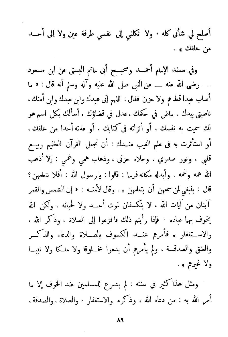أَصْلِحْ لِي شَأْنِي كُلَّهُ وَلَا تَكِلْنِي إلَى نَفْسِي طَرْفَةَ عَيْنٍ وَلَا إلَى أَحَدٍ مِنْ خَلْقِك} . وَفِي مُسْنَدِ الْإِمَامِ أَحْمَد وَصَحِيحِ أَبِي حَاتِمٍ البستي عَنْ ابْنِ مَسْعُودٍ - رَضِيَ اللَّهُ عَنْهُ - عَنْ النَّبِيِّ صَلَّى اللَّهُ عَلَيْهِ وَآلِهِ وَسَلَّمَ أَنَّهُ قَالَ: " {مَا أَصَابَ عَبْدًا قَطُّ هَمٌّ وَلَا حَزَنٌ فَقَالَ: اللَّهُمَّ إنِّي عَبْدُك وَابْنُ عَبْدِك وَابْنُ أَمَتِك نَاصِيَتِي بِيَدِك مَاضٍ فِيَّ حُكْمُك عَدْلٌ فِيَّ قَضَاؤُك أَسْأَلُك بِكُلِّ اسْمٍ هُوَ لَك سَمَّيْت بِهِ نَفْسَك أَوْ أَنْزَلْته فِي كِتَابِك أَوْ عَلَّمْته أَحَدًا مِنْ خَلْقِك أَوْ اسْتَأْثَرْت بِهِ فِي عِلْمِ الْغَيْبِ عِنْدَك: أَنْ تَجْعَلَ الْقُرْآنَ الْعَظِيمَ رَبِيعَ قَلْبِي وَنُورَ صَدْرِي وَجَلَاءَ حُزْنِي وَذَهَابَ هَمِّي وَغَمِّي: إلَّا أَذْهَبُ اللَّهُ هَمَّهُ وَغَمَّهُ وَأَبْدَلَهُ مَكَانَهُ فَرَحًا: قَالُوا: يَا رَسُولَ اللَّهِ: أَفَلَا نَتَعَلَّمُهُنَّ؟ قَالَ: يَنْبَغِي لِمَنْ سَمِعَهُنَّ أَنْ يَتَعَلَّمَهُنَّ} . وَقَالَ لِأُمَّتِهِ: " {إنَّ الشَّمْسَ وَالْقَمَرَ آيَتَانِ مِنْ آيَاتِ اللَّهِ لَا يَنْكَسِفَانِ لِمَوْتِ أَحَدٍ وَلَا لِحَيَاتِهِ وَلَكِنَّ اللَّهَ يُخَوِّفُ بِهِمَا عِبَادَهُ فَإِذَا رَأَيْتُمْ ذَلِكَ فَافْزَعُوا إلَى الصَّلَاةِ وَذِكْرِ اللَّهِ وَالِاسْتِغْفَارِ} فَأَمَرَهُمْ عِنْدَ الْكُسُوفِ بِالصَّلَاةِ وَالدُّعَاءِ وَالذِّكْرِ وَالْعِتْقِ وَالصَّدَقَةِ وَلَمْ يَأْمُرْهُمْ أَنْ يَدْعُوَا مَخْلُوقًا وَلَا مَلَكًا وَلَا نَبِيًّا وَلَا غَيْرَهُمْ ". وَمِثْلُ هَذَا كَثِيرٌ فِي سُنَّتِهِ: لَمْ يُشْرَعْ لِلْمُسْلِمِينَ عِنْدَ الْخَوْفِ إلَّا مَا أَمَرَ اللَّهُ بِهِ: مِنْ دُعَاءِ اللَّهِ وَذِكْرِهِ وَالِاسْتِغْفَارِ وَالصَّلَاةِ وَالصَّدَقَةِ