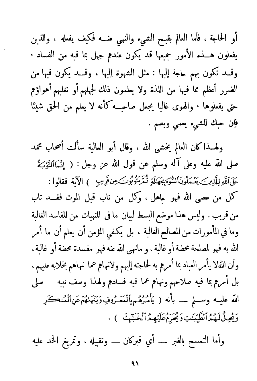 أَوْ الْحَاجَةُ فَأَمَّا الْعَالِمُ بِقُبْحِ الشَّيْءِ وَالنَّهْيِ عَنْهُ فَكَيْفَ يَفْعَلُهُ وَاَلَّذِينَ يَفْعَلُونَ هَذِهِ الْأُمُورَ جَمِيعَهَا قَدْ يَكُونُ عِنْدَهُمْ جَهْلٌ بِمَا فِيهِ مِنْ الْفَسَادِ وَقَدْ تَكُونُ بِهِمْ حَاجَةٌ إلَيْهَا: مِثْلُ الشَّهْوَةِ إلَيْهَا وَقَدْ يَكُونُ فِيهَا مِنْ الضَّرَرِ أَعْظَمُ مِمَّا فِيهَا مِنْ اللَّذَّةِ وَلَا يَعْلَمُونَ ذَلِكَ لِجَهْلِهِمْ أَوْ تَغْلِبُهُمْ أَهْوَاؤُهُمْ حَتَّى يَفْعَلُوهَا وَالْهَوَى غَالِبًا يَجْعَلُ صَاحِبَهُ كَأَنَّهُ لَا يَعْلَمُ مِنْ الْحَقِّ شَيْئًا فَإِنَّ حُبَّك لِلشَّيْءِ يُعْمِي وَيُصِمُّ. وَلِهَذَا كَانَ الْعَالِمُ يَخْشَى اللَّهَ وَقَالَ أَبُو الْعَالِيَةِ سَأَلْت أَصْحَابَ مُحَمَّدٍ صَلَّى اللَّهُ عَلَيْهِ وَعَلَى آلِهِ وَسَلَّمَ عَنْ قَوْلِ اللَّهِ عَزَّ وَجَلَّ: {إنَّمَا التَّوْبَةُ عَلَى اللَّهِ لِلَّذِينَ يَعْمَلُونَ السُّوءَ بِجَهَالَةٍ ثُمَّ يَتُوبُونَ مِنْ قَرِيبٍ} الْآيَةُ فَقَالُوا: كُلُّ مَنْ عَصَى اللَّهَ فَهُوَ جَاهِلٌ وَكُلُّ مَنْ تَابَ قَبْلَ الْمَوْتِ فَقَدْ تَابَ مِنْ قَرِيبٍ. وَلَيْسَ هَذَا مَوْضِعَ الْبَسْطِ لِبَيَانِ مَا فِي الْمَنْهِيَّاتِ مِنْ الْمَفَاسِدِ الْغَالِبَةِ وَمَا فِي الْمَأْمُورَاتِ مِنْ الْمَصَالِحِ الْغَالِبَةِ بَلْ يَكْفِي الْمُؤْمِنَ أَنْ يَعْلَمَ أَنَّ مَا أَمَرَ اللَّهُ بِهِ فَهُوَ لِمَصْلَحَةِ مَحْضَةٍ أَوْ غَالِبَةٍ وَمَا نَهَى اللَّهُ عَنْهُ فَهُوَ مَفْسَدَةٌ مَحْضَةٌ أَوْ غَالِبَةٌ وَأَنَّ اللَّهَ لَا يَأْمُرُ الْعِبَادَ بِمَا أَمَرَهُمْ بِهِ لِحَاجَتِهِ إلَيْهِمْ وَلَا نَهَاهُمْ عَمَّا نَهَاهُمْ بِخِلَابَةِ عَلَيْهِمْ بَلْ أَمَرَهُمْ بِمَا فِيهِ صَلَاحُهُمْ وَنَهَاهُمْ عَمَّا فِيهِ فَسَادُهُمْ وَلِهَذَا وَصَفَ نَبِيَّهُ - صَلَّى اللَّهُ عَلَيْهِ وَسَلَّمَ - بِأَنَّهُ {يَأْمُرُهُمْ بِالْمَعْرُوفِ وَيَنْهَاهُمْ عَنِ الْمُنْكَرِ وَيُحِلُّ لَهُمُ الطَّيِّبَاتِ وَيُحَرِّمُ عَلَيْهِمُ الْخَبَائِثَ} .