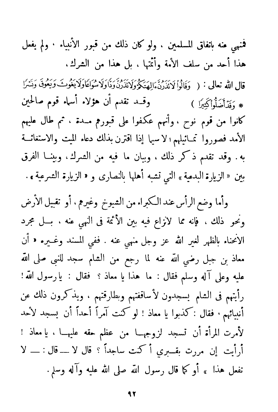 فَمَنْهِيٌّ عَنْهُ بِاتِّفَاقِ الْمُسْلِمِينَ وَلَوْ كَانَ ذَلِكَ مِنْ قُبُورِ الْأَنْبِيَاءِ وَلَمْ يَفْعَلْ هَذَا أَحَدٌ مِنْ سَلَفِ الْأُمَّةِ وَأَئِمَّتِهَا بَلْ هَذَا مِنْ الشِّرْكِ قَالَ اللَّهُ تَعَالَى: {وَقَالُوا لَا تَذَرُنَّ آلِهَتَكُمْ وَلَا تَذَرُنَّ وَدًّا وَلَا سُوَاعًا وَلَا يَغُوثَ وَيَعُوقَ وَنَسْرًا} {وَقَدْ أَضَلُّوا كَثِيرًا} وَقَدْ تَقَدَّمَ أَنَّ هَؤُلَاءِ أَسْمَاءُ قَوْمٍ صَالِحِينَ كَانُوا مِنْ قَوْمِ نُوحٍ وَأَنَّهُمْ عَكَفُوا عَلَى قُبُورِهِمْ مُدَّةً ثُمَّ طَالَ عَلَيْهِمْ الْأَمَدُ فَصَوَّرُوا تَمَاثِيلَهُمْ. لَا سِيَّمَا إذَا اقْتَرَنَ بِذَلِكَ دُعَاءُ الْمَيِّتِ وَالِاسْتِغَاثَةُ بِهِ. وَقَدْ تَقَدَّمَ ذِكْرُ ذَلِكَ وَبَيَانُ مَا فِيهِ مِنْ الشِّرْكِ وَبَيَّنَّا الْفَرْقَ بَيْنَ " الزِّيَارَةِ الْبِدْعِيَّةِ " الَّتِي تَشَبَّهَ أَهْلُهَا بِالنَّصَارَى و " الزِّيَارَةِ الشَّرْعِيَّةِ ". وَأَمَّا وَضْعُ الرَّأْسِ عِنْدَ الْكُبَرَاءِ مِنْ الشُّيُوخِ وَغَيْرِهِمْ أَوْ تَقْبِيلُ الْأَرْضِ وَنَحْوُ ذَلِكَ فَإِنَّهُ مِمَّا لَا نِزَاعَ فِيهِ بَيْنَ الْأَئِمَّةِ فِي النَّهْيِ عَنْهُ بَلْ مُجَرَّدُ الِانْحِنَاءِ بِالظَّهْرِ لِغَيْرِ اللَّهِ عَزَّ وَجَلَّ مَنْهِيٌّ عَنْهُ. فَفِي الْمُسْنَدِ وَغَيْرِهِ " {أَنَّ مُعَاذَ بْنَ جَبَلٍ رَضِيَ اللَّهُ عَنْهُ لَمَّا رَجَعَ مِنْ الشَّامِ سَجَدَ لِلنَّبِيِّ صَلَّى اللَّهُ عَلَيْهِ وَعَلَى آلِهِ وَسَلَّمَ فَقَالَ: مَا هَذَا يَا مُعَاذُ؟ فَقَالَ: يَا رَسُولَ اللَّهِ رَأَيْتهمْ فِي الشَّامِ يَسْجُدُونَ لِأَسَاقِفَتِهِمْ وَبَطَارِقَتِهِمْ وَيَذْكُرُونَ ذَلِكَ عَنْ أَنْبِيَائِهِمْ فَقَالَ: كَذَبُوا يَا مُعَاذُ لَوْ كُنْت آمِرًا أَحَدًا أَنْ يَسْجُدَ لِأَحَدِ لَأَمَرْت الْمَرْأَةَ أَنْ تَسْجُدَ لِزَوْجِهَا مَنْ عِظَمِ حَقِّهِ عَلَيْهَا يَا مُعَاذُ أَرَأَيْت إنْ مَرَرْت بِقَبْرِي أَكُنْت سَاجِدًا؟ قَالَ لَا - قَالَ: - لَا تَفْعَلْ هَذَا} أَوْ كَمَا قَالَ رَسُولُ اللَّهِ صَلَّى اللَّهُ عَلَيْهِ وَآلِهِ وَسَلَّمَ.