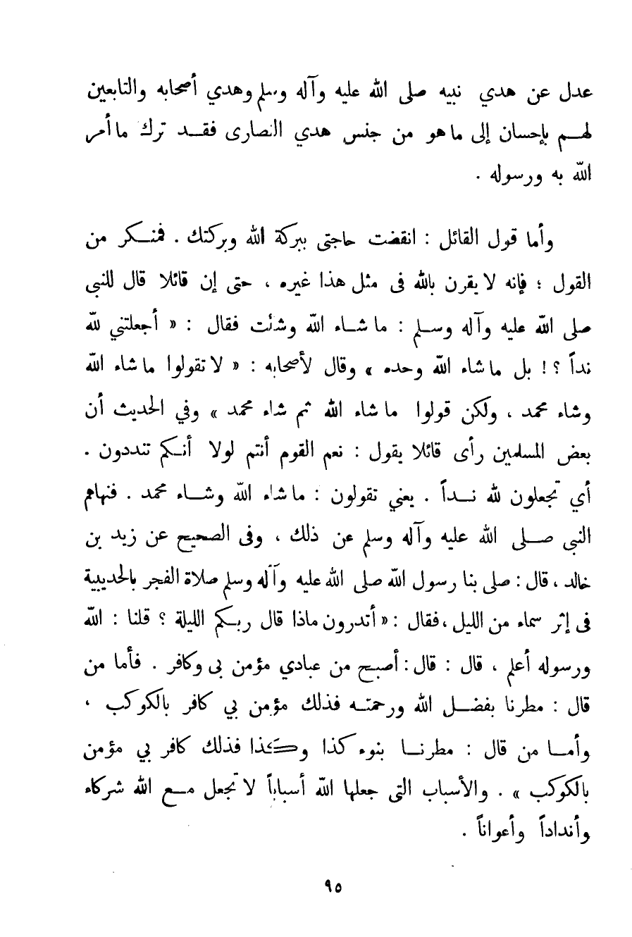 وَأَمَّا قَوْلُ الْقَائِلِ: انْقَضَتْ حَاجَتِي بِبَرَكَةِ اللَّهِ وَبَرَكَتِك. فَمُنْكَرٌ مِنْ الْقَوْلِ؛ فَإِنَّهُ لَا يُقْرَنُ بِاَللَّهِ فِي مِثْلِ هَذَا غَيْرُهُ حَتَّى إنَّ قَائِلًا قَالَ لِلنَّبِيِّ صَلَّى اللَّهُ عَلَيْهِ وَآلِهِ وَسَلَّمَ مَا شَاءَ اللَّهُ وَشِئْت فَقَالَ: " {أَجَعَلْتَنِي لِلَّهِ نِدًّا بَلْ مَا شَاءَ اللَّهُ وَحْدَهُ} وَقَالَ لِأَصْحَابِهِ: " {لَا تَقُولُوا مَا شَاءَ اللَّهُ وَشَاءَ مُحَمَّدٌ وَلَكِنْ قُولُوا مَا شَاءَ اللَّهُ ثُمَّ شَاءَ مُحَمَّدٌ} وَفِي الْحَدِيثِ أَنَّ بَعْضَ الْمُسْلِمِينَ رَأَى قَائِلًا يَقُولُ: نِعْمَ الْقَوْمُ أَنْتُمْ لَوْلَا أَنَّكُمْ تُنَدِّدُونَ. أَيْ تَجْعَلُونَ لِلَّهِ نِدًّا. يَعْنِي تَقُولُونَ: مَا شَاءَ اللَّهُ وَشَاءَ مُحَمَّدٌ. فَنَهَاهُمْ النَّبِيُّ صَلَّى اللَّهُ عَلَيْهِ وَآلِهِ وَسَلَّمَ عَنْ ذَلِكَ وَفِي الصَّحِيحِ عَنْ زَيْدِ بْنِ خَالِدٍ قَالَ: {صَلَّى بِنَا رَسُولُ اللَّهِ صَلَّى اللَّهُ عَلَيْهِ وَآلِهِ وَسَلَّمَ صَلَاةَ الْفَجْرِ بِالْحُدَيْبِيَةِ فِي إثْرِ سَمَاءٍ مِنْ اللَّيْلِ فَقَالَ: أَتَدْرُونَ مَاذَا قَالَ رَبُّكُمْ اللَّيْلَةَ؟ قُلْنَا: اللَّهُ وَرَسُولُهُ أَعْلَمُ قَالَ: قَالَ: أَصْبَحَ مِنْ عِبَادِي مُؤْمِنٌ بِي وَكَافِرٌ. فَأَمَّا مَنْ قَالَ: مُطِرْنَا بِفَضْلِ اللَّهِ وَرَحْمَتِهِ فَذَلِكَ مُؤْمِنٌ بِي كَافِرٌ بِالْكَوَاكِبِ وَأَمَّا مَنْ قَالَ: مُطِرْنَا بِنَوْءِ كَذَا وَكَذَا فَذَلِكَ كَافِرٌ بِي مُؤْمِنٌ بِالْكَوَاكِبِ} . وَالْأَسْبَابِ الَّتِي جَعَلَهَا اللَّهُ أَسْبَابًا لَا تُجْعَلُ مَعَ اللَّهِ شُرَكَاءَ وَأَنْدَادًا وَأَعْوَانًا.