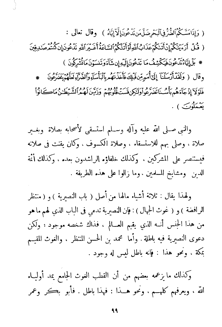 {وَإِذَا مَسَّكُمُ الضُّرُّ فِي الْبَحْرِ ضَلَّ مَنْ تَدْعُونَ إلَّا إيَّاهُ} وَقَالَ تَعَالَى: {قُلْ أَرَأَيْتَكُمْ إنْ أَتَاكُمْ عَذَابُ اللَّهِ أَوْ أَتَتْكُمُ السَّاعَةُ أَغَيْرَ اللَّهِ تَدْعُونَ إنْ كُنْتُمْ صَادِقِينَ} {بَلْ إيَّاهُ تَدْعُونَ فَيَكْشِفُ مَا تَدْعُونَ إلَيْهِ إنْ شَاءَ وَتَنْسَوْنَ مَا تُشْرِكُونَ} وَقَالَ {وَلَقَدْ أَرْسَلْنَا إلَى أُمَمٍ مِنْ قَبْلِكَ فَأَخَذْنَاهُمْ بِالْبَأْسَاءِ وَالضَّرَّاءِ لَعَلَّهُمْ يَتَضَرَّعُونَ} {فَلَوْلَا إذْ جَاءَهُمْ بَأْسُنَا تَضَرَّعُوا وَلَكِنْ قَسَتْ قُلُوبُهُمْ وَزَيَّنَ لَهُمُ الشَّيْطَانُ مَا كَانُوا يَعْمَلُونَ} . وَالنَّبِيُّ صَلَّى اللَّهُ عَلَيْهِ وَآلِهِ وَسَلَّمَ اسْتَسْقَى لِأَصْحَابِهِ بِصَلَاةِ وَبِغَيْرِ صَلَاةٍ وَصَلَّى بِهِمْ لِلِاسْتِسْقَاءِ وَصَلَاةَ الْكُسُوفِ وَكَانَ يَقْنُتُ فِي صَلَاتِهِ فَيَسْتَنْصِرُ عَلَى الْمُشْرِكِينَ وَكَذَلِكَ خُلَفَاؤُهُ الرَّاشِدُونَ بَعْدَهُ وَكَذَلِكَ أَئِمَّةُ الدِّينِ وَمَشَايِخُ الْمُسْلِمِينَ وَمَا زَالُوا عَلَى هَذِهِ الطَّرِيقَةِ. وَلِهَذَا يُقَالُ: ثَلَاثَةُ أَشْيَاءَ مَا لَهَا مِنْ أَصْلٍ (بَابُ الْنُصَيْرِيَّة و (مُنْتَظَرُ الرَّافِضَةِ و (غَوْثُ الْجُهَّالِ: فَإِنَّ الْنُصَيْرِيَّة تَدَّعِي فِي الْبَابِ الَّذِي لَهُمْ مَا هُوَ مِنْ هَذَا الْجِنْسِ أَنَّهُ الَّذِي يُقِيمُ الْعَالَمَ فَذَاكَ شَخْصُهُ مَوْجُودٌ؛ وَلَكِنَّ دَعْوَى الْنُصَيْرِيَّة فِيهِ بَاطِلَةٌ. وَأَمَّا مُحَمَّدُ بْنُ الْحَسَنِ الْمُنْتَظَرُ وَالْغَوْثُ الْمُقِيمُ بِمَكَّةَ وَنَحْوُ هَذَا: فَإِنَّهُ بَاطِلٌ لَيْسَ لَهُ وُجُودٌ. وَكَذَلِكَ مَا يَزْعُمُهُ بَعْضُهُمْ مِنْ أَنَّ الْقُطْبَ الْغَوْثَ الْجَامِعَ يَمُدُّ أَوْلِيَاءَ اللَّهِ وَيَعْرِفُهُمْ كُلَّهُمْ وَنَحْوَ هَذَا؛ فَهَذَا بَاطِلٌ. فَأَبُو بَكْرٍ وَعُمَرُ