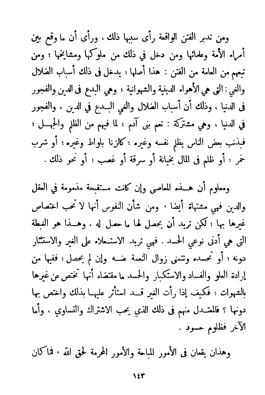 وَمَنْ تَدَبَّرَ الْفِتَنَ الْوَاقِعَةَ رَأَى سَبَبَهَا ذَلِكَ وَرَأَى أَنَّ مَا وَقَعَ بَيْنَ أُمَرَاءِ الْأُمَّةِ وَعُلَمَائِهَا وَمَنْ دَخَلَ فِي ذَلِكَ مِنْ مُلُوكِهَا وَمَشَايِخِهَا؛ وَمَنْ تَبِعَهُمْ مِنْ الْعَامَّةِ مِنْ الْفِتَنِ: هَذَا أَصْلُهَا؛ يَدْخُلُ فِي ذَلِكَ أَسْبَابُ الضَّلَالِ وَالْغَيِّ: الَّتِي هِيَ الْأَهْوَاءُ الدِّينِيَّةُ والشهوانية؛ وَهِيَ الْبِدَعُ فِي الدِّينِ وَالْفُجُورُ فِي الدُّنْيَا وَذَلِكَ أَنَّ أَسْبَابَ الضَّلَالِ وَالْغَيِّ الْبِدَعُ فِي الدِّينِ وَالْفُجُورُ فِي الدُّنْيَا وَهِيَ مُشْتَرَكَةٌ: تَعُمُّ بَنِي آدَمَ؛ لِمَا فِيهِمْ مِنْ الظُّلْمِ وَالْجَهْلِ؛ فَبِذَنْبِ بَعْضِ النَّاسِ يَظْلِمُ نَفْسَهُ وَغَيْرَهُ؛ كَالزِّنَا بِلِوَاطِ وَغَيْرِهِ؛ أَوْ شُرْبِ خَمْرٍ؛ أَوْ ظُلْمٍ فِي الْمَالِ بِخِيَانَةِ أَوْ سَرِقَةٍ أَوْ غَصْبٍ؛ أَوْ نَحْوِ ذَلِكَ. وَمَعْلُومٌ أَنَّ هَذِهِ الْمَعَاصِيَ وَإِنْ كَانَتْ مُسْتَقْبَحَةً مَذْمُومَةً فِي الْعَقْلِ وَالدِّينِ فَهِيَ مُشْتَهَاةٌ أَيْضًا وَمِنْ شَأْنِ النُّفُوسِ أَنَّهَا لَا تُحِبُّ اخْتِصَاصَ غَيْرِهَا بِهَا؛ لَكِنْ تُرِيدُ أَنْ يَحْصُلَ لَهَا مَا حَصَلَ لَهُ وَهَذَا هُوَ الْغِبْطَةُ الَّتِي هِيَ أَدْنَى نَوْعَيْ الْحَسَدِ. فَهِيَ تُرِيدُ الِاسْتِعْلَاءَ عَلَى الْغَيْرِ وَالِاسْتِئْثَارَ دُونَهُ؛ أَوْ تَحْسُدُهُ وَتَتَمَنَّى زَوَالَ النِّعْمَةِ عَنْهُ وَإِنْ لَمْ يَحْصُلْ؛ فَفِيهَا مِنْ إرَادَةِ الْعُلُوِّ وَالْفَسَادِ وَالِاسْتِكْبَارِ وَالْحَسَدِ مَا مُقْتَضَاهُ أَنَّهَا تَخْتَصُّ عَنْ غَيْرِهَا بِالشَّهَوَاتِ؛ فَكَيْفَ إذَا رَأَتْ الْغَيْرَ قَدْ اسْتَأْثَرَ عَلَيْهَا بِذَلِكَ وَاخْتَصَّ بِهَا دُونَهَا؟ فَالْمُعْتَدِلُ مِنْهُمْ فِي ذَلِكَ الَّذِي يُحِبُّ الِاشْتِرَاكَ والتساوي وَأَمَّا الْآخَرُ فَظَلُومٌ حَسُودٌ. وَهَذَانِ يَقَعَانِ فِي الْأُمُورِ الْمُبَاحَةِ وَالْأُمُورِ الْمُحَرَّمَةِ لِحَقِّ اللَّهِ فَمَا كَانَ