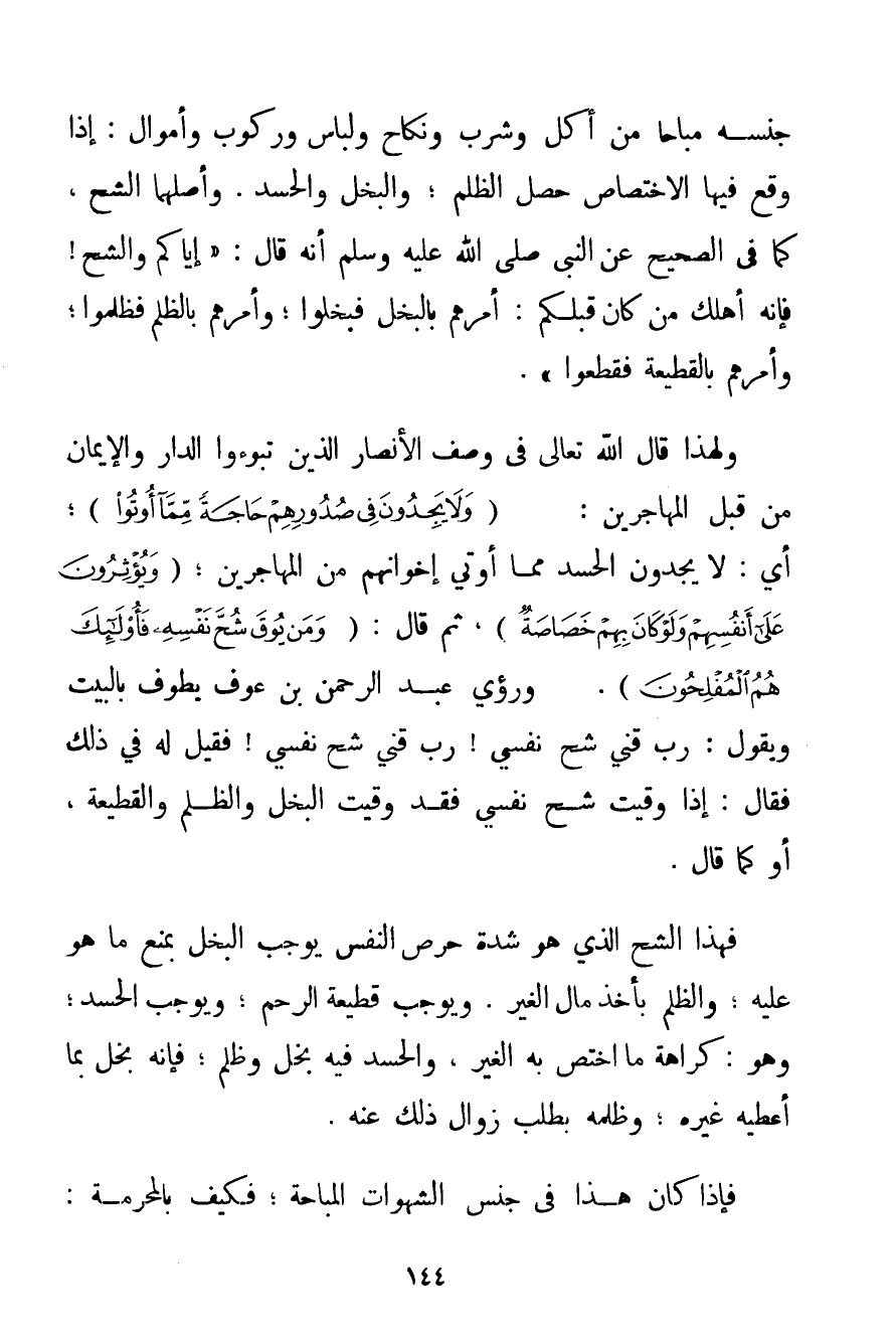 جِنْسُهُ مُبَاحًا مِنْ أَكْلٍ وَشُرْبٍ وَنِكَاحٍ وَلِبَاسٍ وَرُكُوبٍ وَأَمْوَالٍ: إذَا وَقَعَ فِيهَا الِاخْتِصَاصُ حَصَلَ الظُّلْمُ؛ وَالْبُخْلُ وَالْحَسَدُ. وَأَصْلُهُمَا الشُّحُّ كَمَا فِي الصَّحِيحِ عَنْ النَّبِيِّ صَلَّى اللَّهُ عَلَيْهِ وَسَلَّمَ أَنَّهُ قَالَ: {إيَّاكُمْ وَالشُّحَّ فَإِنَّهُ أَهْلَكَ مَنْ كَانَ قَبْلَكُمْ: أَمَرَهُمْ بِالْبُخْلِ فَبَخِلُوا؛ وَأَمَرَهُمْ بِالظُّلْمِ فَظَلَمُوا؛ وَأَمَرَهُمْ بِالْقَطِيعَةِ فَقَطَعُوا} . وَلِهَذَا قَالَ اللَّهُ تَعَالَى فِي وَصْفِ الْأَنْصَارِ الَّذِينَ تَبَوَّءُوا الدَّارَ وَالْإِيمَانَ مِنْ قَبْلِ الْمُهَاجِرِينَ: {وَلَا يَجِدُونَ فِي صُدُورِهِمْ حَاجَةً مِمَّا أُوتُوا} أَيْ: لَا يَجِدُونَ الْحَسَدَ مِمَّا أُوتِيَ إخْوَانُهُمْ مِنْ الْمُهَاجِرِينَ؛ {وَيُؤْثِرُونَ عَلَى أَنْفُسِهِمْ وَلَوْ كَانَ بِهِمْ خَصَاصَةٌ} ثُمَّ قَالَ: {وَمَنْ يُوقَ شُحَّ نَفْسِهِ فَأُولَئِكَ هُمُ الْمُفْلِحُونَ} . وَرُئِيَ عَبْدُ الرَّحْمَنِ بْنُ عَوْفٍ يَطُوفُ بِالْبَيْتِ وَيَقُولُ: رَبِّ قِنِي شُحَّ نَفْسِي رَبِّ قِنِي شُحَّ نَفْسِي فَقِيلَ لَهُ فِي ذَلِكَ فَقَالَ: إذَا وُقِيت شُحَّ نَفْسِي فَقَدْ وُقِيت الْبُخْلَ وَالظُّلْمَ وَالْقَطِيعَةَ أَوْ كَمَا قَالَ. فَهَذَا الشُّحُّ الَّذِي هُوَ شِدَّةُ حِرْصِ النَّفْسِ يُوجِبُ الْبُخْلَ بِمَنْعِ مَا هُوَ عَلَيْهِ؛ وَالظُّلْمِ بِأَخْذِ مَالِ الْغَيْرِ. وَيُوجِبُ قَطِيعَةَ الرَّحِمِ؛ وَيُوجِبُ الْحَسَدَ؛ وَهُوَ: كَرَاهَةُ مَا أَخْتَصَّ بِهِ الْغَيْرُ وَالْحَسَدُ فِيهِ بُخْلٌ وَظُلْمٌ؛ فَإِنَّهُ بُخْلٌ بِمَا أُعْطِيهِ غَيْرُهُ؛ وَظُلْمُهُ بِطَلَبِ زَوَالِ ذَلِكَ عَنْهُ. فَإِذَا كَانَ هَذَا فِي جِنْسِ الشَّهَوَاتِ الْمُبَاحَةِ؛ فَكَيْفَ بِالْمُحَرَّمَةِ: