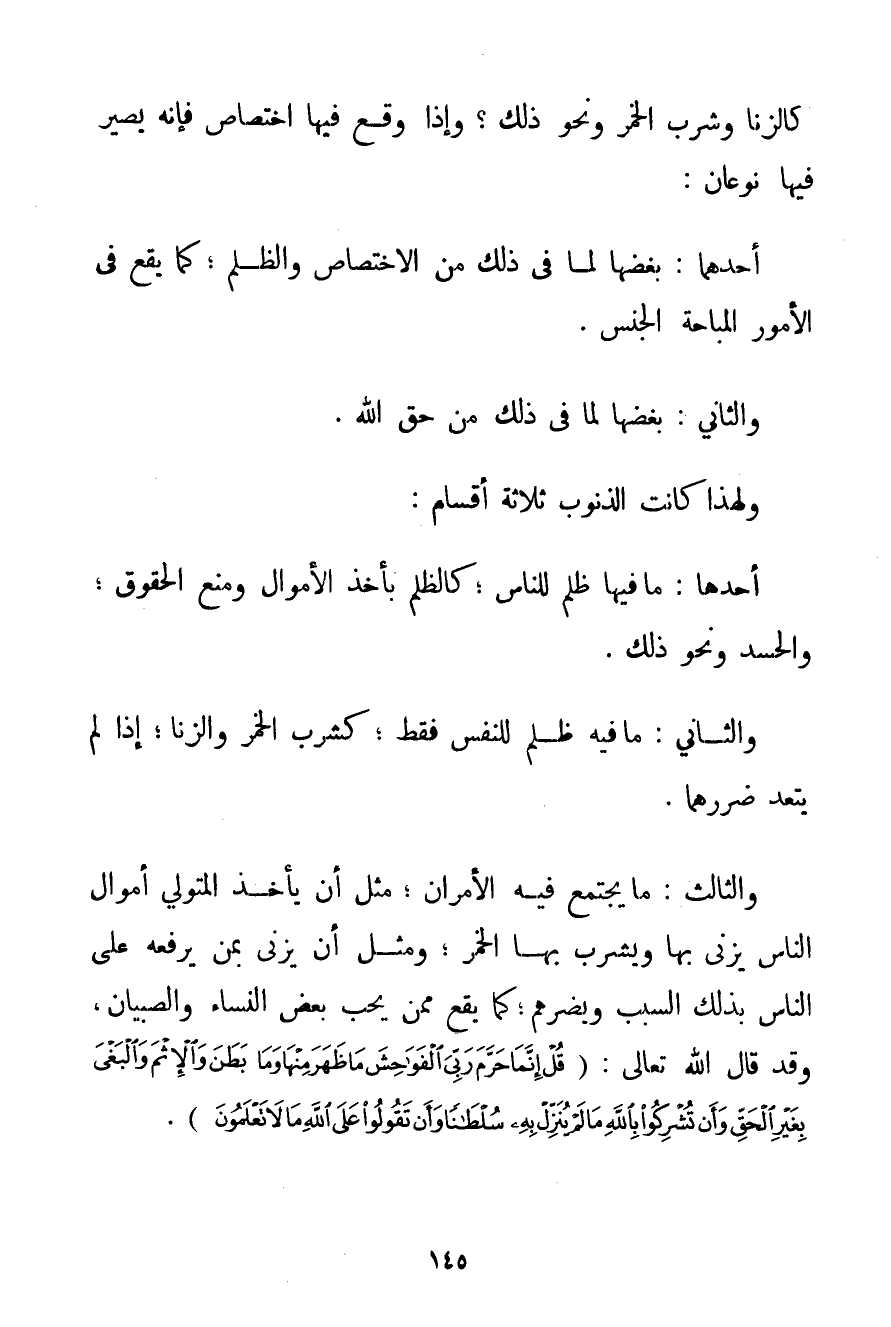 كَالزِّنَا وَشُرْبِ الْخَمْرِ وَنَحْوِ ذَلِكَ؟ وَإِذَا وَقَعَ فِيهَا اخْتِصَاصٌ فَإِنَّهُ يَصِيرُ فِيهَا نَوْعَانِ: أَحَدُهُمَا: بُغْضُهَا لِمَا فِي ذَلِكَ مِنْ الِاخْتِصَاصِ وَالظُّلْمِ؛ كَمَا يَقَعُ فِي الْأُمُورِ الْمُبَاحَةِ الْجِنْسُ. وَالثَّانِي: بُغْضُهَا لِمَا فِي ذَلِكَ مِنْ حَقِّ اللَّهِ. وَلِهَذَا كَانَتْ الذُّنُوبُ ثَلَاثَةُ أَقْسَامٍ: أَحَدُهَا: مَا فِيهَا ظُلْمُ النَّاسِ؛ كَالظُّلْمِ بِأَخْذِ الْأَمْوَالِ وَمَنْعِ الْحُقُوقِ؛ وَالْحَسَدِ وَنَحْوِ ذَلِكَ. وَالثَّانِي: مَا فِيهِ ظُلْمُ النَّاسِ فَقَطْ؛ كَشُرْبِ الْخَمْرِ وَالزِّنَا؛ إذَا لَمْ يَتَعَدَّ ضَرَرُهُمَا. وَالثَّالِثُ: مَا يَجْتَمِعُ فِيهِ الْأَمْرَانِ؛ مِثْلَ أَنْ يَأْخُذَ الْمُتَوَلِّي أَمْوَالَ النَّاسِ يَزْنِي بِهَا وَيَشْرَبُ بِهَا الْخَمْرَ؛ وَمِثْلَ أَنْ يَزْنِيَ بِمَنْ يَرْفَعُهُ عَلَى النَّاسِ بِذَلِكَ السَّبَبِ وَيَضُرُّهُمْ؛ كَمَا يَقَعُ مِمَّنْ يُحِبُّ بَعْضَ النِّسَاءِ وَالصِّبْيَانِ وَقَدْ قَالَ اللَّهُ تَعَالَى: {قُلْ إنَّمَا حَرَّمَ رَبِّيَ الْفَوَاحِشَ مَا ظَهَرَ مِنْهَا وَمَا بَطَنَ وَالْإِثْمَ وَالْبَغْيَ بِغَيْرِ الْحَقِّ وَأَنْ تُشْرِكُوا بِاللَّهِ مَا لَمْ يُنَزِّلْ بِهِ سُلْطَانًا وَأَنْ تَقُولُوا عَلَى اللَّهِ مَا لَا تَعْلَمُونَ} .