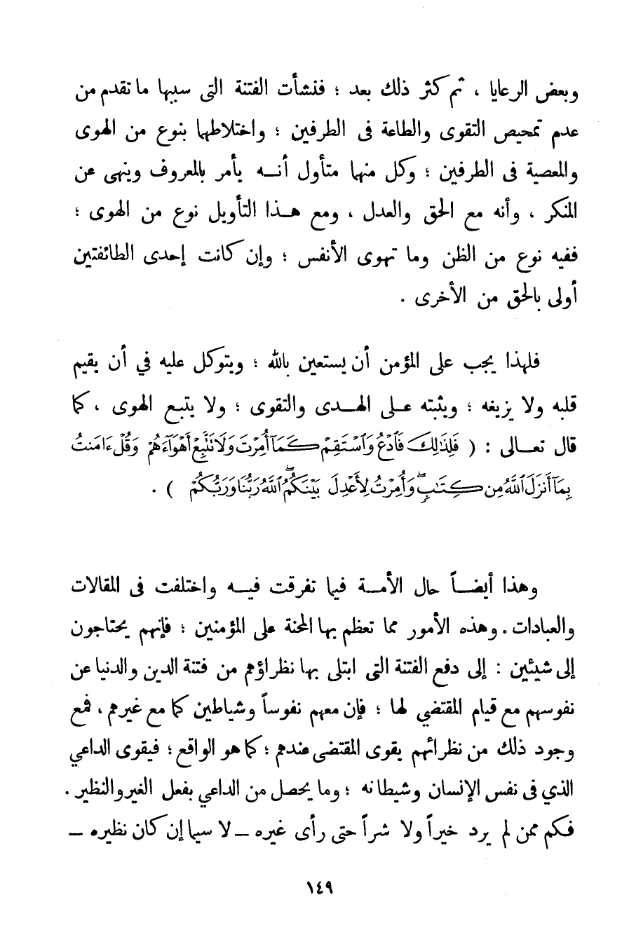 وَبَعْضِ الرَّعَايَا ثُمَّ كَثُرَ ذَلِكَ بَعْدُ؛ فَنَشَأَتْ الْفِتْنَةُ الَّتِي سَبَبُهَا مَا تَقَدَّمَ مِنْ عَدَمِ تَمْحِيصِ التَّقْوَى وَالطَّاعَةِ فِي الطَّرَفَيْنِ؛ وَاخْتِلَاطِهِمَا بِنَوْعِ مِنْ الْهَوَى وَالْمَعْصِيَةِ فِي الطَّرَفَيْنِ: وَكُلٌّ مِنْهُمَا مُتَأَوِّلٌ أَنَّهُ يَأْمُرُ بِالْمَعْرُوفِ وَيَنْهَى عَنْ الْمُنْكَرِ وَأَنَّهُ مَعَ الْحَقِّ وَالْعَدْلِ وَمَعَ هَذَا التَّأْوِيلِ نَوْعٌ مِنْ الْهَوَى؛ فَفِيهِ نَوْعٌ مِنْ الظَّنِّ وَمَا تَهْوَى الْأَنْفُسُ؛ وَإِنْ كَانَتْ إحْدَى الطَّائِفَتَيْنِ أَوْلَى بِالْحَقِّ مِنْ الْأُخْرَى. فَلِهَذَا يَجِبُ عَلَى الْمُؤْمِنِ أَنْ يَسْتَعِينَ بِاَللَّهِ؛ وَيَتَوَكَّلَ عَلَيْهِ فِي أَنْ يُقِيمَ قَلْبَهُ وَلَا يُزِيغَهُ: وَيُثَبِّتَهُ عَلَى الْهُدَى وَالتَّقْوَى؛ وَلَا يَتَّبِعُ الْهَوَى كَمَا قَالَ تَعَالَى: {فَلِذَلِكَ فَادْعُ وَاسْتَقِمْ كَمَا أُمِرْتَ وَلَا تَتَّبِعْ أَهْوَاءَهُمْ وَقُلْ آمَنْتُ بِمَا أَنْزَلَ اللَّهُ مِنْ كِتَابٍ وَأُمِرْتُ لِأَعْدِلَ بَيْنَكُمُ اللَّهُ رَبُّنَا وَرَبُّكُمْ} . وَهَذَا أَيْضًا حَالُ الْأُمَّةِ فِيمَا تَفَرَّقَتْ فِيهِ وَاخْتَلَفَتْ فِي الْمَقَالَاتِ وَالْعِبَادَاتِ. وَهَذِهِ الْأُمُورُ مِمَّا تَعْظُمُ بِهَا الْمِحْنَةُ عَلَى الْمُؤْمِنِينَ. فَإِنَّهُمْ يَحْتَاجُونَ إلَى شَيْئَيْنِ: إلَى دَفْعِ الْفِتْنَةِ الَّتِي اُبْتُلِيَ بِهَا نُظَرَاؤُهُمْ مِنْ فِتْنَةِ الدِّينِ وَالدُّنْيَا عَنْ نُفُوسِهِمْ مَعَ قِيَامِ الْمُقْتَضِي لَهَا: فَإِنَّ مَعَهُمْ نُفُوسًا وَشَيَاطِينَ كَمَا مَعَ غَيْرِهِمْ فَمَعَ وُجُودِ ذَلِكَ مِنْ نُظَرَائِهِمْ يَقْوَى الْمُقْتَضِي عِنْدَهُمْ؛ كَمَا هُوَ الْوَاقِعُ؛ فَيَقْوَى الدَّاعِي الَّذِي فِي نَفْسِ الْإِنْسَانِ وَشَيْطَانُهُ؛ وَمَا يَحْصُلُ مِنْ الدَّاعِي بِفِعْلِ الْغَيْرِ وَالنَّظِيرِ. فَكَمْ مِمَّنْ لَمْ يَرِدْ خَيْرًا وَلَا شَرًّا حَتَّى رَأَى غَيْرَهُ - لَا سِيَّمَا إنْ كَانَ نَظِيرُهُ -