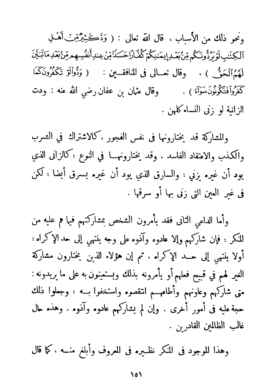 وَنَحْوِ ذَلِكَ مِنْ الْأَسْبَابِ قَالَ اللَّهُ تَعَالَى: {وَدَّ كَثِيرٌ مِنْ أَهْلِ الْكِتَابِ لَوْ يَرُدُّونَكُمْ مِنْ بَعْدِ إيمَانِكُمْ كُفَّارًا حَسَدًا مِنْ عِنْدِ أَنْفُسِهِمْ مِنْ بَعْدِ مَا تَبَيَّنَ لَهُمُ الْحَقُّ} وَقَالَ تَعَالَى فِي الْمُنَافِقِينَ: {وَدُّوا لَوْ تَكْفُرُونَ كَمَا كَفَرُوا فَتَكُونُونَ سَوَاءً} . وَقَالَ عُثْمَانُ بْنُ عفان رَضِيَ اللَّهُ عَنْهُ وَدَّتْ الزَّانِيَةُ لَوْ زَنَى النِّسَاءُ كُلُّهُنَّ. وَالْمُشَارِكَةُ قَدْ يَخْتَارُونَهَا فِي نَفْسِ الْفُجُورِ كَالِاشْتِرَاكِ فِي الشُّرْبِ وَالْكَذِبِ وَالِاعْتِقَادِ الْفَاسِدِ وَقَدْ يَخْتَارُونَهَا فِي النَّوْعِ؛ كَالزَّانِي الَّذِي يَوَدُّ أَنَّ غَيْرَهُ يَزْنِي؛ وَالسَّارِقُ الَّذِي يَوَدُّ أَنَّ غَيْرَهُ يَسْرِقُ أَيْضًا؛ لَكِنْ فِي غَيْرِ الْعَيْنِ الَّتِي زَنَى بِهَا أَوْ سَرَقَهَا. وَأَمَّا الدَّاعِي الثَّانِي فَقَدْ يَأْمُرُونَ الشَّخْصَ بِمُشَارَكَتِهِمْ فِيمَا هُمْ عَلَيْهِ مِنْ الْمُنْكَرِ. فَإِنْ شَارَكَهُمْ وَإِلَّا عَادُوهُ وَآذَوْهُ عَلَى وَجْهٍ يَنْتَهِي إلَى حَدِّ الْإِكْرَاهِ؛ أَوَّلًا يَنْتَهِي إلَى حَدِّ الْإِكْرَاهِ ثُمَّ إنَّ هَؤُلَاءِ الَّذِينَ يَخْتَارُونَ مُشَارَكَةَ الْغَيْرِ لَهُمْ فِي قَبِيحِ فِعْلِهِمْ أَوْ يَأْمُرُونَهُ بِذَلِكَ وَيَسْتَعِينُونَ بِهِ عَلَى مَا يُرِيدُونَهُ: مَتَى شَارَكَهُمْ وَعَاوَنَهُمْ وَأَطَاعَهُمْ انْتَقَصُوهُ وَاسْتَخَفُّوا بِهِ. وَجَعَلُوا ذَلِكَ حُجَّةً عَلَيْهِ فِي أُمُورٍ أُخْرَى. وَإِنْ لَمْ يُشَارِكْهُمْ عَادَوْهُ وَآذَوْهُ. وَهَذِهِ حَالُ غَالِبِ الظَّالِمِينَ الْقَادِرِينَ. وَهَذَا الْمَوْجُودُ فِي الْمُنْكَرِ نَظِيرُهُ فِي الْمَعْرُوفِ وَأَبْلَغُ مِنْهُ كَمَا قَالَ