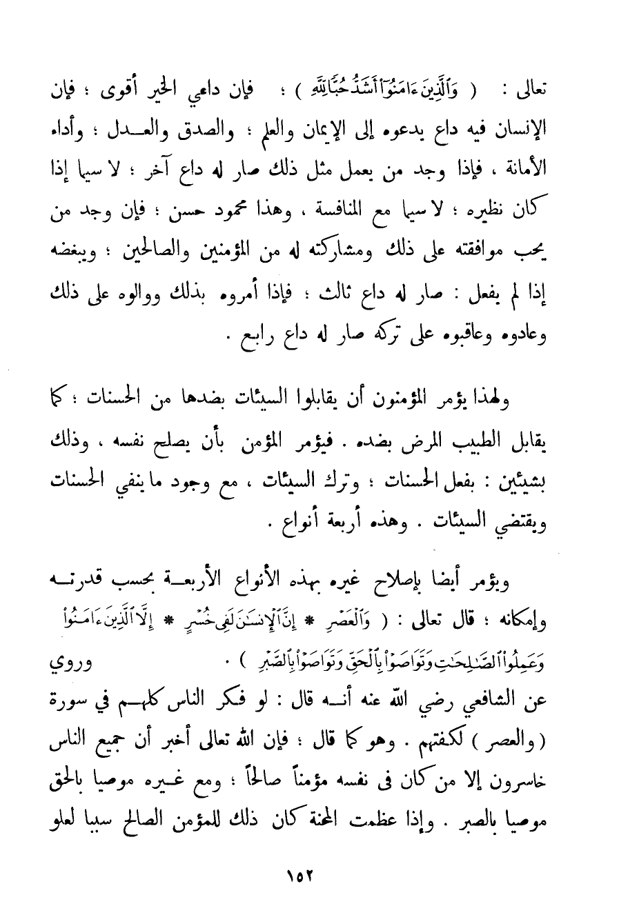 تَعَالَى: {وَالَّذِينَ آمَنُوا أَشَدُّ حُبًّا لِلَّهِ} فَإِنَّ دَاعِيَ الْخَيْرِ أَقْوَى؛ فَإِنَّ الْإِنْسَانَ فِيهِ دَاعٍ يَدْعُوهُ إلَى الْإِيمَانِ وَالْعِلْمِ؛ وَالصِّدْقِ وَالْعَدْلِ؛ وَأَدَاءِ الْأَمَانَةِ فَإِذَا وُجِدَ مَنْ يَعْمَلُ مِثْلَ ذَلِكَ صَارَ لَهُ دَاعٍ آخَرُ؛ لَا سِيَّمَا إذَا كَانَ نَظِيرُهُ؛ لَا سِيَّمَا مَعَ الْمُنَافَسَةِ وَهَذَا مَحْمُودٌ حَسَنٌ. فَإِنْ وُجِدَ مَنْ يُحِبُّ مُوَافَقَتَهُ عَلَى ذَلِكَ وَمُشَارَكَتَهُ لَهُ مِنْ الْمُؤْمِنِينَ وَالصَّالِحِينَ؛ وَيُبْغِضُهُ إذَا لَمْ يَفْعَلْ: صَارَ لَهُ دَاعٍ ثَالِثٌ؛ فَإِذَا أَمَرُوهُ بِذَلِكَ وَوَالَوْهُ عَلَى ذَلِكَ وَعَادَوْهُ وَعَاقَبُوهُ عَلَى تَرْكِهِ صَارَ لَهُ دَاعٍ رَابِعٌ. وَلِهَذَا يُؤْمَرُ الْمُؤْمِنُونَ أَنْ يُقَابِلُوا السَّيِّئَاتِ بِضِدِّهَا مِنْ الْحَسَنَاتِ؛ كَمَا يُقَابِلُ الطَّبِيبُ الْمَرَضَ بِضِدِّهِ. فَيُؤْمَرُ الْمُؤْمِنُ بِأَنْ يُصْلِحَ نَفْسَهُ وَذَلِكَ بِشَيْئَيْنِ: بِفِعْلِ الْحَسَنَاتِ. وَتَرْكِ السَّيِّئَاتِ مَعَ وُجُودِ مَا يَنْفِي الْحَسَنَاتِ وَيَقْتَضِي السَّيِّئَاتِ. وَهَذِهِ أَرْبَعَةُ أَنْوَاعٍ. وَيُؤْمَرُ أَيْضًا بِإِصْلَاحِ غَيْرِهِ بِهَذِهِ الْأَنْوَاعِ الْأَرْبِعَةِ بِحَسَبِ قُدْرَتِهِ وَإِمْكَانِهِ؛ قَالَ تَعَالَى: {وَالْعَصْرِ} {إنَّ الْإِنْسَانَ لَفِي خُسْرٍ} {إلَّا الَّذِينَ آمَنُوا وَعَمِلُوا الصَّالِحَاتِ وَتَوَاصَوْا بِالْحَقِّ وَتَوَاصَوْا بِالصَّبْرِ} . وَرُوِيَ عَنْ الشَّافِعِيِّ رَضِيَ اللَّهُ عَنْهُ أَنَّهُ قَالَ: لَوْ فَكَّرَ النَّاسُ كُلُّهُمْ فِي سُورَةِ (وَالْعَصْرِ لَكَفَتْهُمْ. وَهُوَ كَمَا قَالَ. فَإِنَّ اللَّهَ تَعَالَى أَخْبَرَ أَنَّ جَمِيعَ النَّاسِ خَاسِرُونَ إلَّا مَنْ كَانَ فِي نَفْسِهِ مُؤْمِنًا صَالِحًا؛ وَمَعَ غَيْرِهِ مُوصِيًا بِالْحَقِّ مُوصِيًا بِالصَّبْرِ. وَإِذَا عَظُمَتْ الْمِحْنَةُ كَانَ ذَلِكَ لِلْمُؤْمِنِ الصَّالِحِ سَبَبًا لِعُلُوِّ