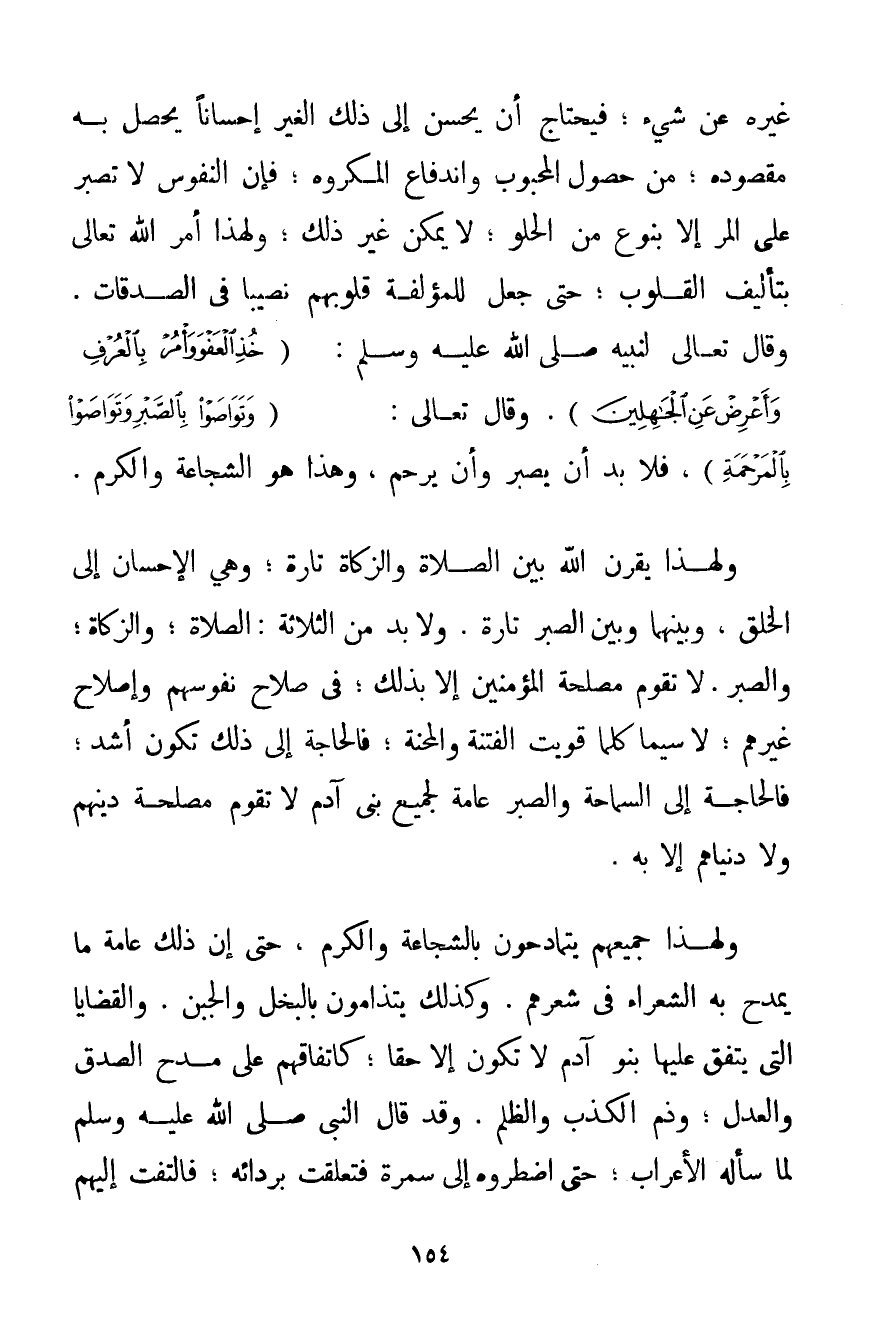 غَيْرَهُ عَنْ شَيْءٍ؛ فَيَحْتَاجُ أَنْ يُحْسِنَ إلَى ذَلِكَ الْغَيْرِ إحْسَانًا يَحْصُلُ بِهِ مَقْصُودُهُ؛ مِنْ حُصُولِ الْمَحْبُوبِ وَانْدِفَاعِ الْمَكْرُوهِ؛ فَإِنَّ النُّفُوسَ لَا تَصْبِرُ عَلَى الْمُرِّ إلَّا بِنَوْعِ مِنْ الْحُلْوِ؛ لَا يُمْكِنُ غَيْرُ ذَلِكَ؛ وَلِهَذَا أَمَرَ اللَّهُ تَعَالَى بِتَأْلِيفِ الْقُلُوبِ؛ حَتَّى جَعَلَ لِلْمُؤَلَّفَةِ قُلُوبُهُمْ نَصِيبًا فِي الصَّدَقَاتِ. وَقَالَ تَعَالَى لِنَبِيِّهِ صَلَّى اللَّهُ عَلَيْهِ وَسَلَّمَ {خُذِ الْعَفْوَ وَأْمُرْ بِالْعُرْفِ وَأَعْرِضْ عَنِ الْجَاهِلِينَ} . وَقَالَ تَعَالَى: {وَتَوَاصَوْا بِالصَّبْرِ وَتَوَاصَوْا بِالْمَرْحَمَةِ} فَلَا بُدَّ أَنْ يَصْبِرَ وَأَنْ يَرْحَمَ وَهَذَا هُوَ الشَّجَاعَةُ وَالْكَرَمُ. وَلِهَذَا يُقْرِنُ اللَّهُ بَيْنَ الصَّلَاةِ وَالزَّكَاةِ تَارَةً؛ وَهِيَ الْإِحْسَانُ إلَى الْخَلْقِ وَبَيْنَهُمَا وَبَيْنَ الصَّبْرِ تَارَةً. وَلَا بُدَّ مِنْ الثَّلَاثَةِ: الصَّلَاةِ؛ وَالزَّكَاةِ؛ وَالصَّبْرِ. لَا تَقُومُ مَصْلَحَةُ الْمُؤْمِنِينَ إلَّا بِذَلِكَ؛ فِي صَلَاحِ نُفُوسِهِمْ وَإِصْلَاحِ غَيْرِهِمْ؛ لَا سِيَّمَا كُلَّمَا قَوِيَتْ الْفِتْنَةُ وَالْمِحْنَةُ؛ فَالْحَاجَةُ إلَى ذَلِكَ تَكُونُ أَشَدَّ؛ فَالْحَاجَةُ إلَى السَّمَاحَةِ وَالصَّبْرِ عَامَّةً لِجَمِيعِ بَنِي آدَمَ لَا تَقُومُ مَصْلَحَةُ دِينِهِمْ وَلَا دُنْيَاهُمْ إلَّا بِهِ. وَلِهَذَا جَمِيعُهُمْ يَتَمَادَحُونَ بِالشَّجَاعَةِ وَالْكَرَمِ حَتَّى إنَّ ذَلِكَ عَامَّةُ مَا يَمْدَحُ بِهِ الشُّعَرَاءُ فِي شِعْرِهِمْ. وَكَذَلِكَ يَتَذَامُّونَ بِالْبُخْلِ وَالْجُبْنِ. وَالْقَضَايَا الَّتِي يَتَّفِقُ عَلَيْهَا بَنُو آدَمَ لَا تَكُونُ إلَّا حَقًّا؛ كَاتِّفَاقِهِمْ عَلَى مَدْحِ الصِّدْقِ وَالْعَدْلِ؛ وَذَمِّ الْكَذِبِ وَالظُّلْمِ. وَقَدْ قَالَ {النَّبِيُّ صَلَّى اللَّهُ عَلَيْهِ وَسَلَّمَ لَمَّا سَأَلَهُ الْأَعْرَابُ؛ حَتَّى اضْطَرُّوهُ إلَى سَمُرَةٍ فَتَعَلَّقَتْ بِرِدَائِهِ؛ فَالْتَفَتَ إلَيْهِمْ