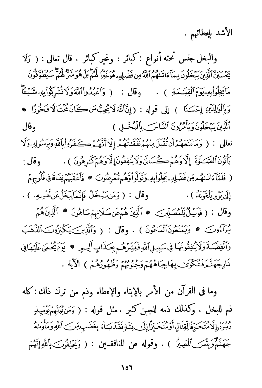 الْأَشَدَّ بِإِعْطَائِهِمْ} . وَالْبُخْلُ جِنْسٌ تَحْتَهُ أَنْوَاعُ: كَبَائِرَ؛ وَغَيْرُ كَبَائِرَ قَالَ تَعَالَى: {وَلَا يَحْسَبَنَّ الَّذِينَ يَبْخَلُونَ بِمَا آتَاهُمُ اللَّهُ مِنْ فَضْلِهِ هُوَ خَيْرًا لَهُمْ بَلْ هُوَ شَرٌّ لَهُمْ سَيُطَوَّقُونَ مَا بَخِلُوا بِهِ يَوْمَ الْقِيَامَةِ} . وَقَالَ: {وَاعْبُدُوا اللَّهَ وَلَا تُشْرِكُوا بِهِ شَيْئًا وَبِالْوَالِدَيْنِ إحْسَانًا} إلَى قَوْلِهِ: {إنَّ اللَّهَ لَا يُحِبُّ مَنْ كَانَ مُخْتَالًا فَخُورًا} {الَّذِينَ يَبْخَلُونَ وَيَأْمُرُونَ النَّاسَ بِالْبُخْلِ} وَقَالَ تَعَالَى: {وَمَا مَنَعَهُمْ أَنْ تُقْبَلَ مِنْهُمْ نَفَقَاتُهُمْ إلَّا أَنَّهُمْ كَفَرُوا بِاللَّهِ وَبِرَسُولِهِ وَلَا يَأْتُونَ الصَّلَاةَ إلَّا وَهُمْ كُسَالَى وَلَا يُنْفِقُونَ إلَّا وَهُمْ كَارِهُونَ} . وَقَالَ: {فَلَمَّا آتَاهُمْ مِنْ فَضْلِهِ بَخِلُوا بِهِ وَتَوَلَّوْا وَهُمْ مُعْرِضُونَ} {فَأَعْقَبَهُمْ نِفَاقًا فِي قُلُوبِهِمْ إلَى يَوْمِ يَلْقَوْنَهُ} . وَقَالَ: {وَمَنْ يَبْخَلْ فَإِنَّمَا يَبْخَلُ عَنْ نَفْسِهِ} . وَقَالَ: {فَوَيْلٌ لِلْمُصَلِّينَ} {الَّذِينَ هُمْ عَنْ صَلَاتِهِمْ سَاهُونَ} {الَّذِينَ هُمْ يُرَاءُونَ} {وَيَمْنَعُونَ الْمَاعُونَ} . وَقَالَ: {وَالَّذِينَ يَكْنِزُونَ الذَّهَبَ وَالْفِضَّةَ وَلَا يُنْفِقُونَهَا فِي سَبِيلِ اللَّهِ فَبَشِّرْهُمْ بِعَذَابٍ أَلِيمٍ} {يَوْمَ يُحْمَى عَلَيْهَا فِي نَارِ جَهَنَّمَ فَتُكْوَى بِهَا جِبَاهُهُمْ وَجُنُوبُهُمْ وَظُهُورُهُمْ} الْآيَةَ. وَمَا فِي الْقُرْآنِ مِنْ الْأَمْرِ بِالْإِيتَاءِ وَالْإِعْطَاءِ وَذَمِّ مَنْ تَرَكَ ذَلِكَ: كُلُّهُ ذَمٌّ لِلْبُخْلِ وَكَذَلِكَ ذَمُّهُ لِلْجُبْنِ كَثِيرٌ مِثْلَ قَوْلِهِ: {وَمَنْ يُوَلِّهِمْ يَوْمَئِذٍ دُبُرَهُ إلَّا مُتَحَرِّفًا لِقِتَالٍ أَوْ مُتَحَيِّزًا إلَى فِئَةٍ فَقَدْ بَاءَ بِغَضَبٍ مِنَ اللَّهِ وَمَأْوَاهُ جَهَنَّمُ وَبِئْسَ الْمَصِيرُ} . وَقَوْلُهُ عَنْ الْمُنَافِقِينَ: {وَيَحْلِفُونَ بِاللَّهِ