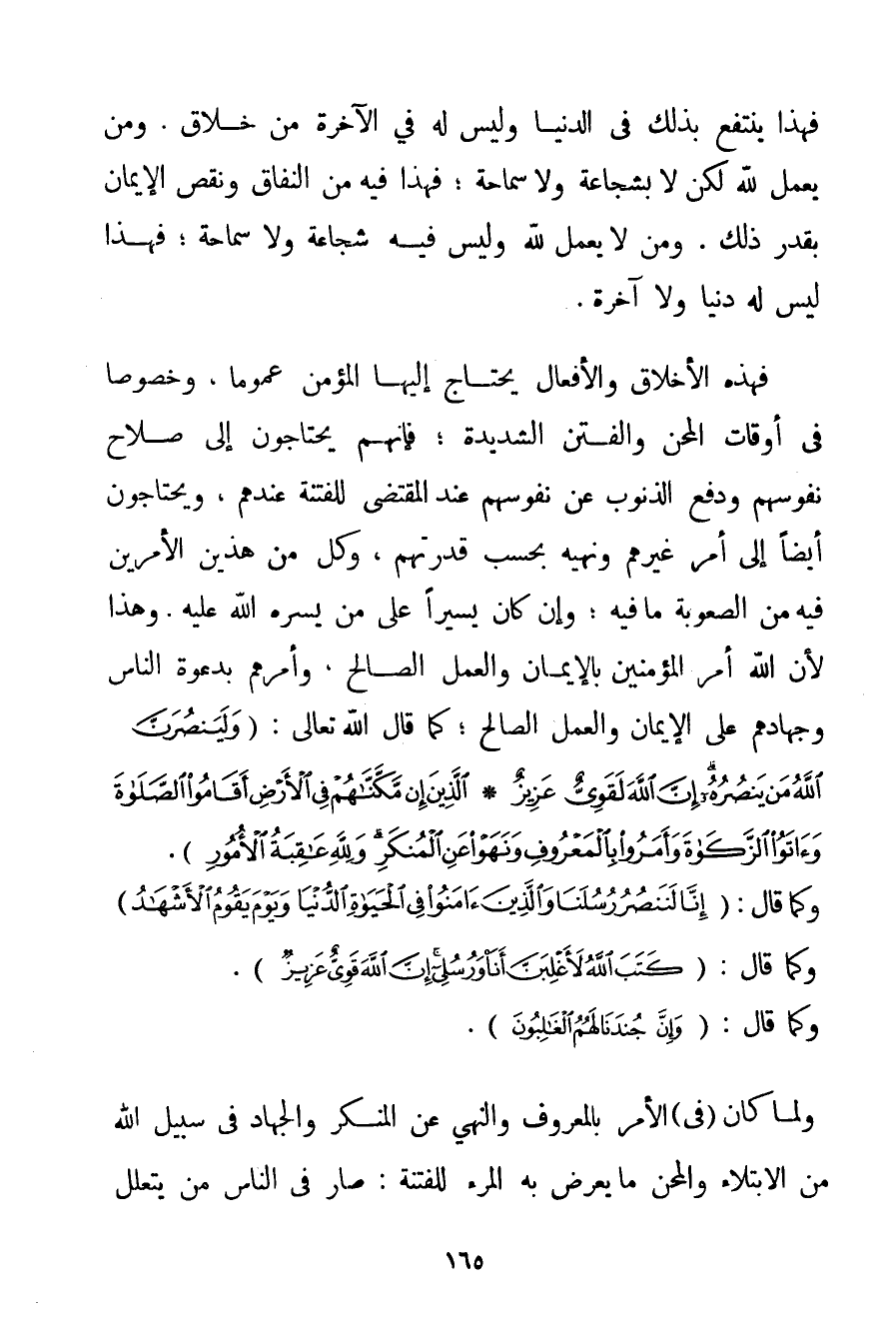 فَهَذَا يَنْتَفِعُ بِذَلِكَ فِي الدُّنْيَا وَلَيْسَ لَهُ فِي الْآخِرَةِ مِنْ خَلَاقٍ. وَمَنْ يَعْمَلْ لِلَّهِ لَكِنْ لَا بِشَجَاعَةِ وَلَا سَمَاحَةٍ؛ فَهَذَا فِيهِ مِنْ النِّفَاقِ وَنَقْصِ الْإِيمَانِ بِقَدْرِ ذَلِكَ. وَمَنْ لَا يَعْمَلْ لِلَّهِ وَلَيْسَ فِيهِ شَجَاعَةٌ وَلَا سَمَاحَةٌ؛ فَهَذَا لَيْسَ لَهُ دُنْيَا وَلَا آخِرَةٌ. فَهَذِهِ الْأَخْلَاقُ وَالْأَفْعَالُ يَحْتَاجُ إلَيْهَا الْمُؤْمِنُ عُمُومًا وَخُصُوصًا فِي أَوْقَاتِ الْمِحَنِ وَالْفِتَنِ الشَّدِيدَةِ؛ فَإِنَّهُمْ يَحْتَاجُونَ إلَى صَلَاحِ نُفُوسِهِمْ وَدَفْعِ الذُّنُوبِ عَنْ نُفُوسِهِمْ عِنْدَ الْمُقْتَضِي لِلْفِتْنَةِ عِنْدَهُمْ وَيَحْتَاجُونَ أَيْضًا إلَى أَمْرِ غَيْرِهِمْ وَنَهْيِهِ بِحَسَبِ قُدْرَتِهِمْ وَكُلٌّ مِنْ هَذَيْنِ الْأَمْرَيْنِ فِيهِ مِنْ الصُّعُوبَةِ مَا فِيهِ؛ وَإِنْ كَانَ يَسِيرًا عَلَى مَنْ يَسَّرَهُ اللَّهُ عَلَيْهِ. وَهَذَا لِأَنَّ اللَّهَ أَمَرَ الْمُؤْمِنِينَ بِالْإِيمَانِ وَالْعَمَلِ الصَّالِحِ وَأَمَرَهُمْ بِدَعْوَةِ النَّاسِ وَجِهَادِهِمْ عَلَى الْإِيمَانِ وَالْعَمَلِ الصَّالِحِ؛ كَمَا قَالَ اللَّهُ تَعَالَى: {وَلَيَنْصُرَنَّ اللَّهُ مَنْ يَنْصُرُهُ إنَّ اللَّهَ لَقَوِيٌّ عَزِيزٌ} {الَّذِينَ إنْ مَكَّنَّاهُمْ فِي الْأَرْضِ أَقَامُوا الصَّلَاةَ وَآتَوُا الزَّكَاةَ وَأَمَرُوا بِالْمَعْرُوفِ وَنَهَوْا عَنِ الْمُنْكَرِ وَلِلَّهِ عَاقِبَةُ الْأُمُورِ} . وَكَمَا قَالَ: {إنَّا لَنَنْصُرُ رُسُلَنَا وَالَّذِينَ آمَنُوا فِي الْحَيَاةِ الدُّنْيَا وَيَوْمَ يَقُومُ الْأَشْهَادُ} وَكَمَا قَالَ: {كَتَبَ اللَّهُ لَأَغْلِبَنَّ أَنَا وَرُسُلِي إنَّ اللَّهَ قَوِيٌّ عَزِيزٌ} . وَكَمَا قَالَ: {وَإِنَّ جُنْدَنَا لَهُمُ الْغَالِبُونَ} .