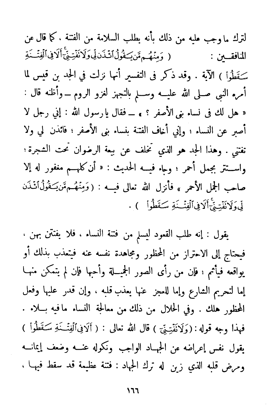 لِتَرْكِ مَا وَجَبَ عَلَيْهِ مِنْ ذَلِكَ بِأَنَّهُ يَطْلُبُ السَّلَامَةَ مِنْ الْفِتْنَةِ كَمَا قَالَ عَنْ الْمُنَافِقِينَ: {وَمِنْهُمْ مَنْ يَقُولُ ائْذَنْ لِي وَلَا تَفْتِنِّي أَلَا فِي الْفِتْنَةِ سَقَطُوا} الْآيَةَ. وَقَدْ ذَكَرَ فِي التَّفْسِيرِ أَنَّهَا نَزَلَتْ فِي {الْجَدِّ بْنِ قَيْسٍ لَمَّا أَمَرَهُ النَّبِيُّ صَلَّى اللَّهُ عَلَيْهِ وَسَلَّمَ بِالتَّجَهُّزِ لِغَزْوِ الرُّومِ - وَأَظُنُّهُ قَالَ: هَلْ لَك فِي نِسَاءِ بَنِي الْأَصْفَرِ؟ - فَقَالَ يَا رَسُولَ اللَّهِ: إنِّي رَجُلٌ لَا أَصْبِرُ عَنْ النِّسَاءِ؛ وَإِنِّي أَخَافُ الْفِتْنَةَ بِنِسَاءِ بَنِي الْأَصْفَرِ. فائذن لِي وَلَا تَفْتِنِّي} . وَهَذَا الْجَدُّ هُوَ الَّذِي تَخَلَّفَ عَنْ بَيْعَةِ الرِّضْوَانِ تَحْتَ الشَّجَرَةِ؛ وَاسْتَتَرَ بِجَمَلِ أَحْمَرَ؛ وَجَاءَ فِيهِ الْحَدِيثُ: {أَنَّ كُلَّهُمْ مَغْفُورٌ لَهُ إلَّا صَاحِبَ الْجَمَلِ الْأَحْمَرِ فَأَنْزَلَ اللَّهُ تَعَالَى فِيهِ: {وَمِنْهُمْ مَنْ يَقُولُ ائْذَنْ لِي وَلَا تَفْتِنِّي أَلَا فِي الْفِتْنَةِ سَقَطُوا} } . يَقُولُ: إنَّهُ طَلَبَ الْقُعُودَ لِيَسْلَمَ مِنْ فِتْنَةِ النِّسَاءِ فَلَا يَفْتَتِنُ بِهِنَّ فَيَحْتَاجُ إلَى الِاحْتِرَازِ مِنْ الْمَحْظُورِ وَمُجَاهَدَةِ نَفْسِهِ عَنْهُ فَيَتَعَذَّبُ بِذَلِكَ أَوْ يُوَاقِعُهُ فَيَأْثَمُ؛ فَإِنَّ مَنْ رَأَى الصُّوَرَ الْجَمِيلَةَ وَأَحَبَّهَا فَإِنْ لَمْ يَتَمَكَّنْ مِنْهَا إمَّا لِتَحْرِيمِ الشَّارِعِ وَإِمَّا لِلْعَجْزِ عَنْهَا يُعَذِّبُ قَلْبَهُ وَإِنْ قَدَرَ عَلَيْهَا وَفَعَلَ الْمَحْظُورَ هَلَكَ. وَفِي الْحَلَالِ مِنْ ذَلِكَ مِنْ مُعَالَجَةِ النِّسَاءِ مَا فِيهِ بَلَاءٌ. فَهَذَا وَجْهُ قَوْلِهِ: {وَلَا تَفْتِنِّي} قَالَ اللَّهُ تَعَالَى: {أَلَا فِي الْفِتْنَةِ سَقَطُوا} يَقُولُ نَفْسُ إعْرَاضِهِ عَنْ الْجِهَادِ الْوَاجِبِ وَنُكُولِهِ عَنْهُ وَضَعْفِ إيمَانِهِ وَمَرَضِ قَلْبِهِ الَّذِي زَيَّنَ لَهُ تَرْكَ الْجِهَادِ: فِتْنَةٌ عَظِيمَةٌ قَدْ سَقَطَ فِيهَا