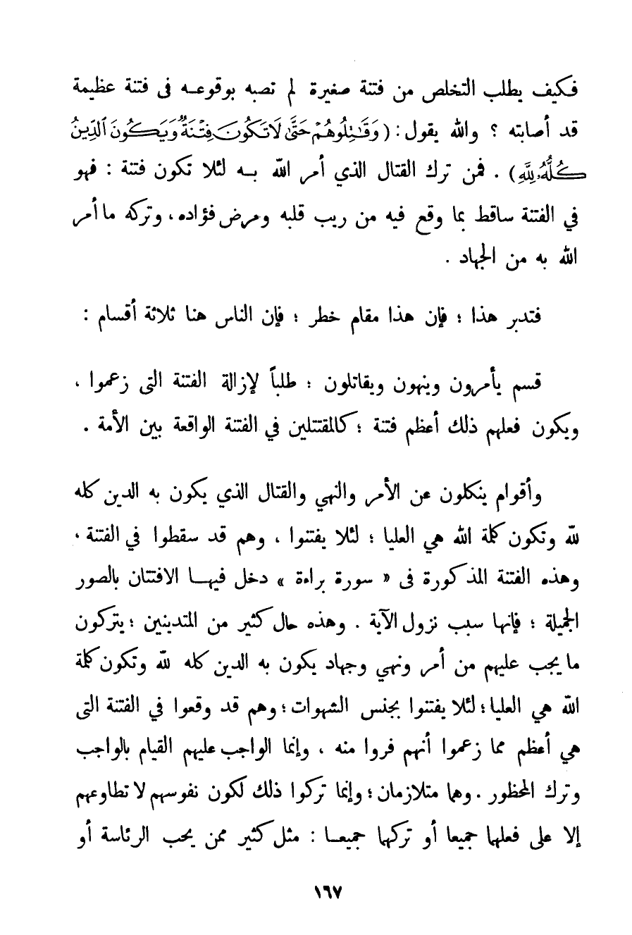 فَكَيْفَ يَطْلُبُ التَّخَلُّصَ مِنْ فِتْنَةٍ صَغِيرَةٍ لَمْ تُصِبْهُ بِوُقُوعِهِ فِي فِتْنَةٍ عَظِيمَةٍ قَدْ أَصَابَتْهُ؟ وَاَللَّهُ يَقُولُ: {وَقَاتِلُوهُمْ حَتَّى لَا تَكُونَ فِتْنَةٌ وَيَكُونَ الدِّينُ كُلُّهُ لِلَّهِ} . فَمَنْ تَرَكَ الْقِتَالَ الَّذِي أَمَرَ اللَّهُ بِهِ لِئَلَّا تَكُونَ فِتْنَةٌ: فَهُوَ فِي الْفِتْنَةِ سَاقِطٌ بِمَا وَقَعَ فِيهِ مِنْ رَيْبِ قَلْبِهِ وَمَرَضِ فُؤَادِهِ وَتَرْكِهِ مَا أَمَرَ اللَّهُ بِهِ مِنْ الْجِهَادِ. فَتَدَبَّرْ هَذَا؛ فَإِنَّ هَذَا مَقَامٌ خَطَرٌ؛ فَإِنَّ النَّاسَ هُنَا ثَلَاثَةُ أَقْسَامٍ: قِسْمٌ يَأْمُرُونَ وَيَنْهَوْنَ وَيُقَاتِلُونَ؛ طَلَبًا لِإِزَالَةِ الْفِتْنَةِ الَّتِي زَعَمُوا وَيَكُونُ فِعْلُهُمْ ذَلِكَ أَعْظَمَ فِتْنَةً؛ كَالْمُقْتَتِلِينَ فِي الْفِتْنَةِ الْوَاقِعَةِ بَيْنَ الْأُمَّةِ. وَأَقْوَامٌ يَنْكُلُونَ عَنْ الْأَمْرِ وَالنَّهْيِ وَالْقِتَالِ الَّذِي يَكُونُ بِهِ الدِّينُ كُلُّهُ لِلَّهِ وَتَكُونُ كَلِمَةُ اللَّهِ هِيَ الْعُلْيَا؛ لِئَلَّا يَفْتِنُوا وَهُمْ قَدْ سَقَطُوا فِي الْفِتْنَةِ وَهَذِهِ الْفِتْنَةُ الْمَذْكُورَةُ فِي " سُورَةِ بَرَاءَةَ " دَخَلَ فِيهَا الِافْتِتَانُ بِالصُّوَرِ الْجَمِيلَةِ؛ فَإِنَّهَا سَبَبُ نُزُولِ الْآيَةِ. وَهَذِهِ حَالُ كَثِيرٍ مِنْ الْمُتَدَيِّنِينَ؛ يَتْرُكُونَ مَا يَجِبُ عَلَيْهِمْ مِنْ أَمْرٍ وَنَهْيٍ وَجِهَادٍ يَكُونُ بِهِ الدِّينُ كُلُّهُ لِلَّهِ وَتَكُونُ كَلِمَةُ اللَّهِ هِيَ الْعُلْيَا؛ لِئَلَّا يَفْتِنُوا بِجِنْسِ الشَّهَوَاتِ؛ وَهُمْ قَدْ وَقَعُوا فِي الْفِتْنَةِ الَّتِي هِيَ أَعْظَمُ مِمَّا زَعَمُوا أَنَّهُمْ فَرُّوا مِنْهُ وَإِنَّمَا الْوَاجِبُ عَلَيْهِمْ الْقِيَامُ بِالْوَاجِبِ وَتَرْكُ الْمَحْظُورِ. وَهُمَا مُتَلَازِمَانِ؛ وَإِنَّمَا تَرَكُوا ذَلِكَ لِكَوْنِ نُفُوسِهِمْ لَا تُطَاوِعُهُمْ إلَّا عَلَى فِعْلِهِمَا جَمِيعًا أَوْ تَرْكِهِمَا جَمِيعًا: مِثْلَ كَثِيرٍ مِمَّنْ يُحِبُّ الرِّئَاسَةَ أَوْ