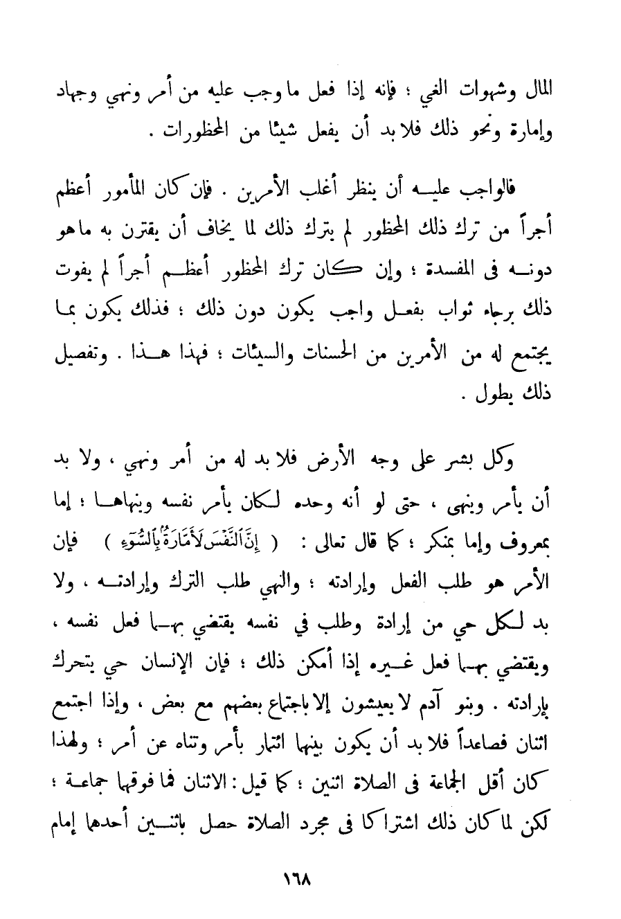 وَكُلُّ بَشَرٍ عَلَى وَجْهِ الْأَرْضِ فَلَا بُدَّ لَهُ مِنْ أَمْرٍ وَنَهْيٍ وَلَا بُدَّ أَنْ يَأْمُرَ وَيَنْهَى حَتَّى لَوْ أَنَّهُ وَحْدَهُ لَكَانَ يَأْمُرُ نَفْسَهُ وَيَنْهَاهَا؛ إمَّا بِمَعْرُوفِ وَإِمَّا بِمُنْكَرٍ؛ كَمَا قَالَ تَعَالَى: {إنَّ النَّفْسَ لَأَمَّارَةٌ بِالسُّوءِ} فَإِنَّ الْأَمْرَ هُوَ طَلَبُ الْفِعْلِ وَإِرَادَتِهِ؛ وَالنَّهْيُ طَلَبُ التَّرْكِ وَإِرَادَتِهِ وَلَا بُدَّ لِكُلِّ حَيٍّ مِنْ إرَادَةٍ وَطَلَبٍ فِي نَفْسِهِ يَقْتَضِي بِهِمَا فِعْلُ نَفْسِهِ وَيَقْتَضِي بِهِمَا فِعْلُ غَيْرِهِ إذَا أَمْكَنَ ذَلِكَ؛ فَإِنَّ الْإِنْسَانَ حَيٌّ يَتَحَرَّكُ بِإِرَادَتِهِ. وَبَنُو آدَمَ لَا يَعِيشُونَ إلَّا بِاجْتِمَاعِ بَعْضِهِمْ مَعَ بَعْضٍ وَإِذَا اجْتَمَعَ اثْنَانِ فَصَاعِدًا فَلَا بُدَّ أَنْ يَكُونَ بَيْنَهُمَا ائْتِمَارٌ بِأَمْرِ وَتَنَاهٍ عَنْ أَمْرٍ؛ وَلِهَذَا كَانَ أَقَلُّ الْجَمَاعَةِ فِي الصَّلَاةِ اثْنَيْنِ؛ كَمَا قِيلَ: الِاثْنَانِ فَمَا فَوْقَهُمَا جَمَاعَةٌ؛ لَكِنْ لَمَّا كَانَ ذَلِكَ اشْتِرَاكًا فِي مُجَرَّدِ الصَّلَاةِ حَصَلَ بِاثْنَيْنِ أَحَدُهُمَا إمَامٌ