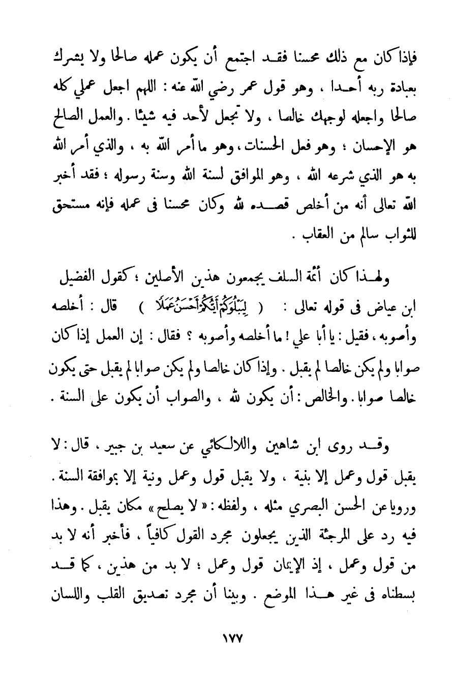 فَإِذَا كَانَ مَعَ ذَلِكَ مُحْسِنًا فَقَدْ اجْتَمَعَ أَنْ يَكُونَ عَمَلُهُ صَالِحًا وَلَا يُشْرِكُ بِعِبَادَةِ رَبِّهِ أَحَدًا وَهُوَ قَوْلُ عُمَرَ رَضِيَ اللَّهُ عَنْهُ اللَّهُمَّ اجْعَلْ عَمَلِي كُلَّهُ صَالِحًا وَاجْعَلْهُ لِوَجْهِك خَالِصًا وَلَا تَجْعَلْ لِأَحَدِ فِيهِ شَيْئًا. وَالْعَمَلُ الصَّالِحُ هُوَ الْإِحْسَانُ: وَهُوَ فِعْلُ الْحَسَنَاتِ وَهُوَ مَا أَمَرَ اللَّهُ بِهِ وَاَلَّذِي أَمَرَ اللَّهُ بِهِ هُوَ الَّذِي شَرَعَهُ اللَّهُ وَهُوَ الْمُوَافِقُ لِسُنَّةِ اللَّهِ وَسُنَّةِ رَسُولِهِ؛ فَقَدْ أَخْبَرَ اللَّهُ تَعَالَى أَنَّهُ مَنْ أَخْلَصَ قَصْدَهُ لِلَّهِ وَكَانَ مُحْسِنًا فِي عَمَلِهِ فَإِنَّهُ مُسْتَحِقٌّ لِلثَّوَابِ سَالِمٌ مِنْ الْعِقَابِ. وَلِهَذَا كَانَ أَئِمَّةُ السَّلَفِ يَجْمَعُونَ هَذَيْنِ الْأَصْلَيْنِ؛ كَقَوْلِ الْفُضَيْل ابْنِ عِيَاضٍ فِي قَوْله تَعَالَى {لِيَبْلُوَكُمْ أَيُّكُمْ أَحْسَنُ عَمَلًا} قَالَ: أَخْلَصُهُ وَأَصْوَبُهُ فَقِيلَ: يَا أَبَا عَلِيٍّ مَا أَخْلَصُهُ وَأَصْوَبُهُ؟ فَقَالَ: إنَّ الْعَمَلَ إذَا كَانَ صَوَابًا وَلَمْ يَكُنْ خَالِصًا لَمْ يُقْبَلْ. وَإِذَا كَانَ خَالِصًا وَلَمْ يَكُنْ صَوَابًا لَمْ يُقْبَلْ حَتَّى يَكُونَ خَالِصًا صَوَابًا. وَالْخَالِصُ: أَنْ يَكُونَ لِلَّهِ وَالصَّوَابُ أَنْ يَكُونَ عَلَى السُّنَّةِ. وَقَدْ رَوَى ابْنُ شَاهِينَ واللالكائي عَنْ سَعِيدِ بْنِ جُبَيْرٍ قَالَ: لَا يُقْبَلُ قَوْلٌ وَعَمَلٌ إلَّا بِنِيَّةِ وَلَا يُقْبَلُ قَوْلٌ وَعَمَلٌ وَنِيَّةٌ إلَّا بِمُوَافَقَةِ السُّنَّةِ. وَرَوَيَا عَنْ الْحَسَنِ الْبَصْرِيِّ مِثْلَهُ وَلَفْظُهُ: " لَا يَصْلُحُ " مَكَانَ يُقْبَلُ. وَهَذَا فِيهِ رَدٌّ عَلَى الْمُرْجِئَةِ الَّذِينَ يَجْعَلُونَ مُجَرَّدَ الْقَوْلِ كَافِيًا فَأَخْبَرَ أَنَّهُ لَا بُدَّ مِنْ قَوْلٍ وَعَمَلٍ إذْ الْإِيمَانُ قَوْلٌ وَعَمَلٍ؛ لَا بُدَّ مِنْ هَذَيْنِ كَمَا قَدْ بَسَطْنَاهُ فِي غَيْرِ هَذَا الْمَوْضِعِ. وَبَيَّنَّا أَنَّ مُجَرَّدَ تَصْدِيقِ الْقَلْبِ وَاللِّسَانِ