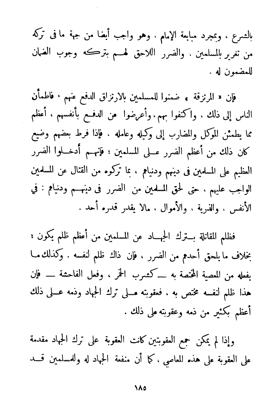 بِالشَّرْعِ وَبِمُجَرَّدِ مُبَايَعَةِ الْإِمَامِ وَهُوَ وَاجِبٌ أَيْضًا مِنْ جِهَةِ مَا فِي تَرْكِهِ مِنْ تَغْرِيرِ الْمُسْلِمِينَ وَالضَّرَرُ اللَّاحِقُ لَهُمْ بِتَرْكِهِ وُجُوبُ الضَّمَانِ لِلْمَضْمُونِ لَهُ. فَإِنَّ " الْمُرْتَزِقَةَ " ضَمِنُوا لِلْمُسْلِمِينَ بِالِارْتِزَاقِ الدَّفْعَ عَنْهُمْ فَاطْمَأَنَّ النَّاسُ إلَى ذَلِكَ وَاكْتَفَوْا بِهِمْ وَأَعْرَضُوا عَنْ الدَّفْعِ بِأَنْفُسِهِمْ، أَعْظَمُ مِمَّا يَطْمَئِنُّ الْمُوَكَّلُ وَالْمُضَارِبُ إلَى وَكِيلِهِ وَعَامِلِهِ فَإِذَا فَرَّطَ بَعْضُهُمْ وَضَيَّعَ كَانَ ذَلِكَ مِنْ أَعْظَمِ الضَّرَرِ عَلَى الْمُسْلِمِينَ؛ فَإِنَّهُمْ أَدْخَلُوا الضَّرَرَ الْعَظِيمَ عَلَى الْمُسْلِمِينَ فِي دِينِهِمْ وَدُنْيَاهُمْ بِمَا تَرَكُوهُ مِنْ الْقِتَالِ عَنْ الْمُسْلِمِينَ الْوَاجِبِ عَلَيْهِمْ حَتَّى لَحِقَ الْمُسْلِمِينَ مِنْ الضَّرَرِ فِي دِينِهِمْ وَدُنْيَاهُمْ: فِي الْأَنْفُسِ وَالذُّرِّيَّةِ وَالْأَمْوَالِ مَا لَا يُقَدِّرُ قَدْرَهُ أَحَدٌ. فَظُلْمُ الْمُقَاتِلَةِ بِتَرْكِ الْجِهَادِ عَنْ الْمُسْلِمِينَ مِنْ أَعْظَمِ ظُلْمٍ يَكُونُ؛ بِخِلَافِ مَا يَلْحَقُ أَحَدُهُمْ مِنْ الضَّرَرِ فَإِنَّ ذَاكَ ظُلْمٌ لِنَفْسِهِ. وَكَذَلِكَ مَا يَفْعَلُهُ مِنْ الْمَعْصِيَةِ الْمُخْتَصَّةِ بِهِ - كَشُرْبِ الْخَمْرِ وَفِعْلِ الْفَاحِشَةِ - فَإِنَّ هَذَا ظُلْمٌ لِنَفْسِهِ مُخْتَصٌّ بِهِ فَعُقُوبَتُهُ عَلَى تَرْكِ الْجِهَادِ وَذَمِّهِ عَلَى ذَلِكَ أَعْظَمُ بِكَثِيرِ مِنْ ذَمِّهِ وَعُقُوبَتِهِ عَلَى ذَلِكَ. وَإِذَا لَمْ يُمْكِنْ جَمْعُ الْعُقُوبَتَيْنِ كَانَتْ الْعُقُوبَةُ عَلَى تَرْكِ الْجِهَادِ مُقَدَّمَةٌ عَلَى الْعُقُوبَةِ عَلَى هَذِهِ الْمَعَاصِي كَمَا أَنَّ مَنْفَعَةَ الْجِهَادِ لَهُ وَلِلْمُسْلِمِينَ قَدْ