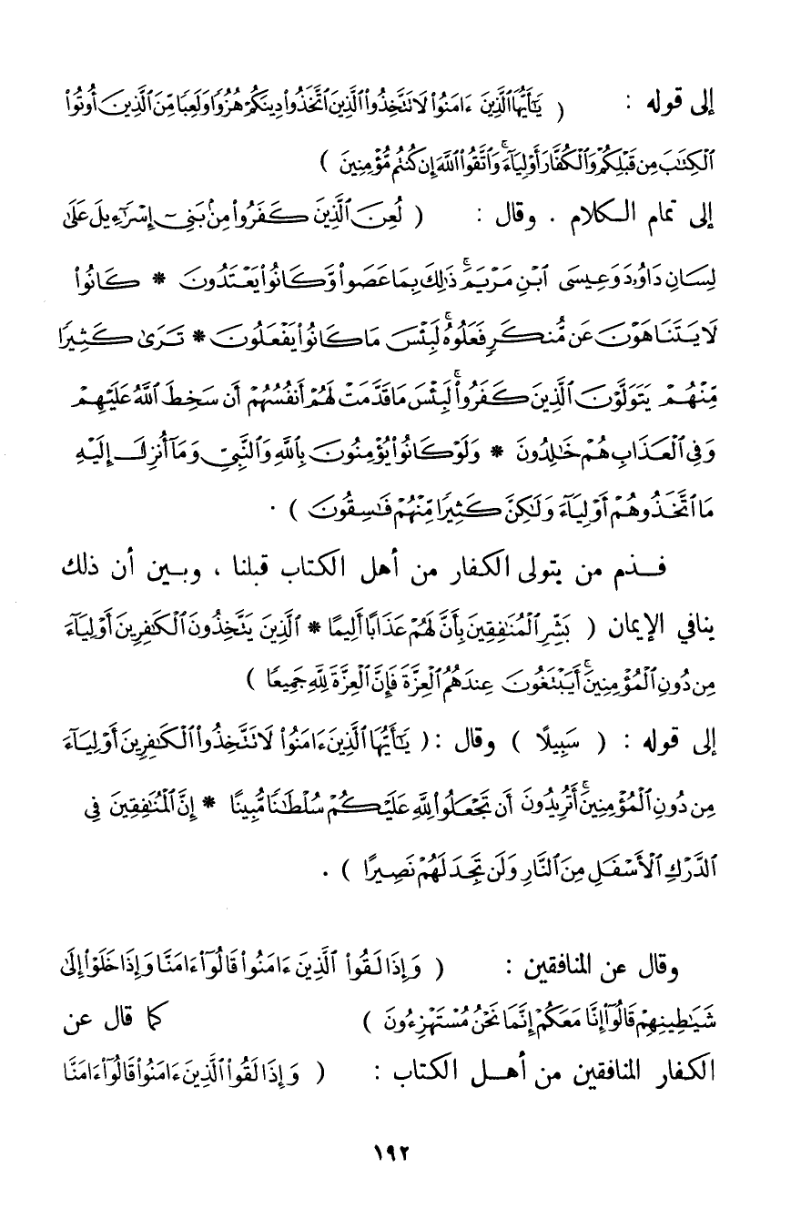 {يَا أَيُّهَا الَّذِينَ آمَنُوا لَا تَتَّخِذُوا الَّذِينَ اتَّخَذُوا دِينَكُمْ هُزُوًا وَلَعِبًا مِنَ الَّذِينَ أُوتُوا الْكِتَابَ مِنْ قَبْلِكُمْ وَالْكُفَّارَ أَوْلِيَاءَ وَاتَّقُوا اللَّهَ إنْ كُنْتُمْ مُؤْمِنِينَ} إلَى تَمَامِ الْكَلَامِ. وَقَالَ: {لُعِنَ الَّذِينَ كَفَرُوا مِنْ بَنِي إسْرَائِيلَ عَلَى لِسَانِ دَاوُدَ وَعِيسَى ابْنِ مَرْيَمَ ذَلِكَ بِمَا عَصَوْا وَكَانُوا يَعْتَدُونَ} {كَانُوا لَا يَتَنَاهَوْنَ عَنْ مُنْكَرٍ فَعَلُوهُ لَبِئْسَ مَا كَانُوا يَفْعَلُونَ} {تَرَى كَثِيرًا مِنْهُمْ يَتَوَلَّوْنَ الَّذِينَ كَفَرُوا لَبِئْسَ مَا قَدَّمَتْ لَهُمْ أَنْفُسُهُمْ أَنْ سَخِطَ اللَّهُ عَلَيْهِمْ وَفِي الْعَذَابِ هُمْ خَالِدُونَ} {وَلَوْ كَانُوا يُؤْمِنُونَ بِاللَّهِ وَالنَّبِيِّ وَمَا أُنْزِلَ إلَيْهِ مَا اتَّخَذُوهُمْ أَوْلِيَاءَ وَلَكِنَّ كَثِيرًا مِنْهُمْ فَاسِقُونَ} . فَذَمَّ مَنْ يَتَوَلَّى الْكُفَّارَ مِنْ أَهْلِ الْكِتَابِ قَبْلَنَا وَبَيَّنَ أَنَّ ذَلِكَ يُنَافِي الْإِيمَانَ {بَشِّرِ الْمُنَافِقِينَ بِأَنَّ لَهُمْ عَذَابًا أَلِيمًا} {الَّذِينَ يَتَّخِذُونَ الْكَافِرِينَ أَوْلِيَاءَ مِنْ دُونِ الْمُؤْمِنِينَ أَيَبْتَغُونَ عِنْدَهُمُ الْعِزَّةَ فَإِنَّ الْعِزَّةَ لِلَّهِ جَمِيعًا} إلَى قَوْلِهِ: {سَبِيلًا} وَقَالَ: {يَا أَيُّهَا الَّذِينَ آمَنُوا لَا تَتَّخِذُوا الْكَافِرِينَ أَوْلِيَاءَ مِنْ دُونِ الْمُؤْمِنِينَ أَتُرِيدُونَ أَنْ تَجْعَلُوا لِلَّهِ عَلَيْكُمْ سُلْطَانًا مُبِينًا} {إنَّ الْمُنَافِقِينَ فِي الدَّرْكِ الْأَسْفَلِ مِنَ النَّارِ وَلَنْ تَجِدَ لَهُمْ نَصِيرًا} . وَقَالَ عَنْ الْمُنَافِقِينَ: {وَإِذَا لَقُوا الَّذِينَ آمَنُوا قَالُوا آمَنَّا وَإِذَا خَلَوْا إلَى شَيَاطِينِهِمْ قَالُوا إنَّا مَعَكُمْ إنَّمَا نَحْنُ مُسْتَهْزِئُونَ} كَمَا قَالَ عَنْ الْكُفَّارِ الْمُنَافِقِينَ مِنْ أَهْلِ الْكِتَابِ: {وَإِذَا لَقُوا الَّذِينَ آمَنُوا قَالُوا
