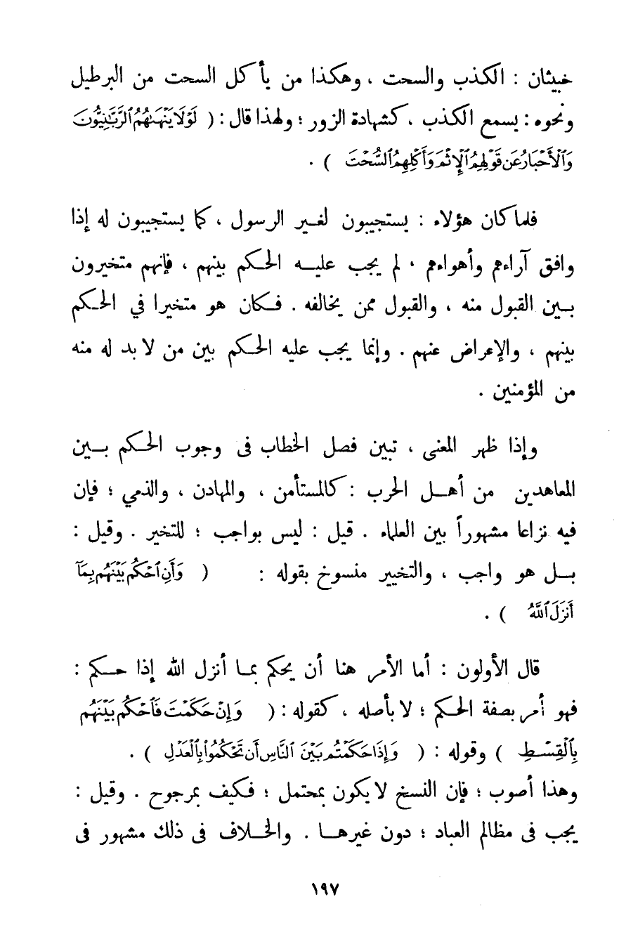 وَإِذَا ظَهَرَ الْمَعْنَى تَبَيَّنَ فَصْلُ الْخِطَابِ فِي وُجُوبِ الْحُكْمِ بَيْنَ الْمُعَاهِدِينَ مِنْ أَهْلِ الْحَرْبِ: كَالْمُسْتَأْمِنِ وَالْمُهَادِنِ وَالذِّمِّيِّ؛ فَإِنَّ فِيهِ نِزَاعًا مَشْهُورًا بَيْنَ الْعُلَمَاءِ. قِيلَ: لَيْسَ بِوَاجِبِ؛ لِلتَّخَيُّرِ. وَقِيلَ: بَلْ هُوَ وَاجِبٌ وَالتَّخْيِيرُ مَنْسُوخٌ بِقَوْلِهِ: {وَأَنِ احْكُمْ بَيْنَهُمْ بِمَا أَنْزَلَ اللَّهُ} . قَالَ الْأَوَّلُونَ: أَمَّا الْأَمْرُ هُنَا أَنْ يَحْكُمَ بِمَا أَنْزَلَ اللَّهُ إذَا حَكَمَ: فَهُوَ أَمْرٌ بِصِفَةِ الْحُكْمِ؛ لَا بِأَصْلِهِ كَقَوْلِهِ: {وَإِنْ حَكَمْتَ فَاحْكُمْ بَيْنَهُمْ بِالْقِسْطِ} وَقَوْلِهِ: {وَإِذَا حَكَمْتُمْ بَيْنَ النَّاسِ أَنْ تَحْكُمُوا بِالْعَدْلِ} . وَهَذَا أَصْوَبُ؛ فَإِنَّ النَّسْخَ لَا يَكُونُ بِمُحْتَمَلِ. فَكَيْفَ بِمَرْجُوحِ. وَقِيلَ: يَجِبُ فِي مَظَالِمِ الْعِبَادِ؛ دُونَ غَيْرِهَا. وَالْخِلَافُ فِي ذَلِكَ مَشْهُورٌ فِي